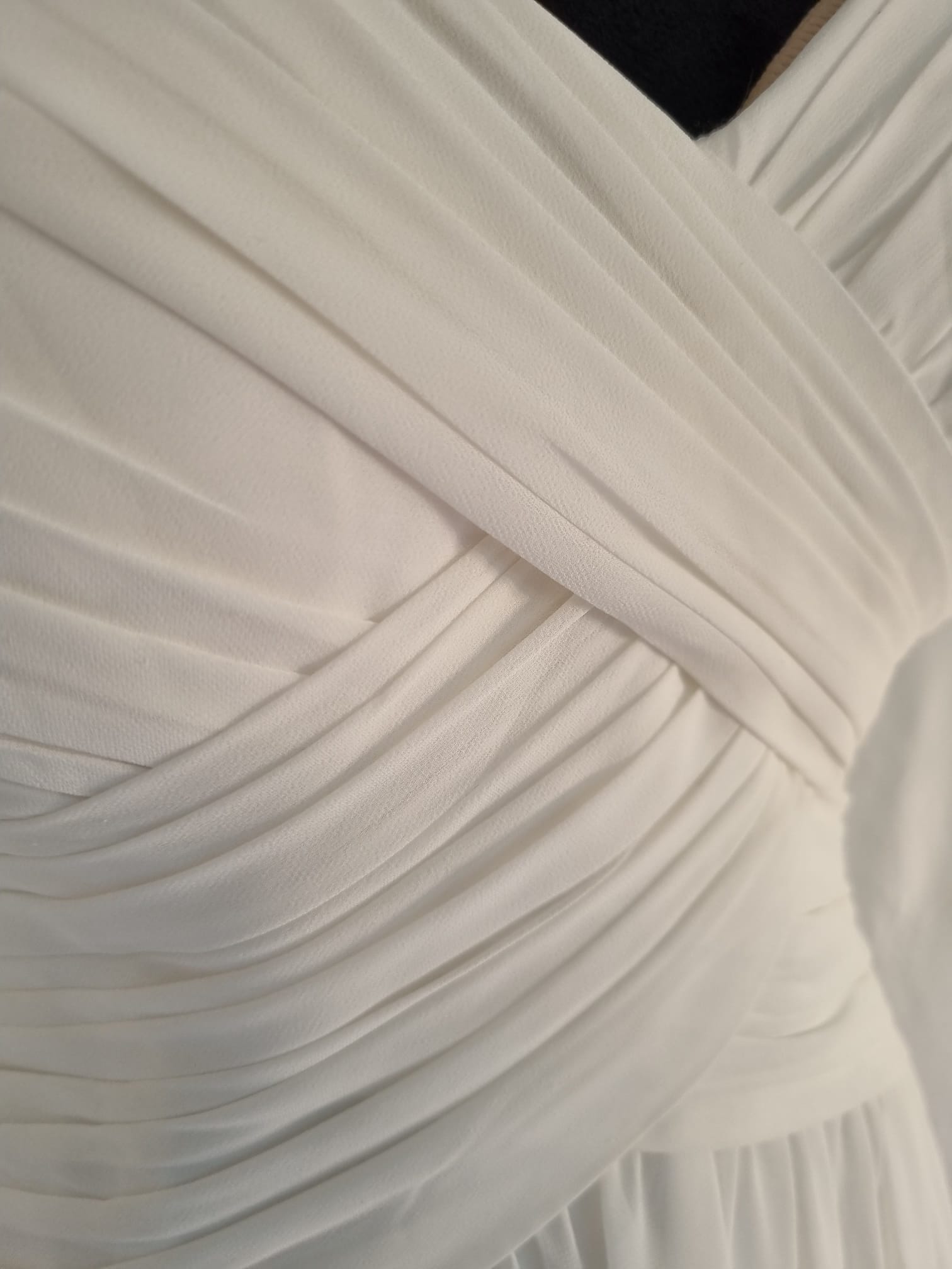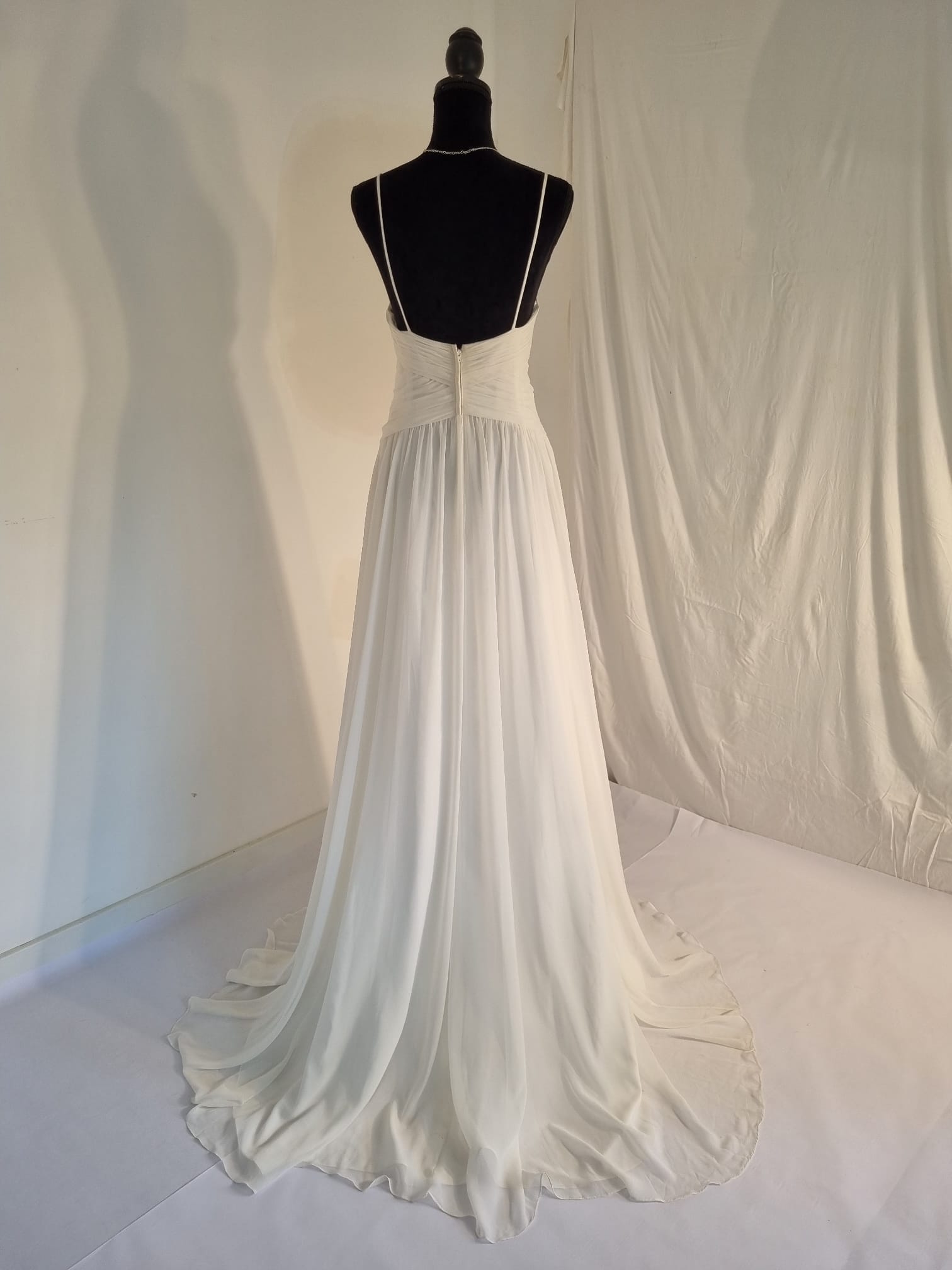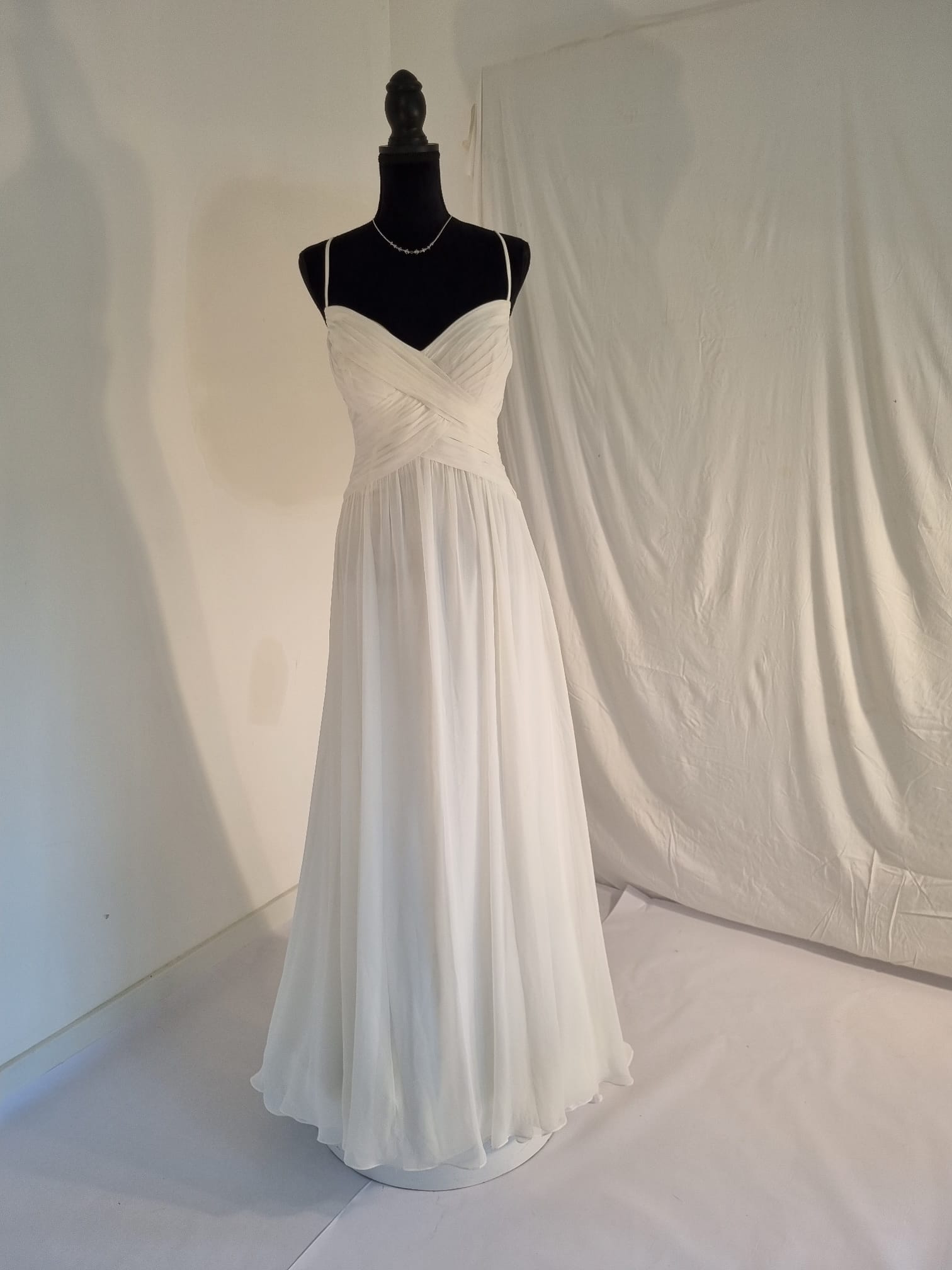 Gorgeous soft white A Line wedding dress with crossed pintucked bodice and cummerbund waist, invisible zip opening, delicate spaghetti straps with plunge cleavage, train and dipped back. A true light princess – for your formal ceremony or garden wedding- layers of soft organza creating a true soft A line skimming your curves in all the right places
