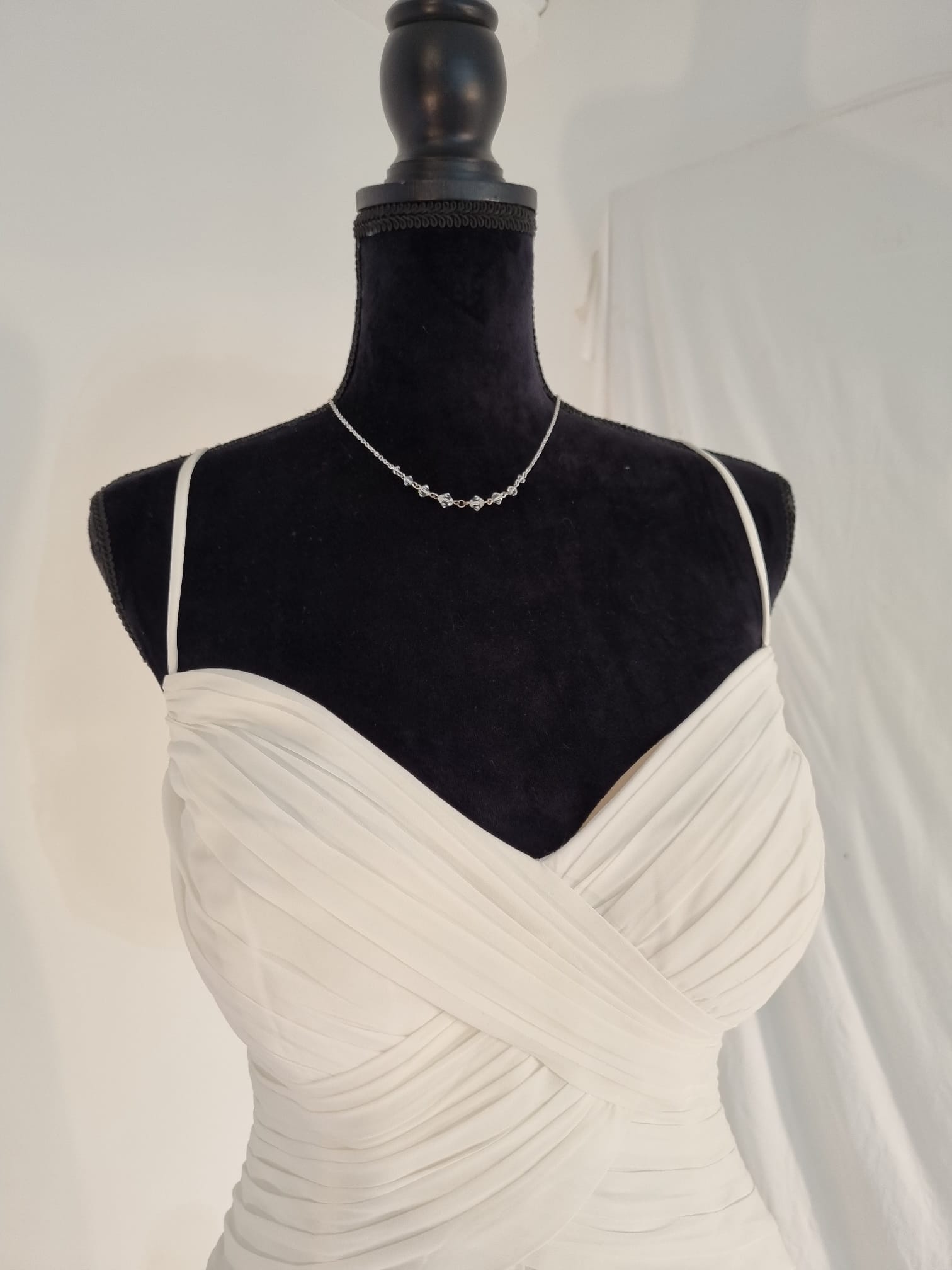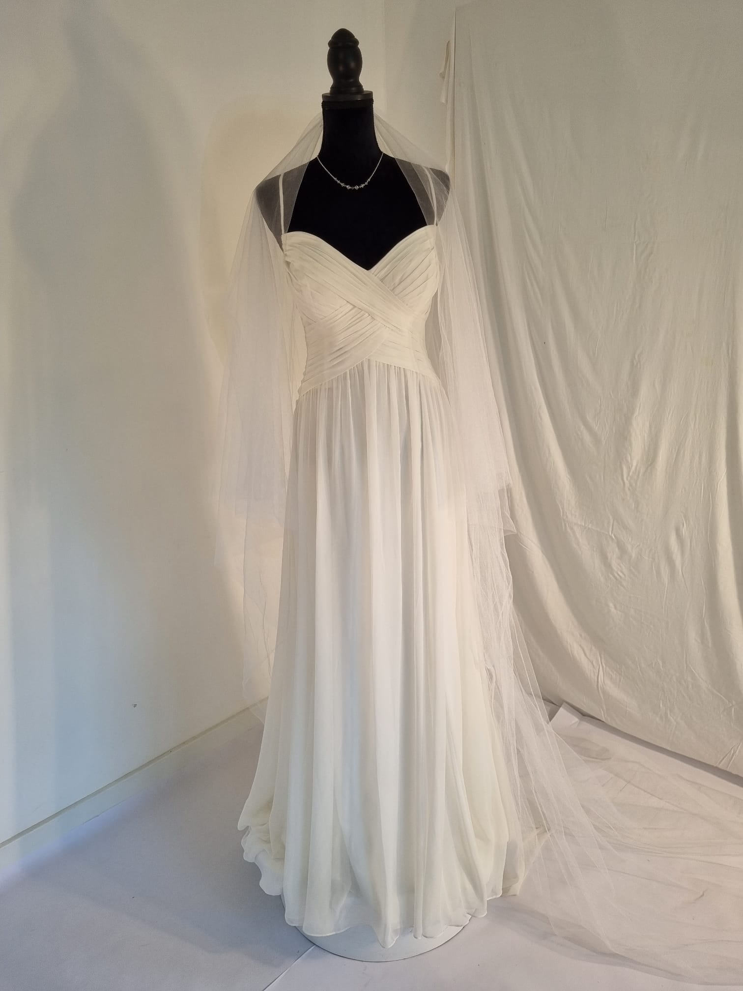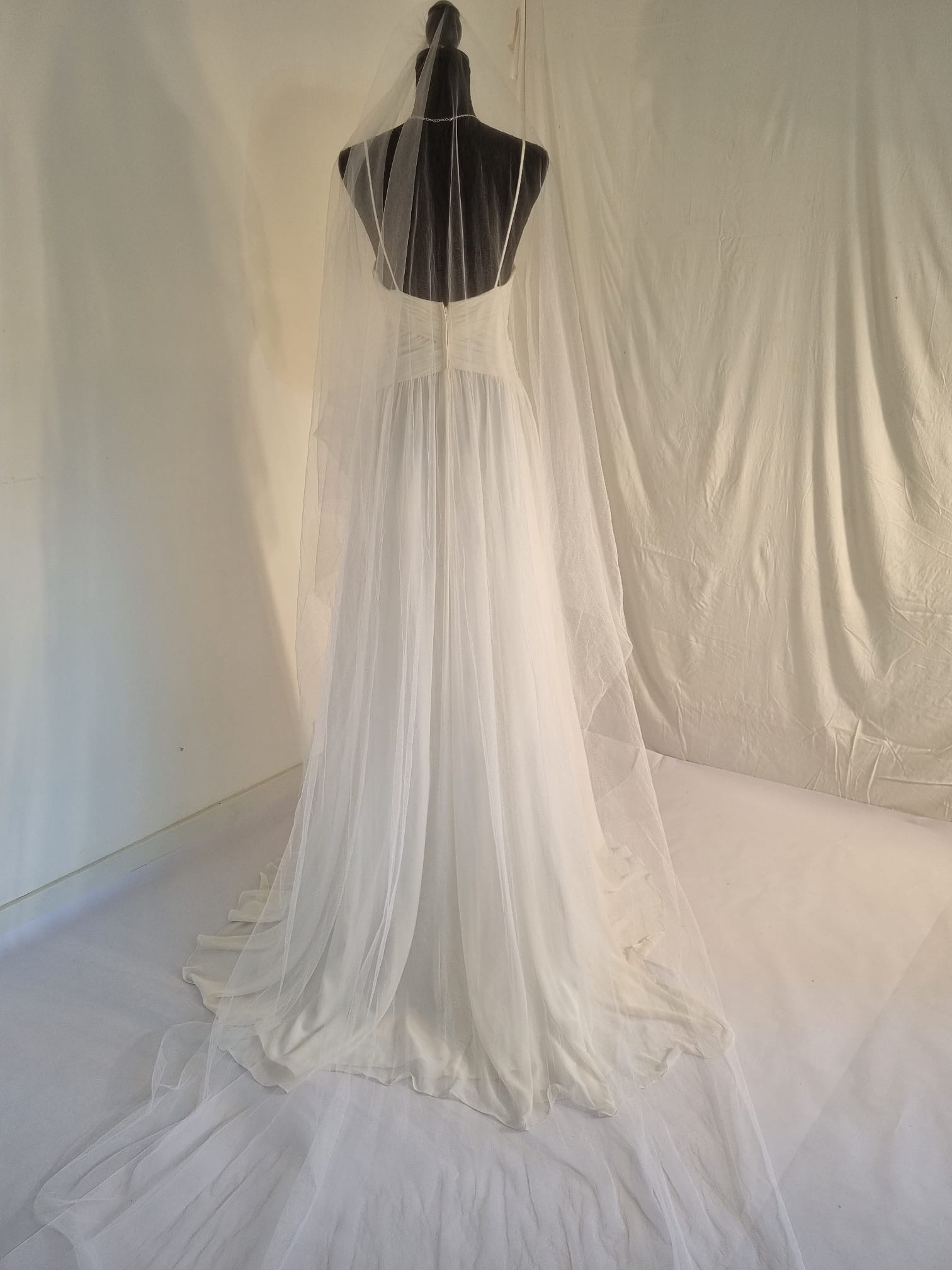Gorgeous soft white A Line wedding dress with crossed pintucked bodice and cummerbund waist, invisible zip opening, delicate spaghetti straps with plunge cleavage, train and dipped back. A true light princess – for your formal ceremony or garden wedding- layers of soft organza creating a true soft A line skimming your curves in all the right places