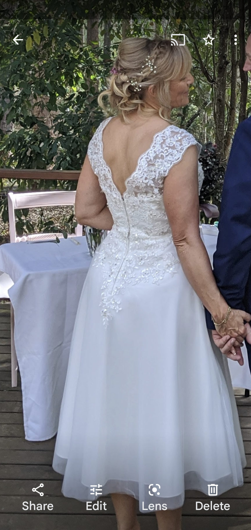 Beautiful shorter length wedding dress.