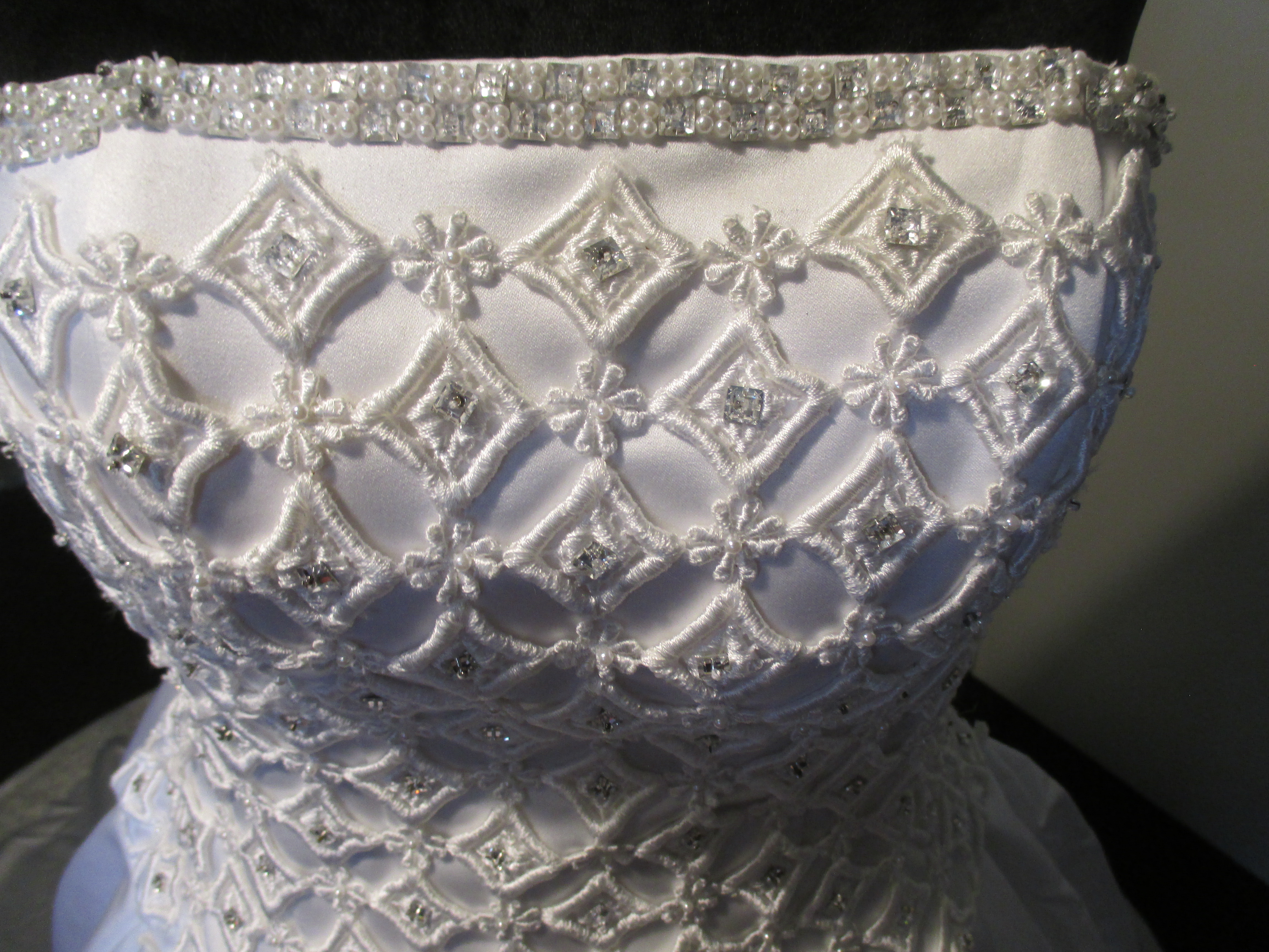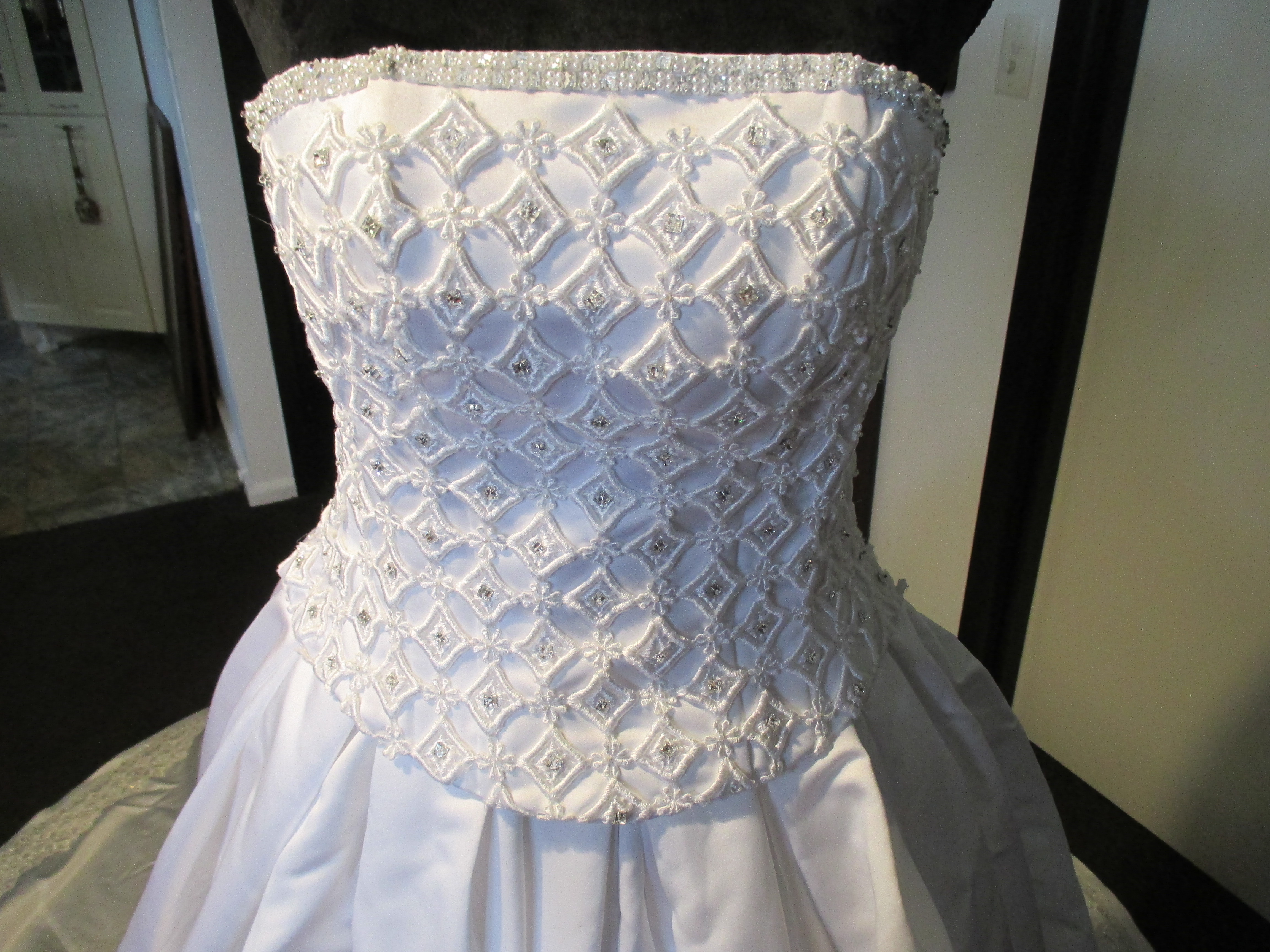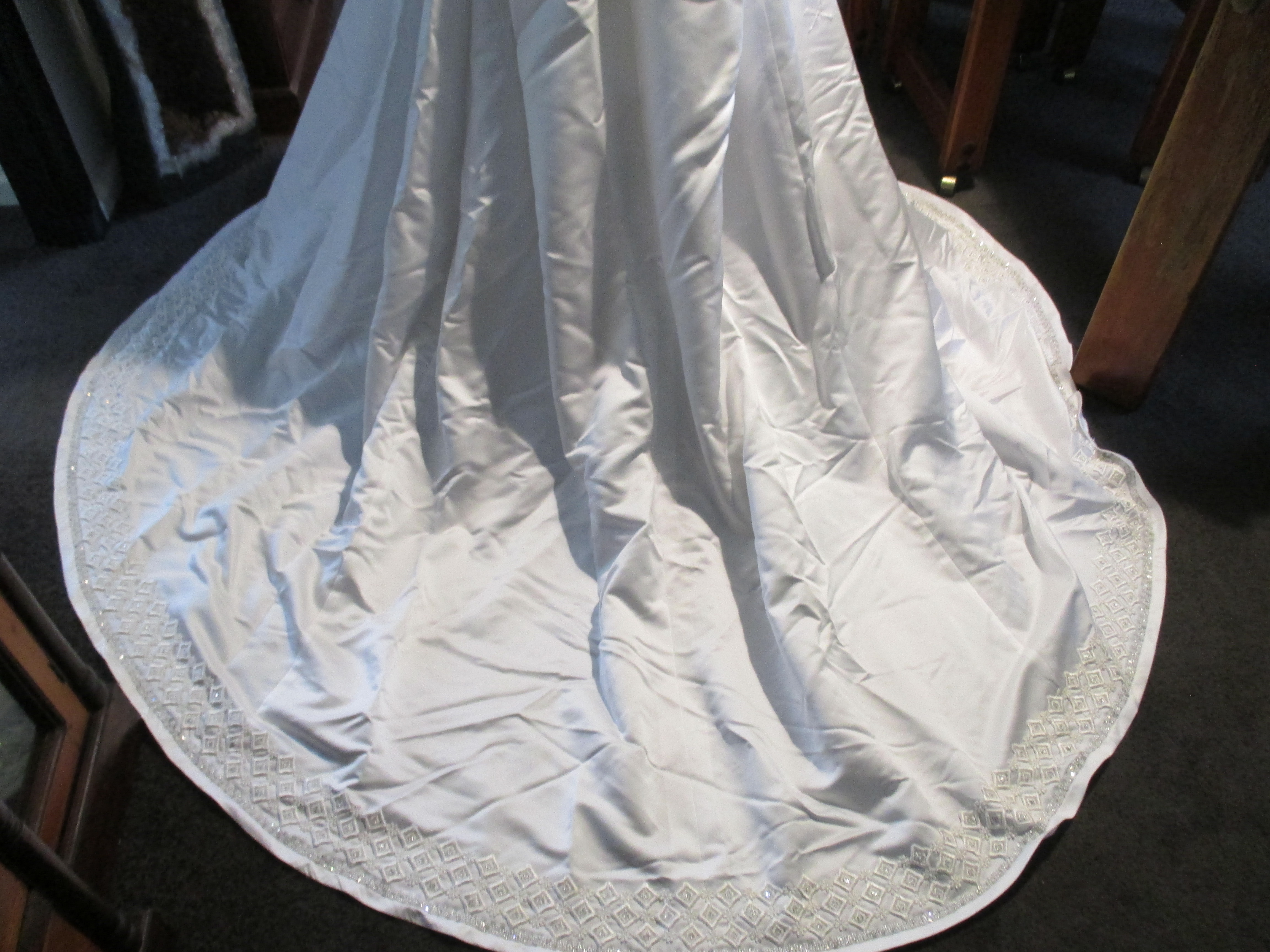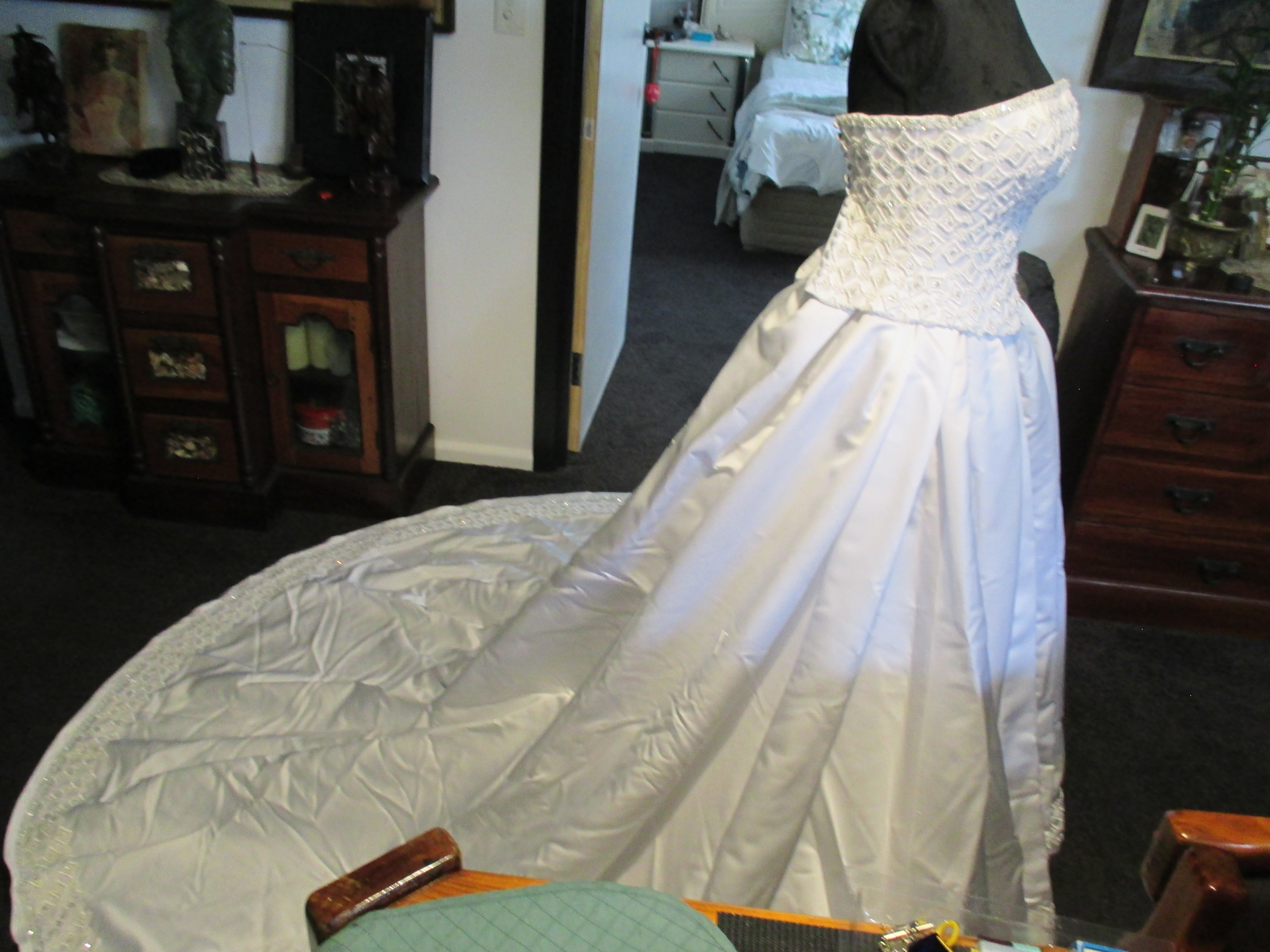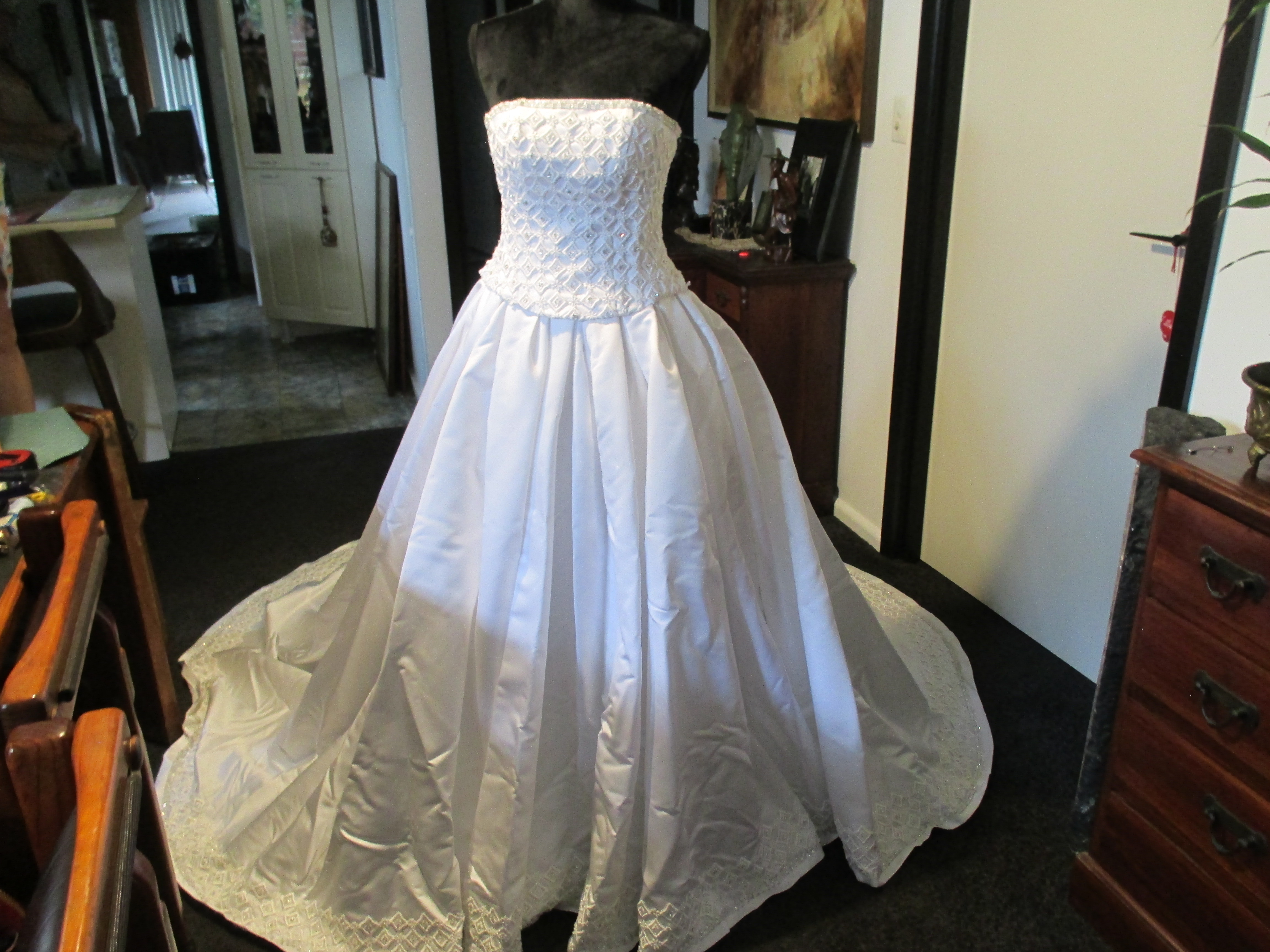 Heavily Beaded Snow White Satin Wedding Dress with matching Vail