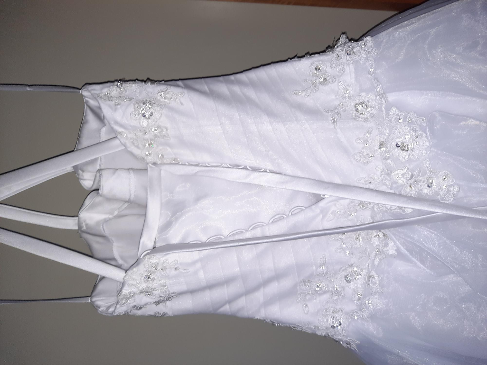 A Beautiful White Fitted Bodice with Sweetheart Neckline, Sequin Bodice, Organza Tule Skirt and Shoestring Straps.