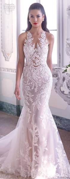 “Exquisite embellished lace over sheer and Organza create this beaded masterpiece. This sheath gown features a stunning illusion back with beading..”