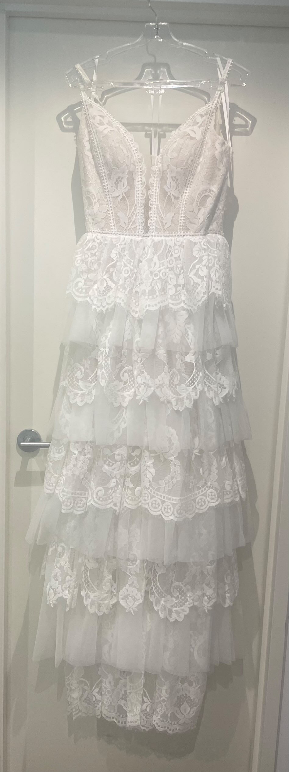 Size 10 Luv Bridal dress. Never worn or altered and tags still on. Gorgeous champagne underlay. Comes with an additional Swarovski Crystal belt that can be sewn on during alterations for extra detail.