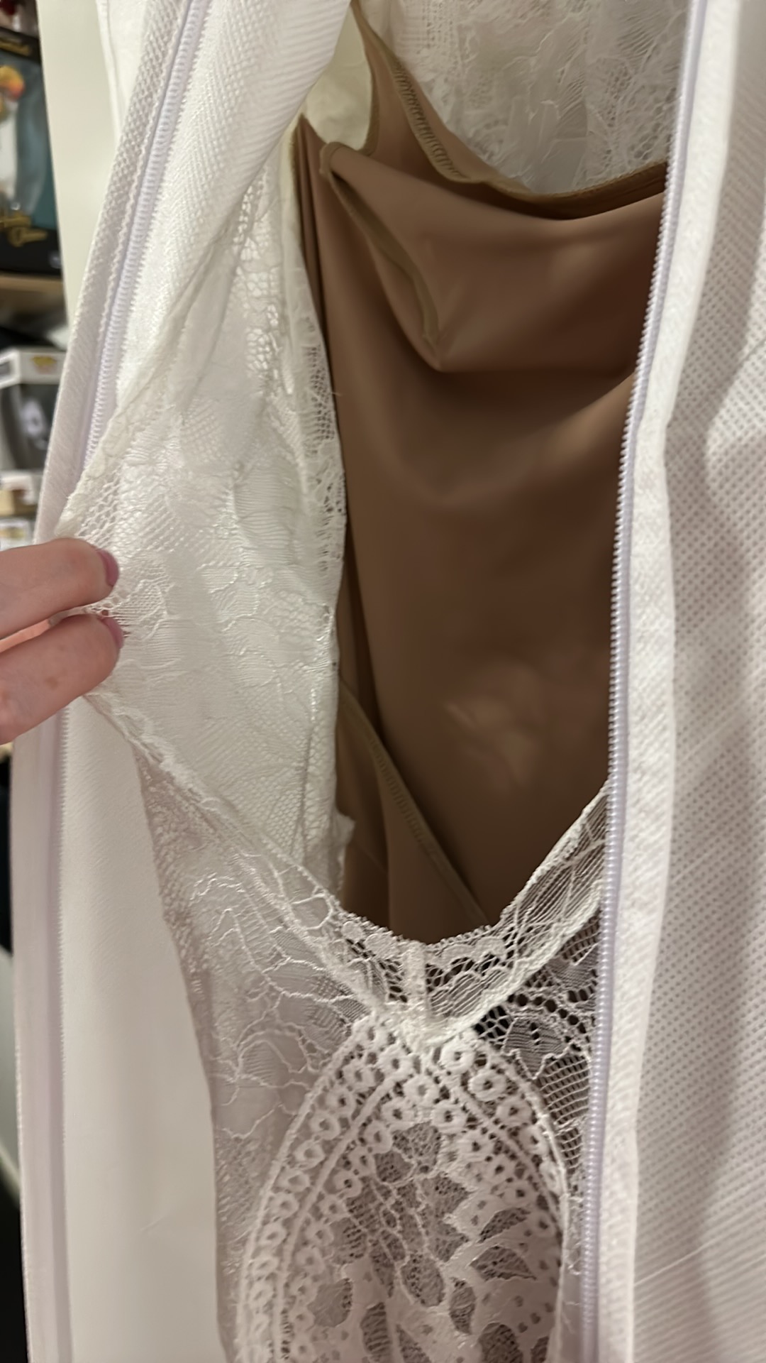 Excellent condition has been dry cleaned , very comfortable and stretchy lace it moves with your body .
