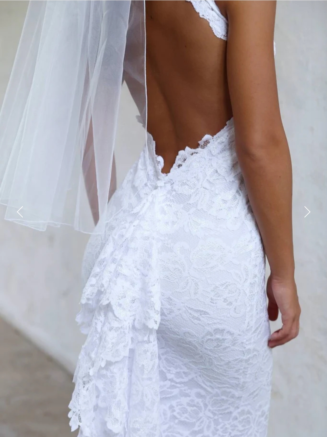 “Elegant, sexy and utterly breathtaking, I designed this gown for a girlfriend to show off her stunning figure. It has the perfect silhouette and balance in shape, showing just the right amount of skin. The French stretch lace is so comfortable, you can dance all night!”