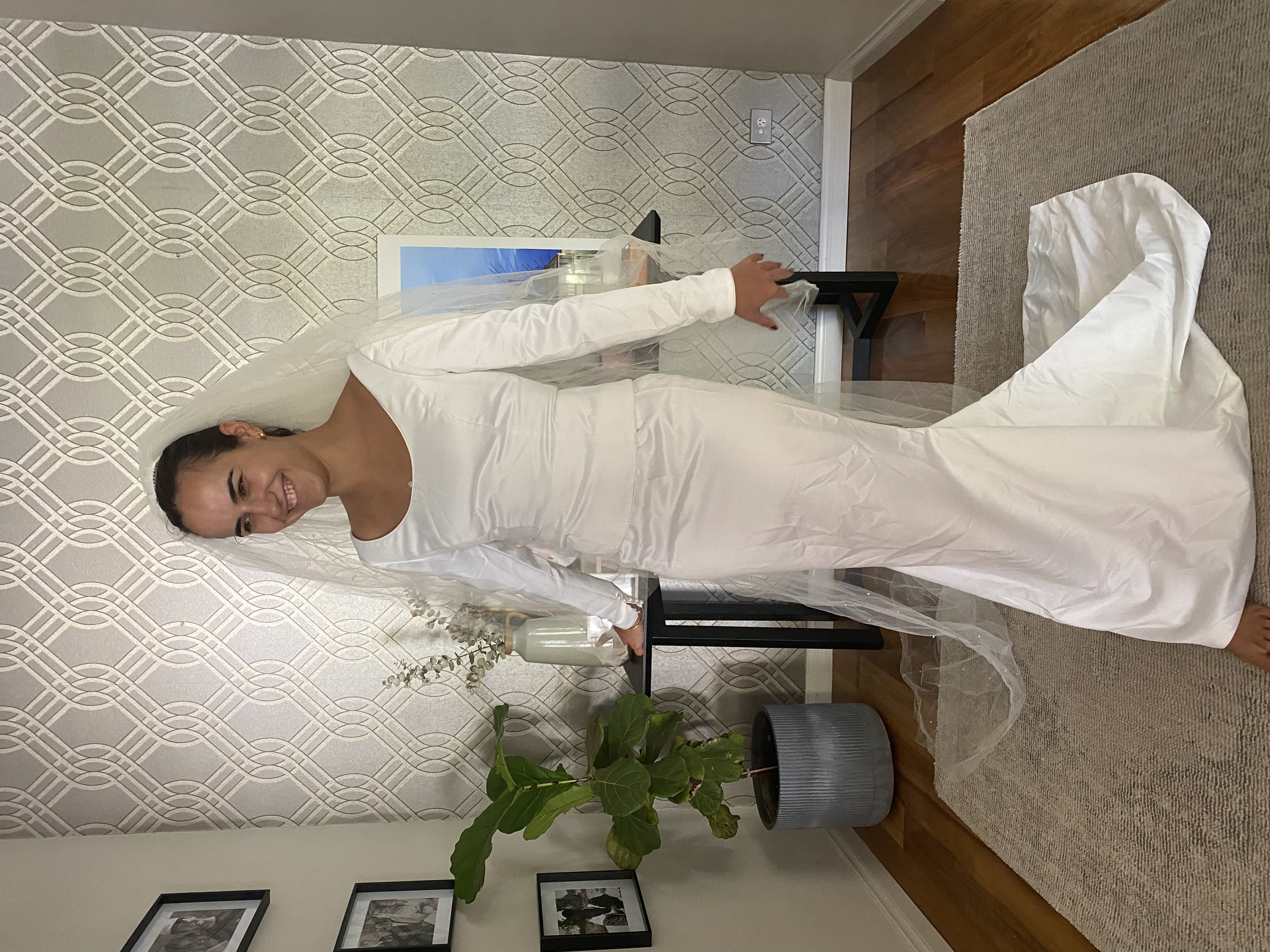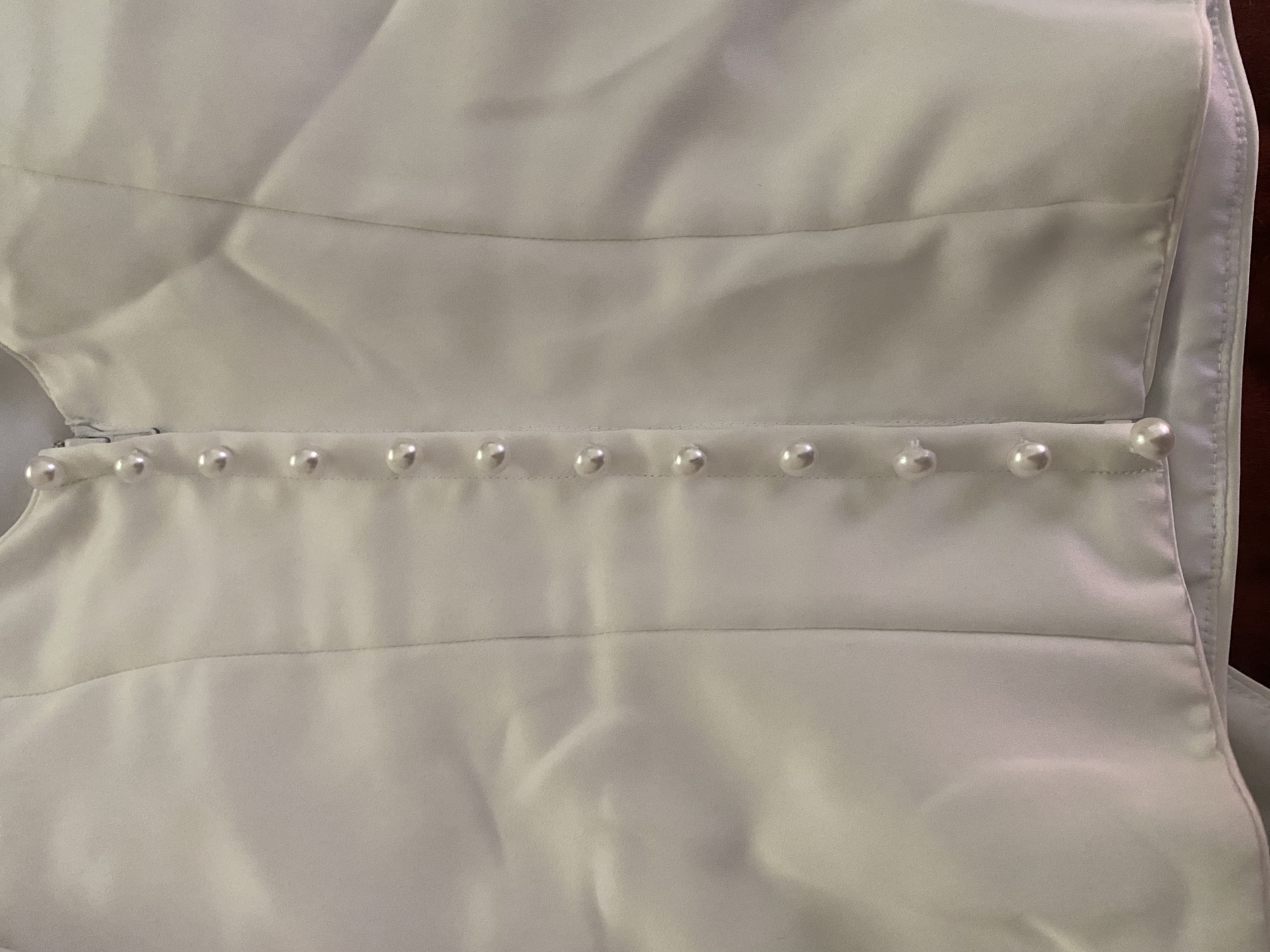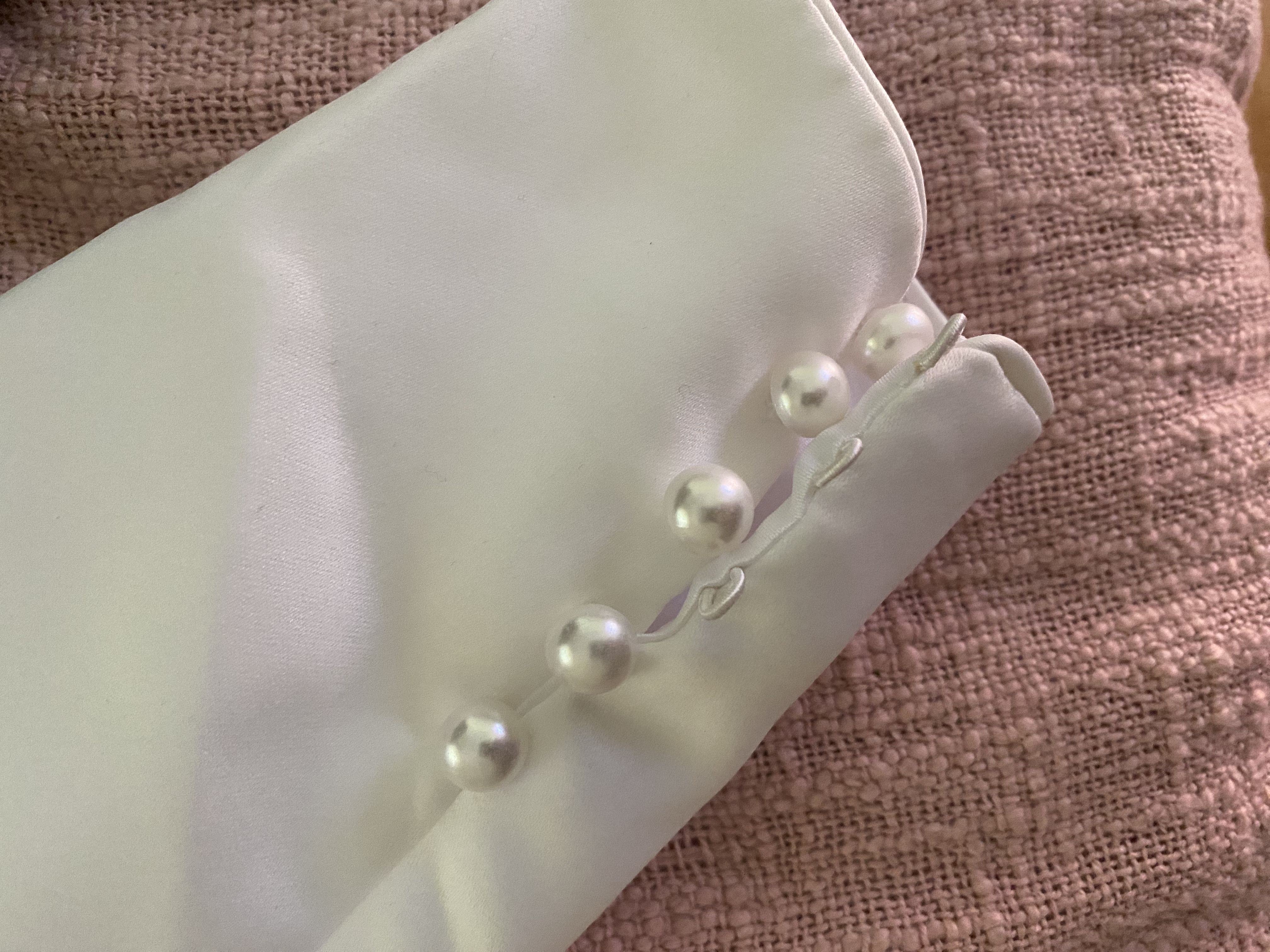 Handmade silk satin two peice long sleeves scoop beck pearl button detailing fishtail skirt