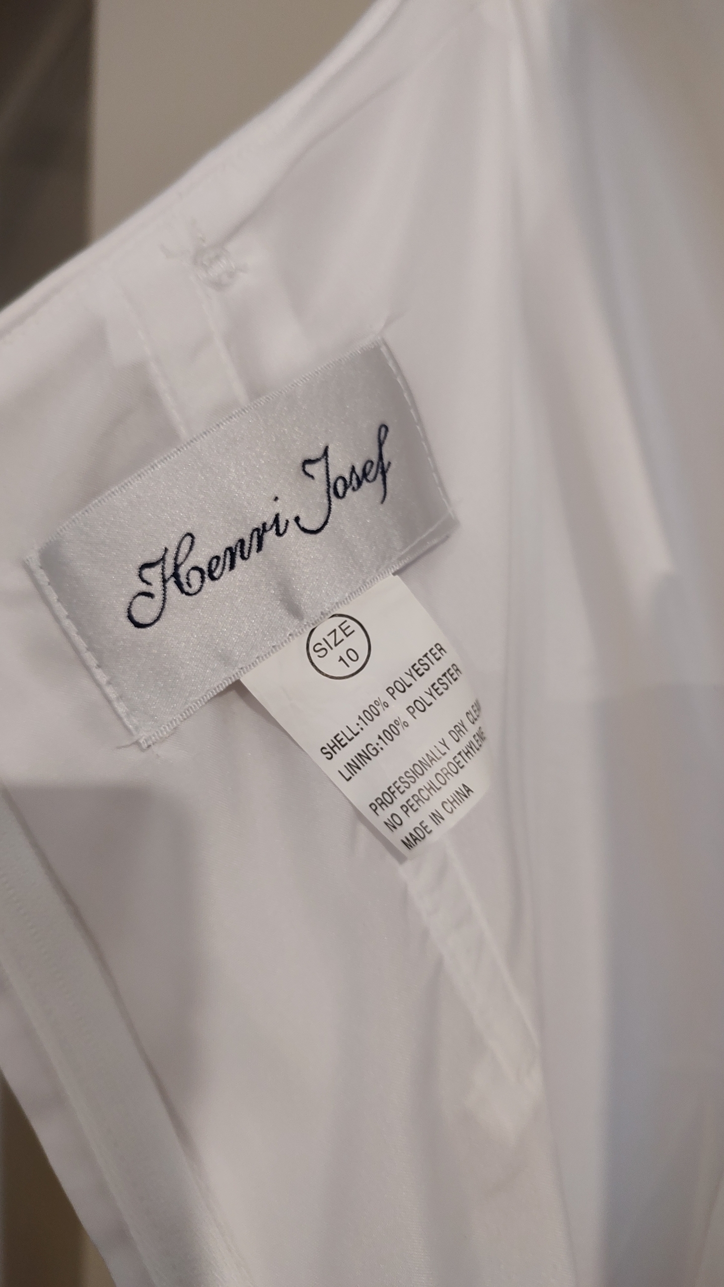 Beautiful strapless A-Line wedding dress with flower embroidery. Also included is the veil with piping on the ends. The dress has been dry-cleaned and boxed so there are a few creases in the material at the moment. Zip at the back for ease of getting into. Has had minor alterations. Both the dress and veil are in excellent condition.
