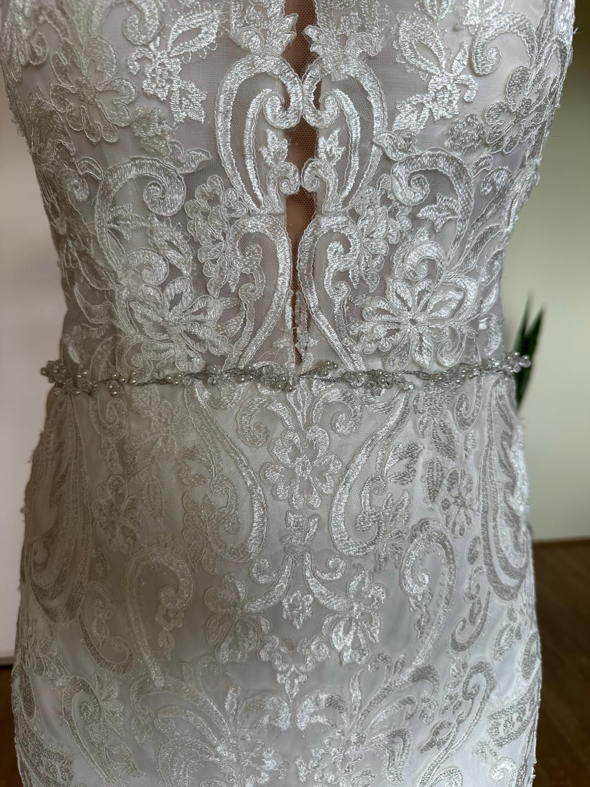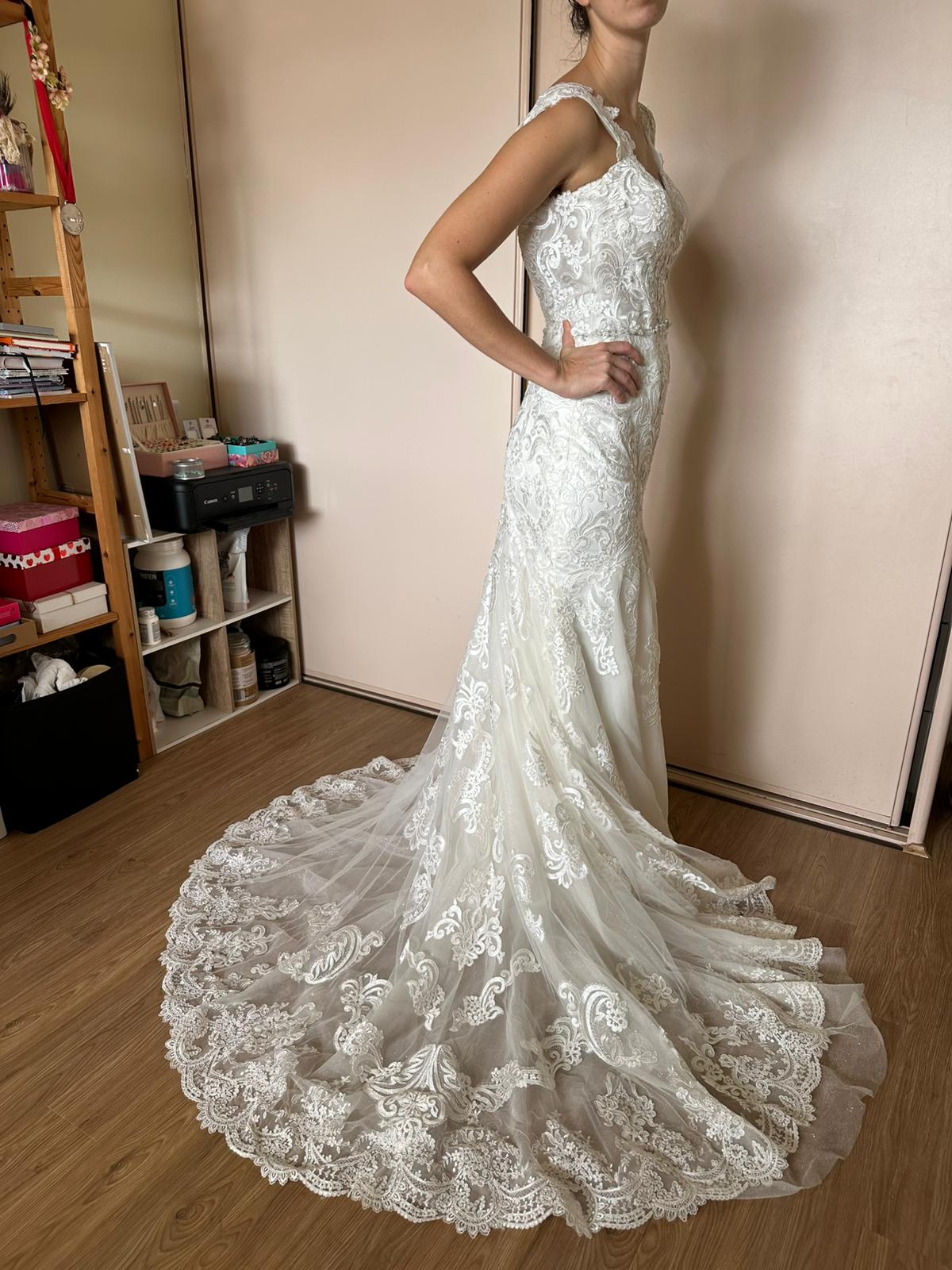 DRESS CAN BE ALTERED !! TO SUIT the body shape. Lenght will probably not be, cause of the lace trim on the wedding train.