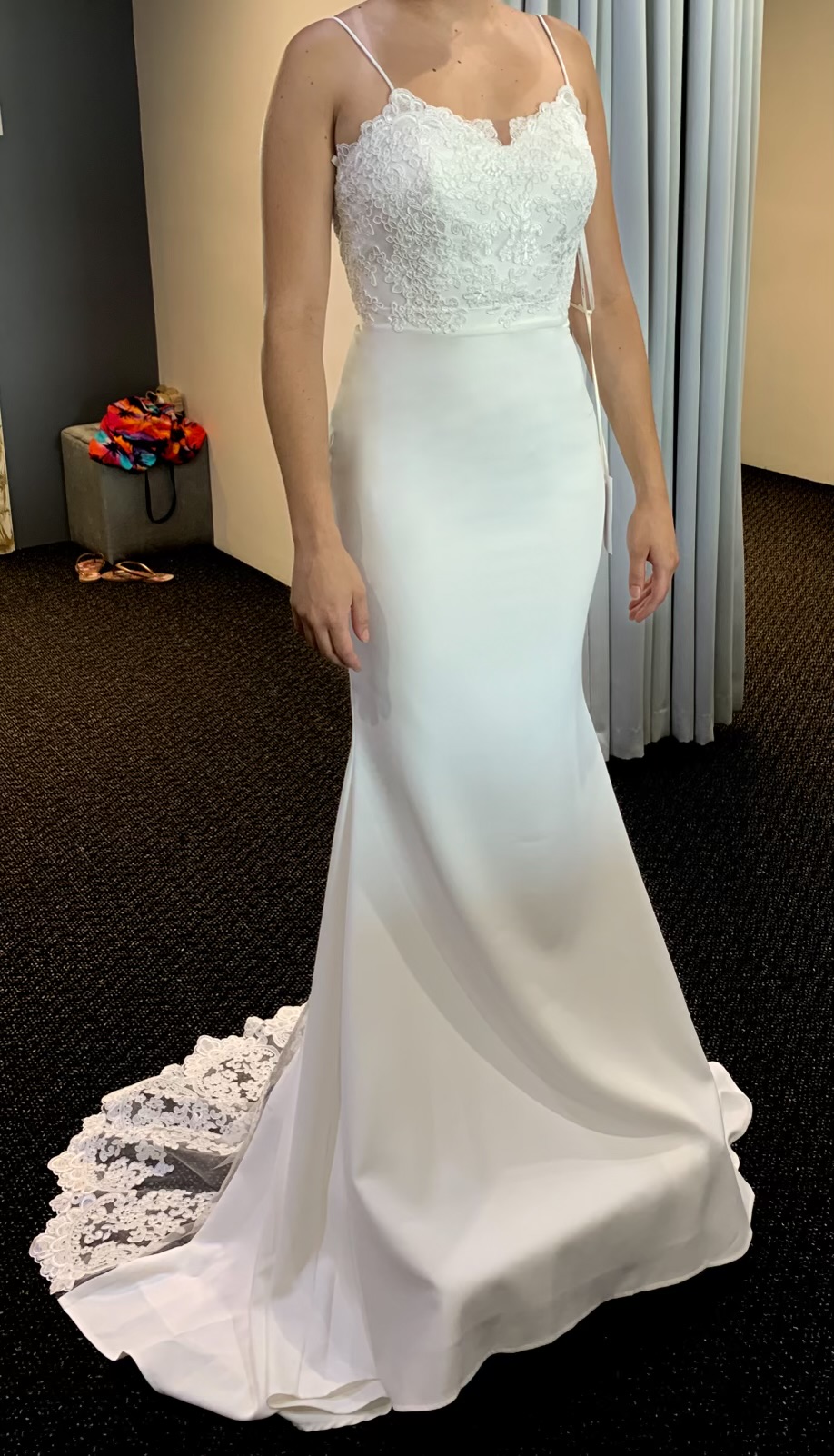 A beautifully structured sweetheart lace applique bodice with raw edging. The gown has a smooth skirt with a decadent sweep train with full length hem. The back of the skirt has an intricate matching lace panel insert (from the knees to the floor). This cream coloured crepe and lace wedding dress is an elegant look, perfect for women who love understated glamour. This dress also comes with thin shoulder straps and built in cups. Mermaid/A line gown with small train. Train can be bustled for dancing. Brand new. Never worn. $750
