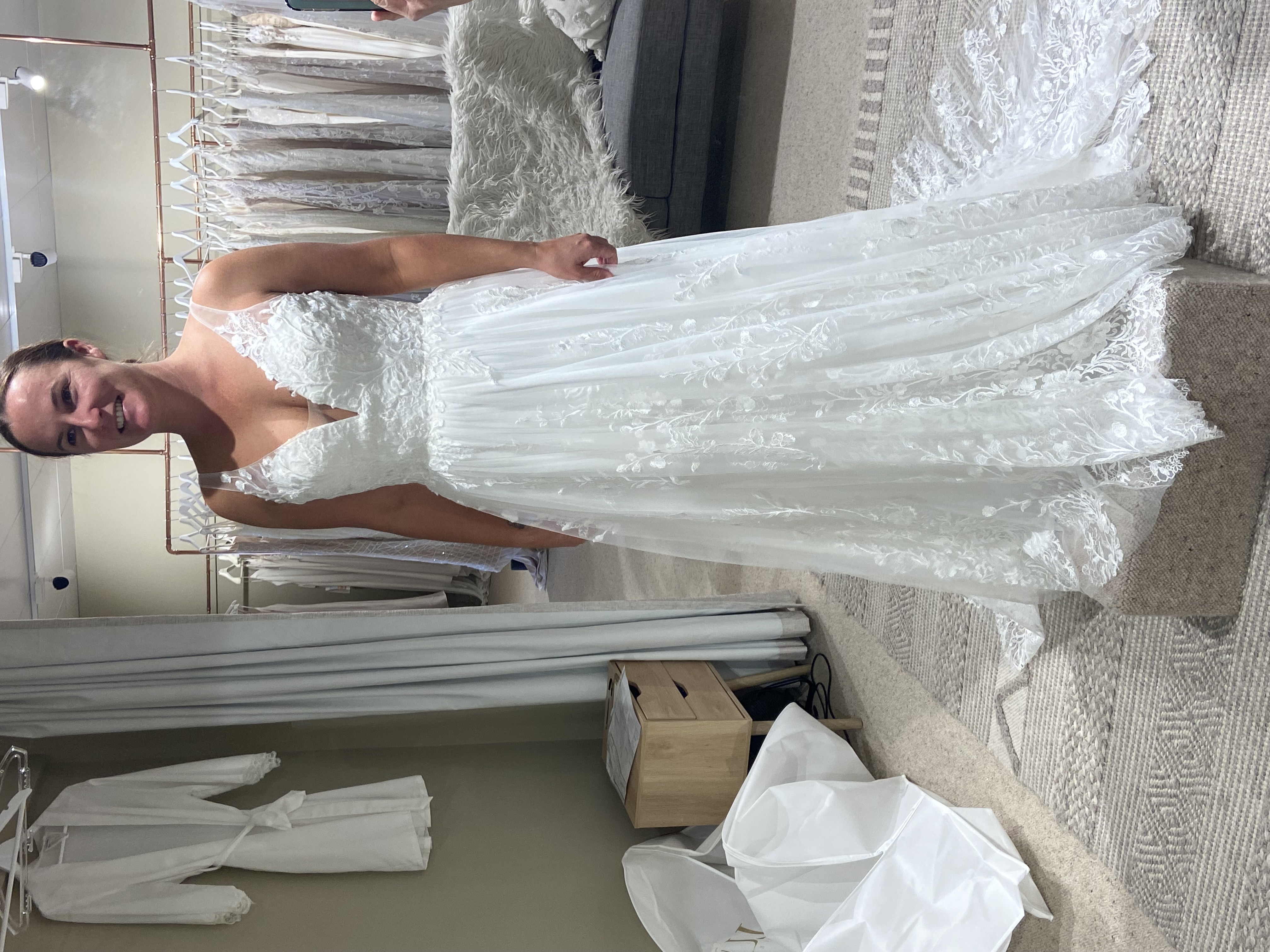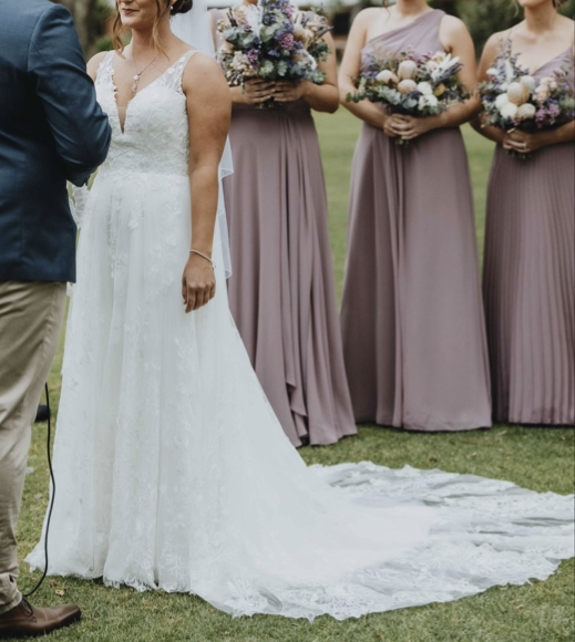 Dry cleaned in very good condition. Cups sewn into top so no need for a bra. Very comfortable to wear for the day and night. Size 14 in wedding dress sizes but fits like a normal size 10. Bustle put in as well to hitch up for the reception.