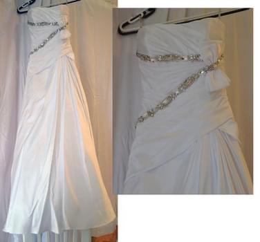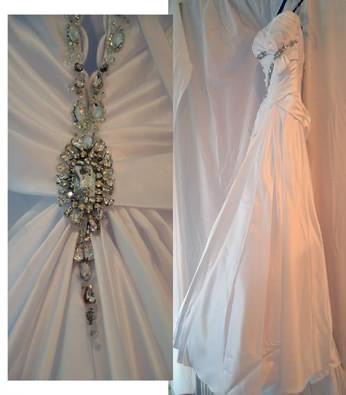 Dress is made of the beautiful sheen L’Amour Satin with dramatic jeweling on the front and is stunning surrounding the back corset closure.
