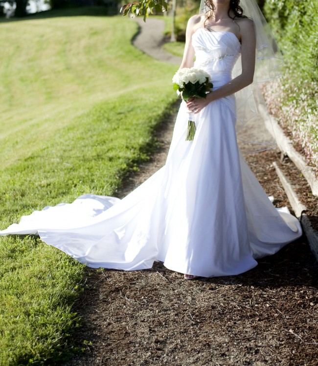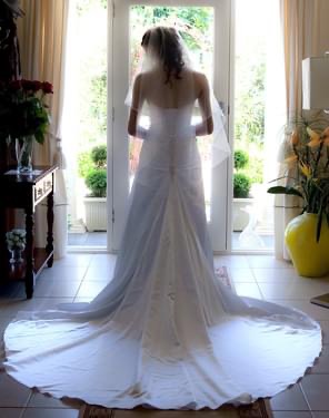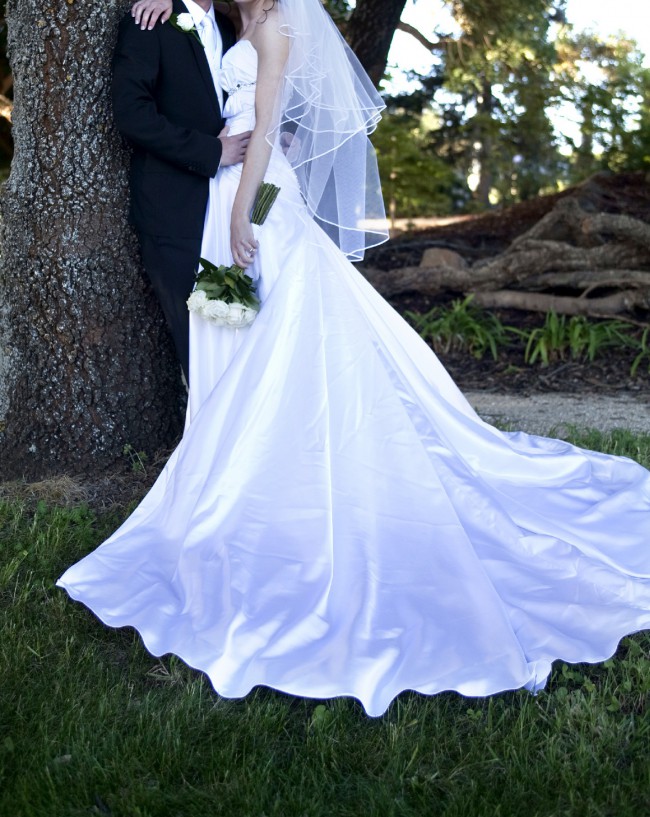 Train can be tied up into a bustle. Has been dry cleaned and stored in a bridal box, will provide original gown bag also.