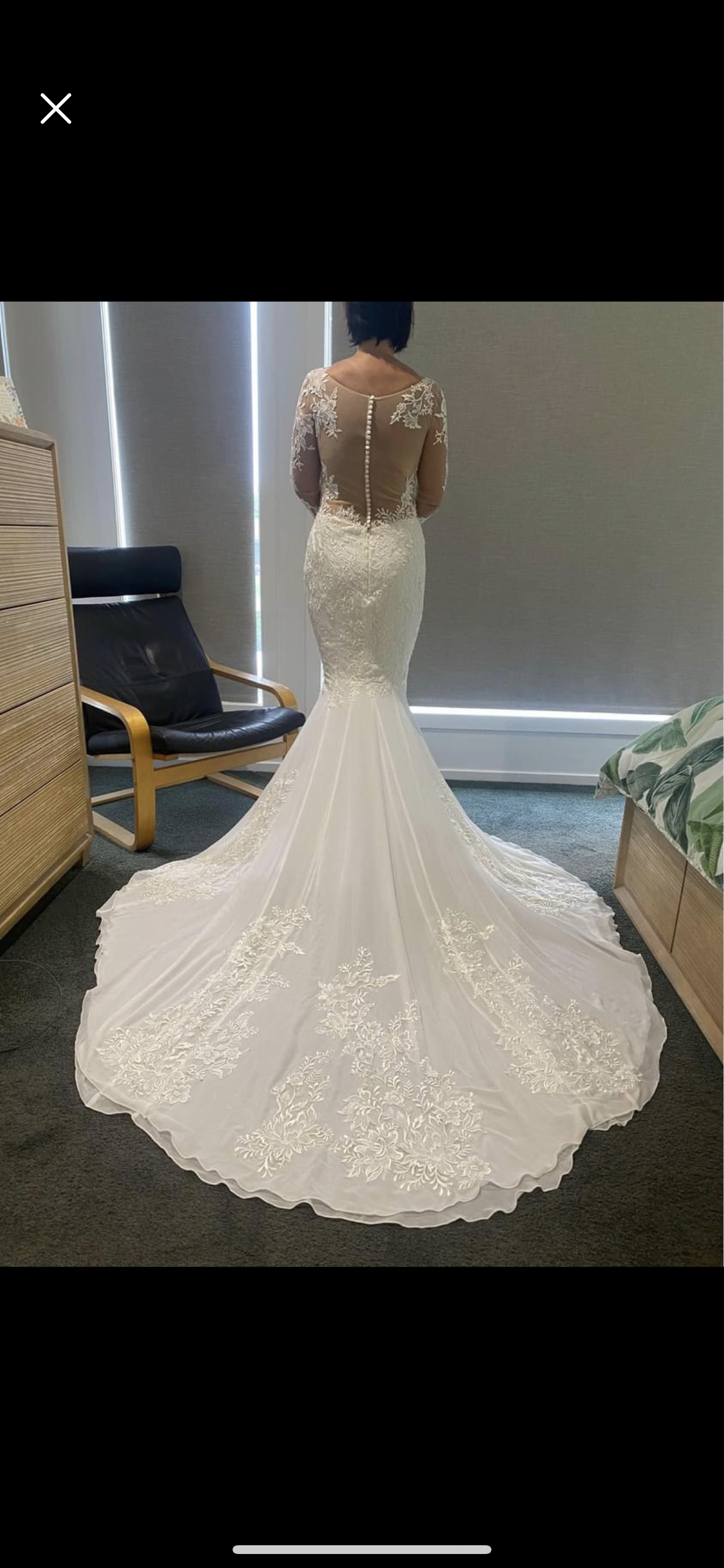 Beautiful Tina Valerdi mermaid style Wedding Dress. Ivory with lace detail on the sleeves, bust & train. This would fit up to a size 10 as it is a very fitted style. Unfortunately I have had to buy another dress so I am hoping someone else can enjoy this one. Brand new, no alterations made. Comes with tags still attached and in a protective bag. Any questions please feel free to message me. Pickup is available in Upper Coomera or Beaudesert, QLD. I could post Australia wide at the buyers expense.