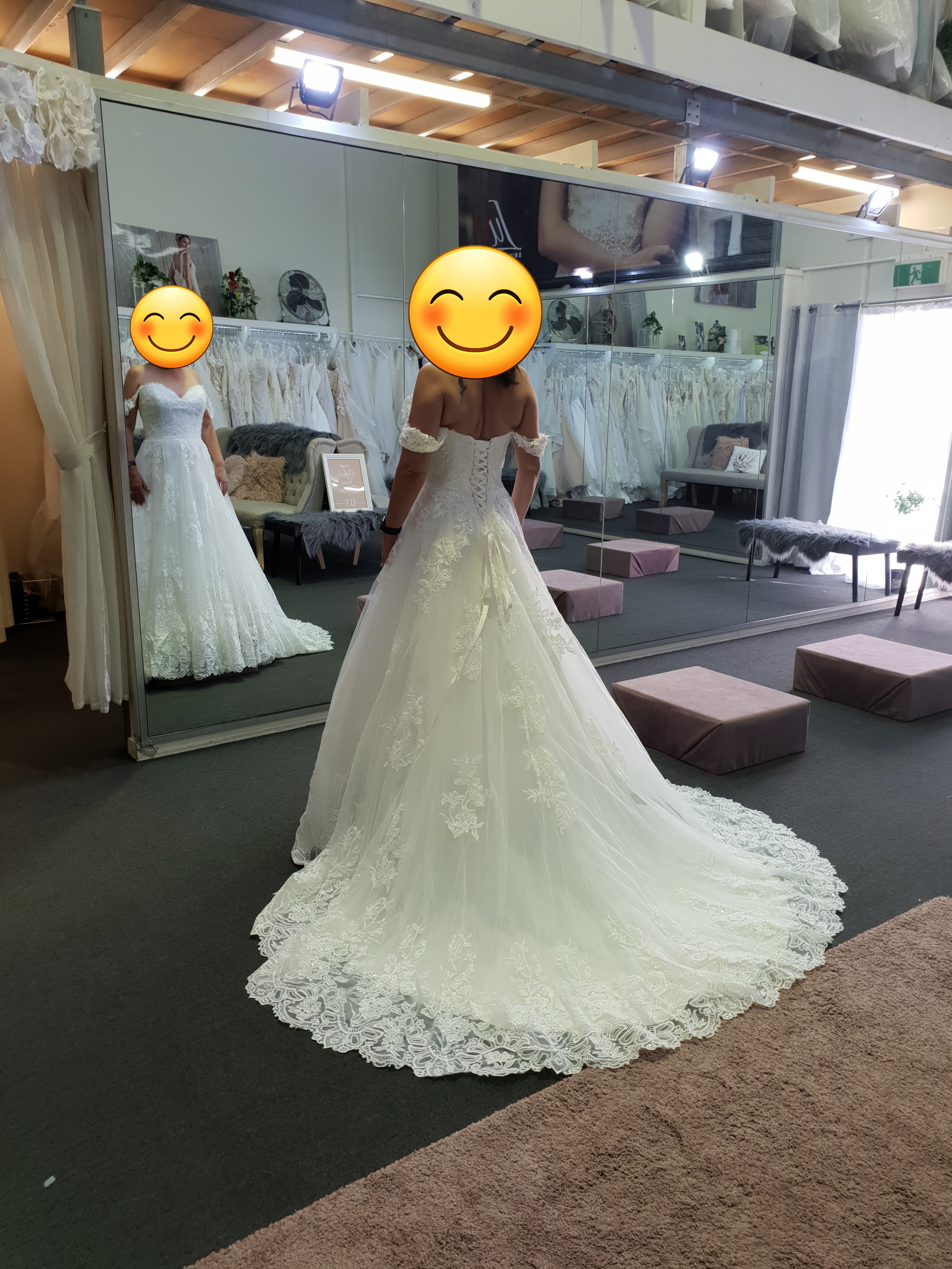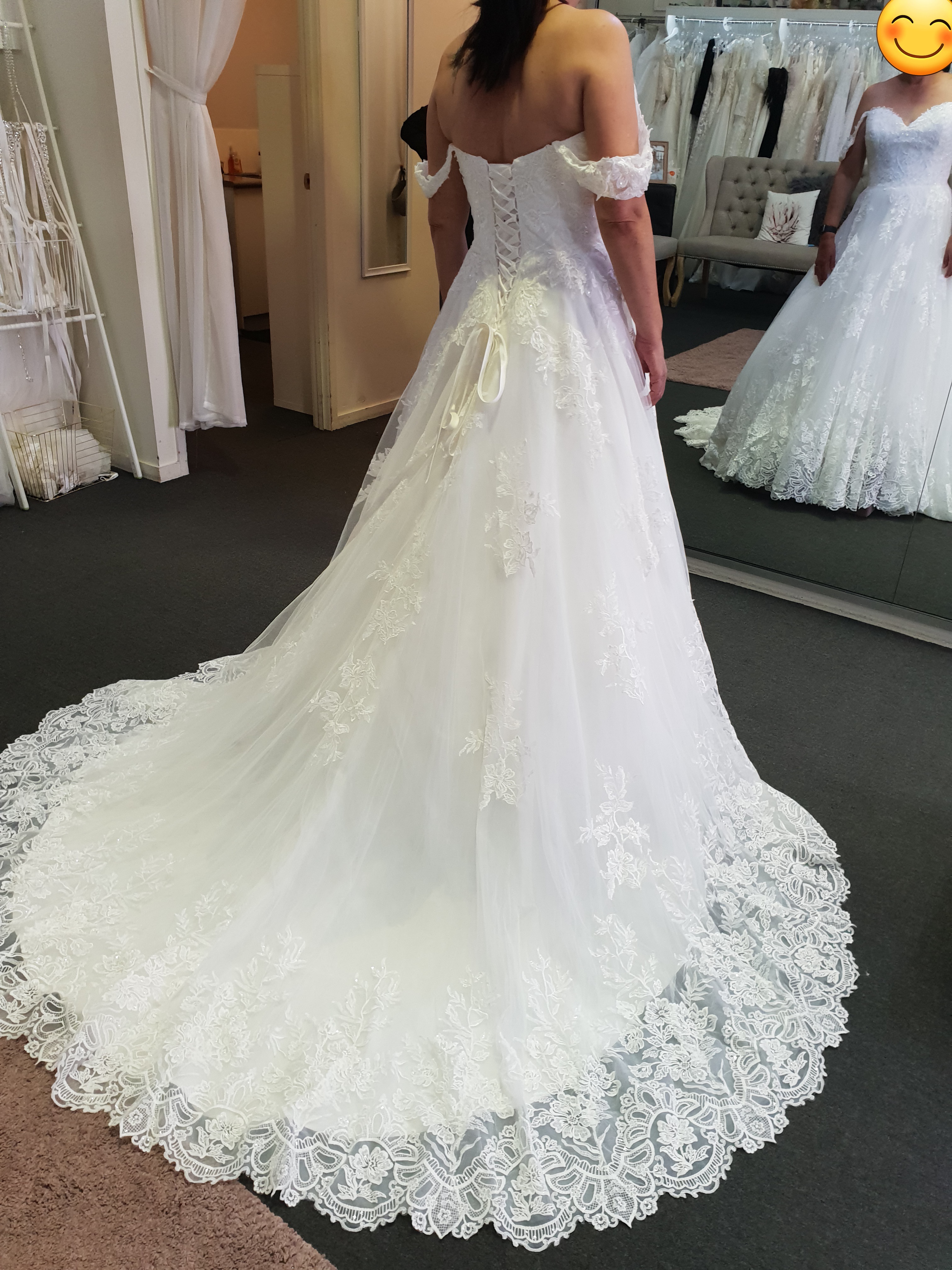 Brand new, unaltered, never been worn except to try on. Comes with detachable off shoulder straps. Ivory in colour with beautiful lace detail.