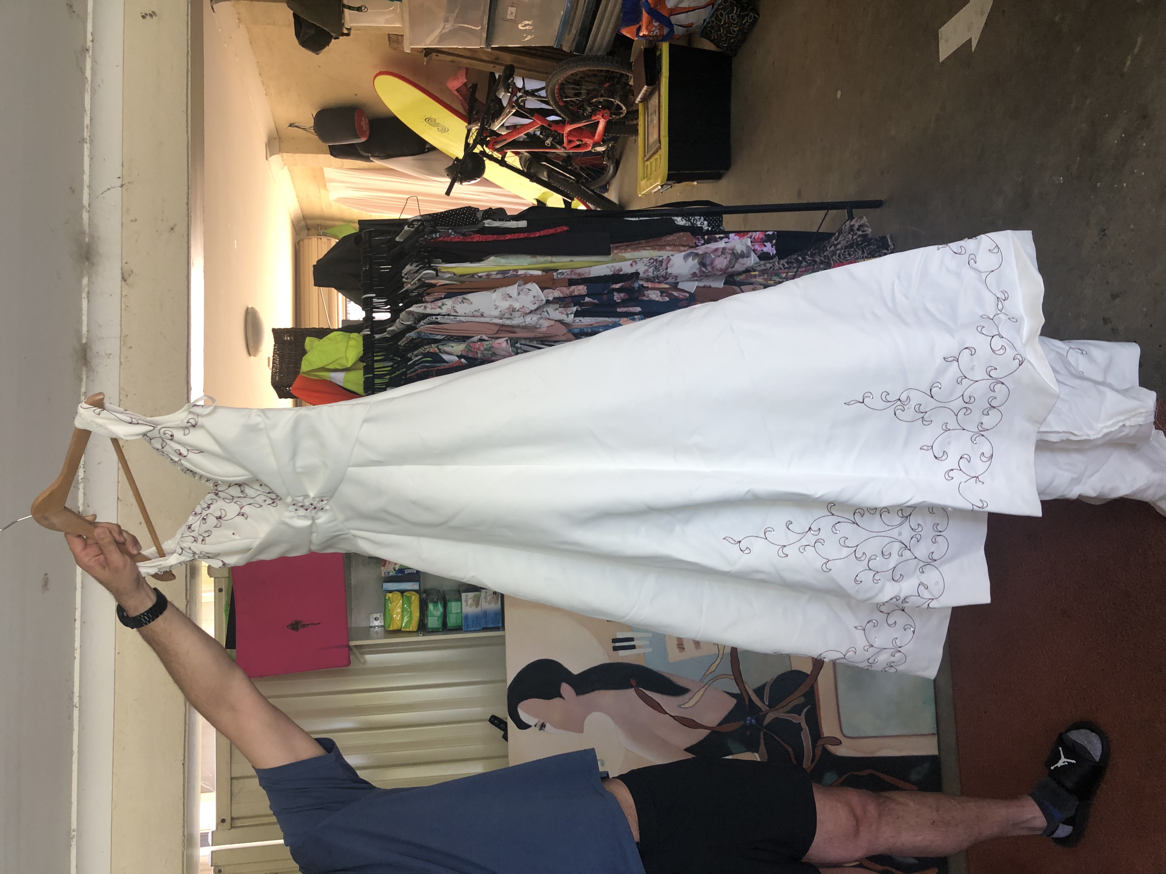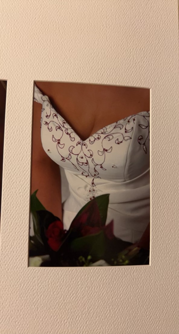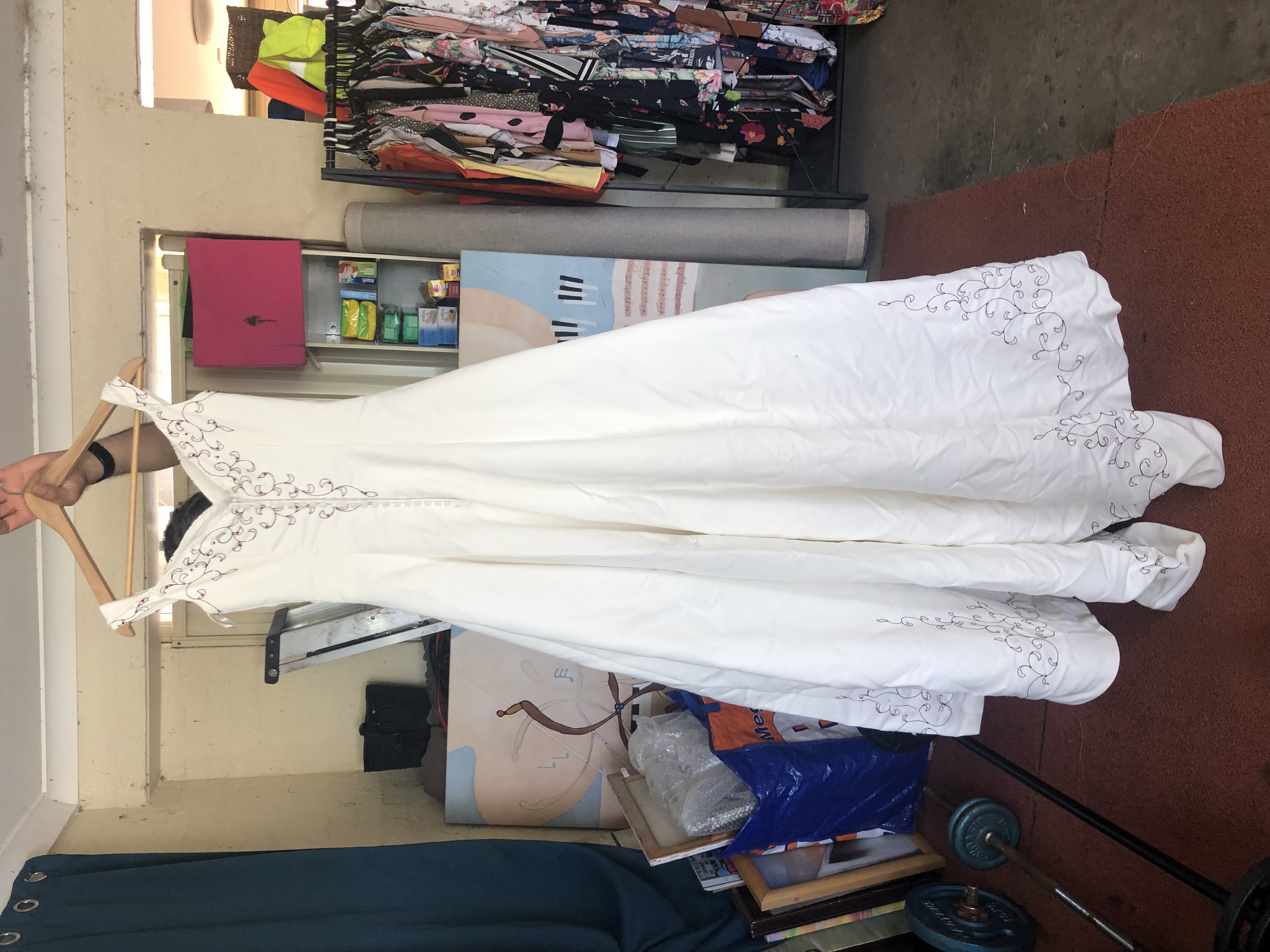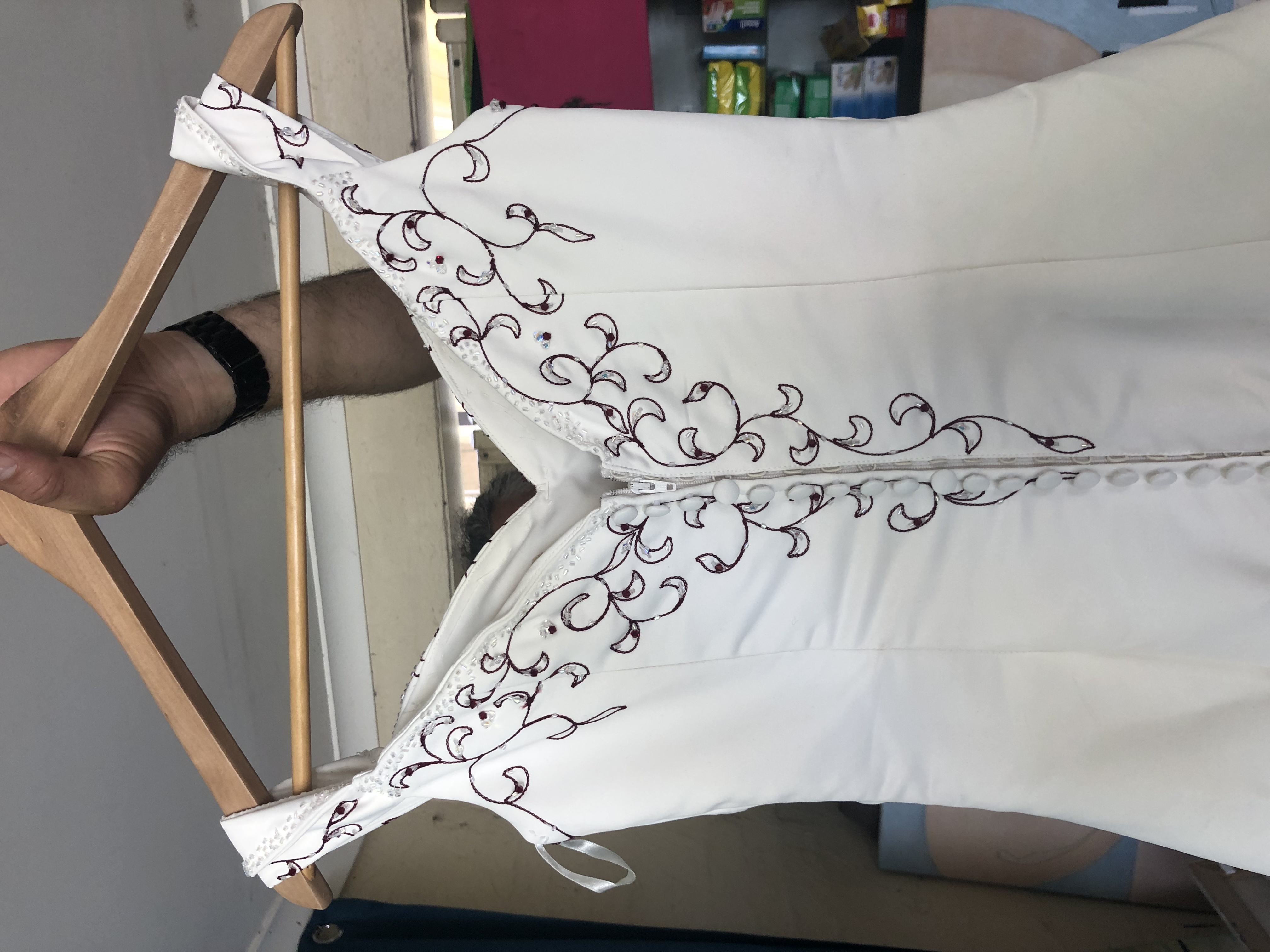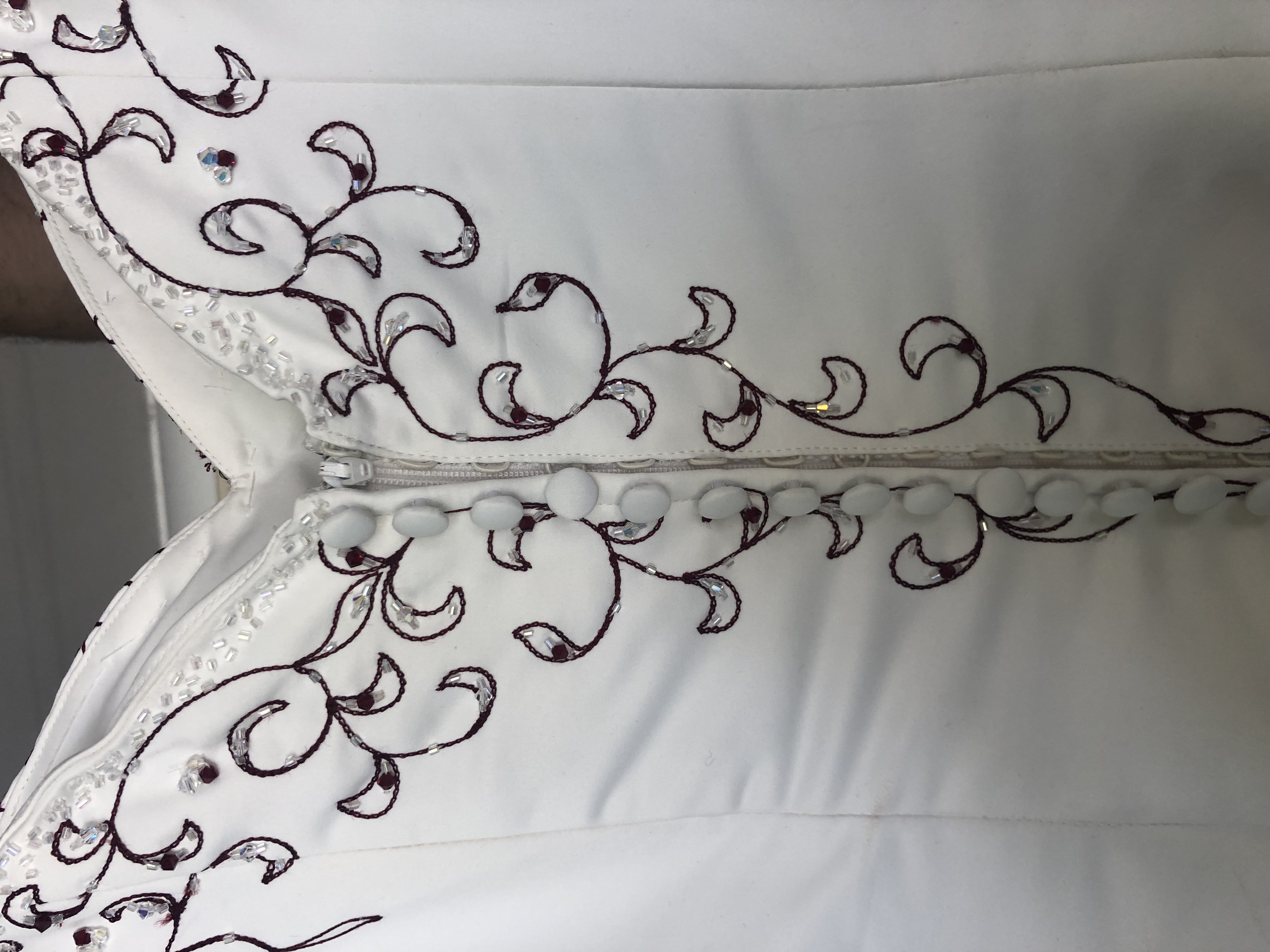 Beautiful size 10 white with beeded burgundy embroidery on top and bottom wedding dress.