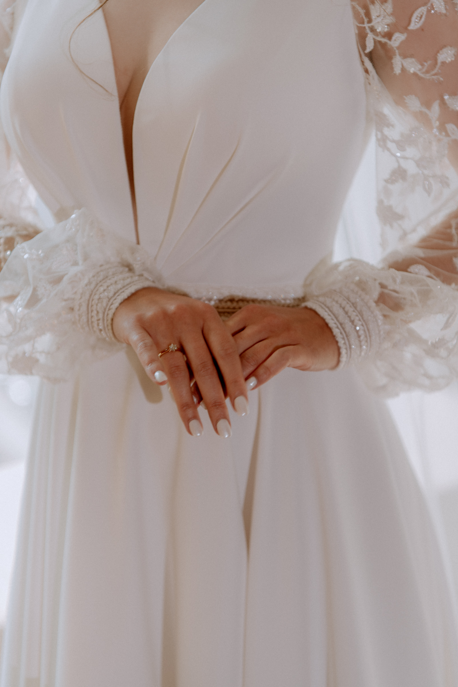 - Luxurious train that can be hooked. In this way, you can look luxurious at the ceremony and comfortable and perfect at the celebration.
