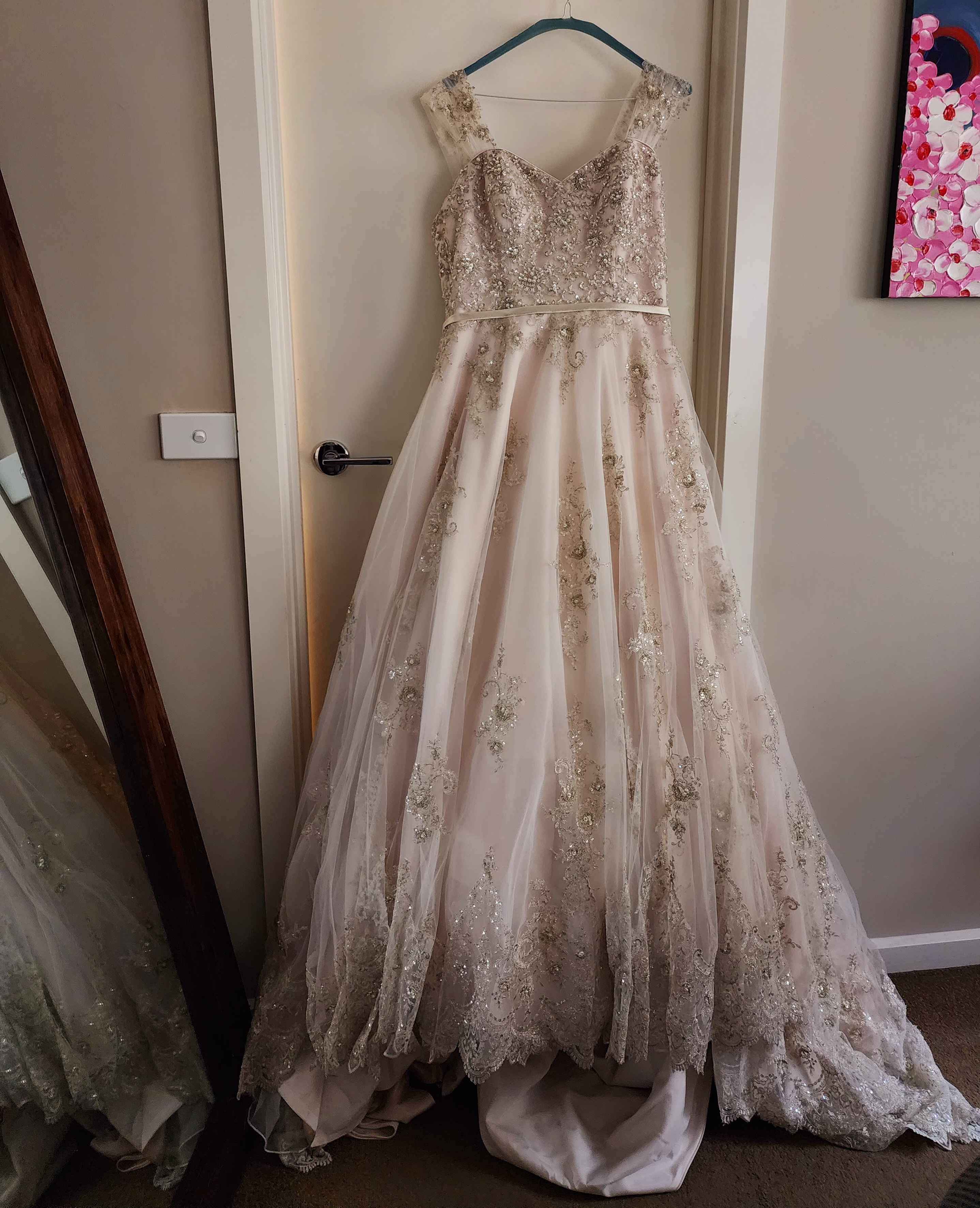 Beautiful Size 14 dress (14D cup) adorned with Swarovski crystals would suit someone 155cm tall. Straps were added. Rrp $3500. Worn once in 2014 and has been dry cleaned.