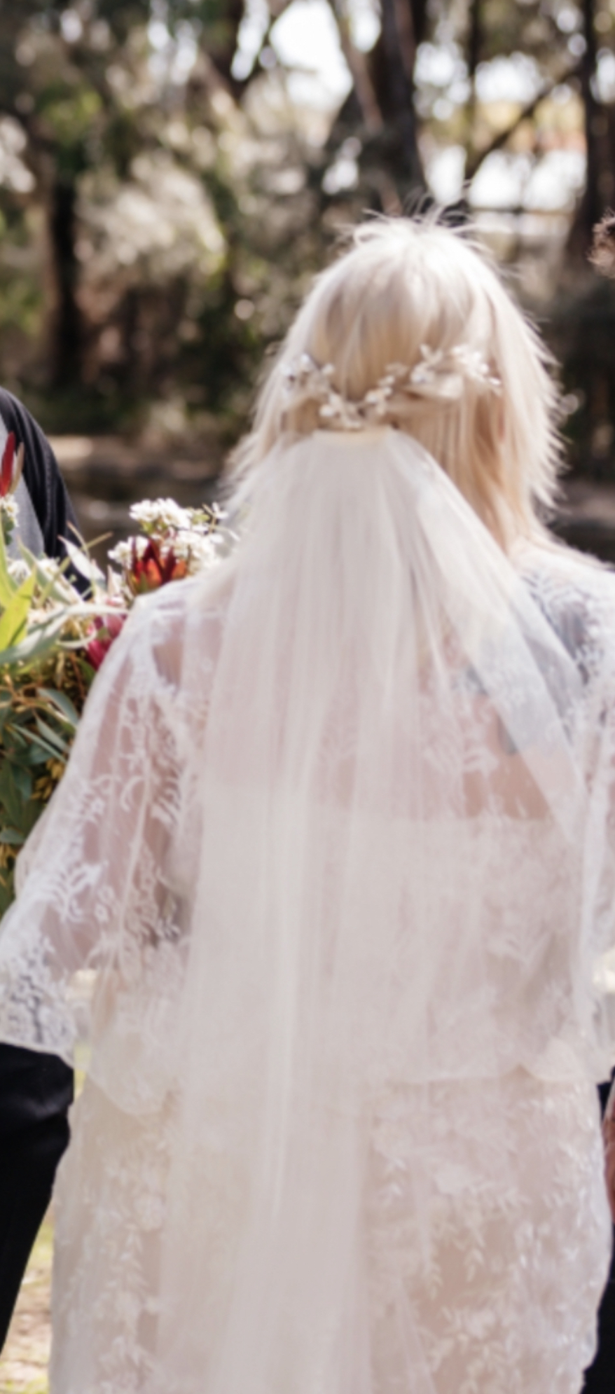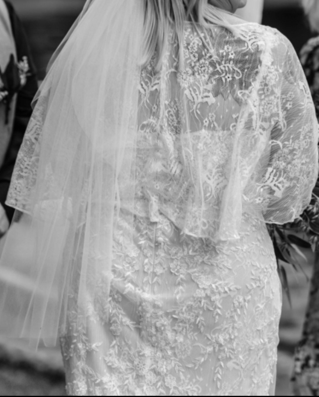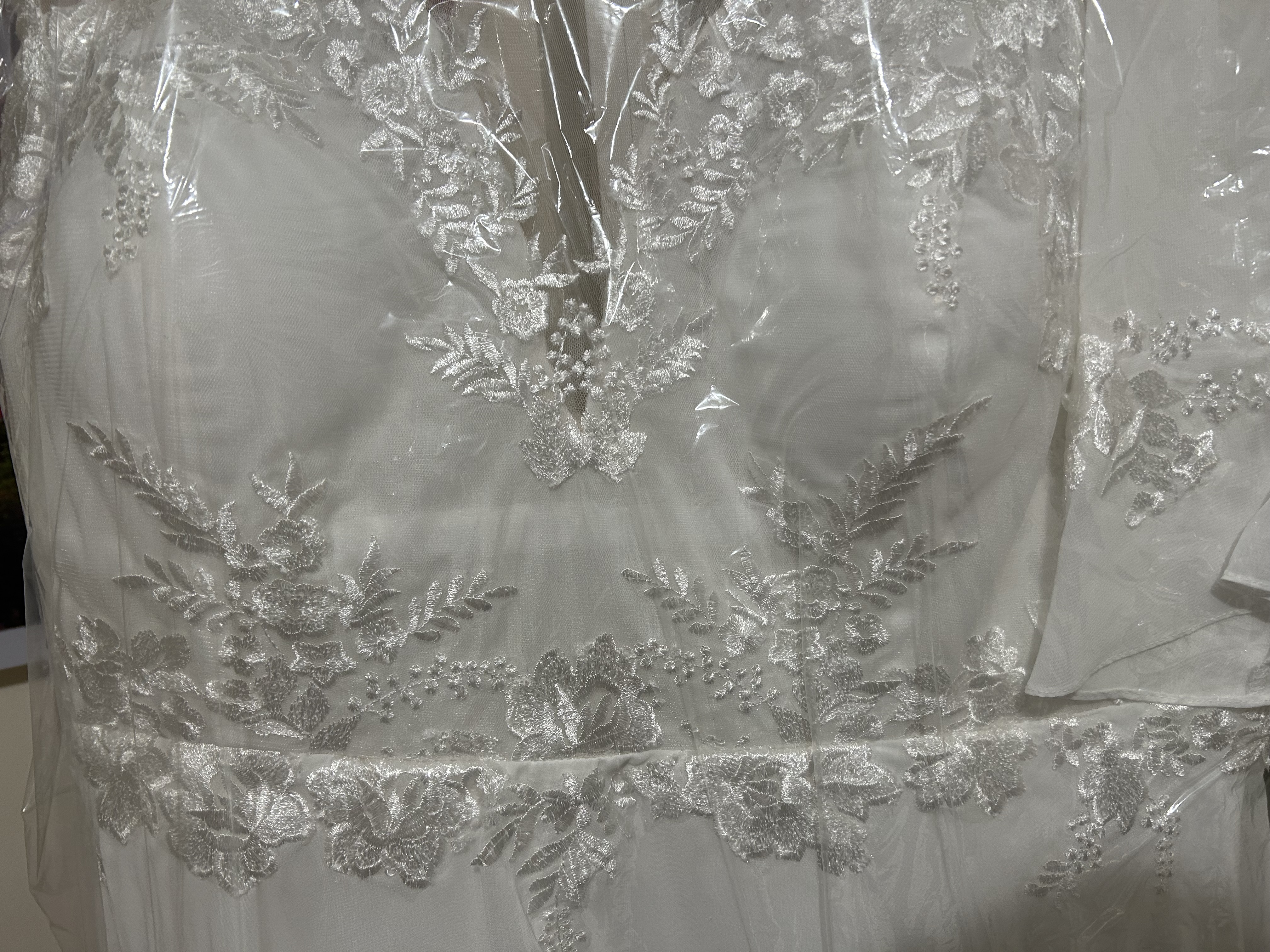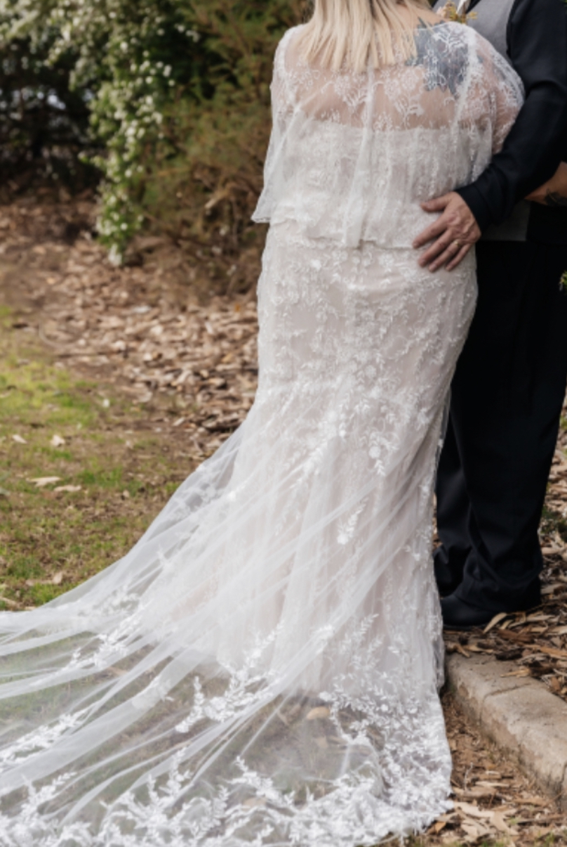 Beautiful lace comes with removable lace shoulder wrap that clips onto spaghetti straps with Velcro. Have altered the bust with added lace to conceal cleavage can easily be removed. Has a hustle added that has a loose ribbon which can be resewn.