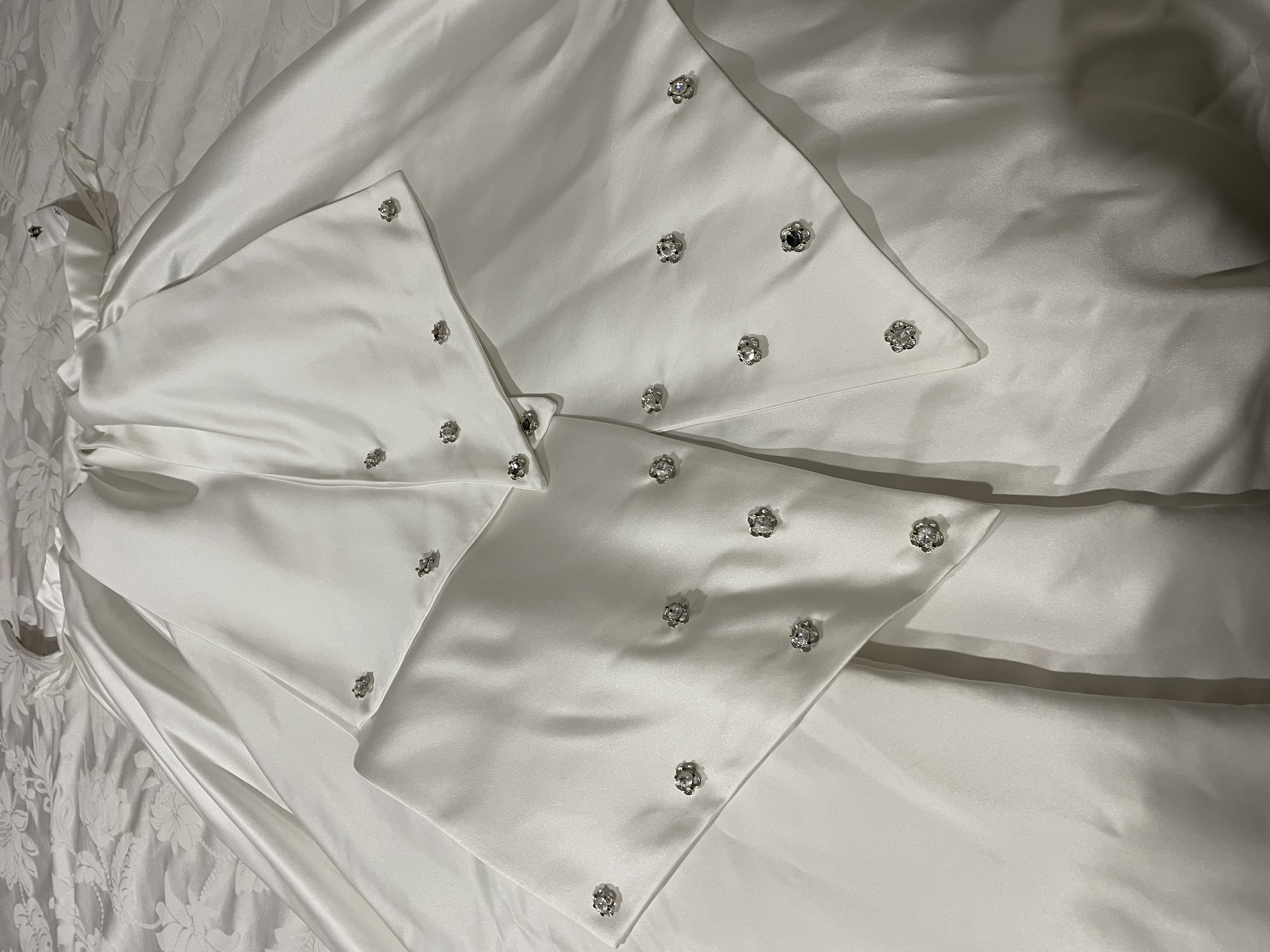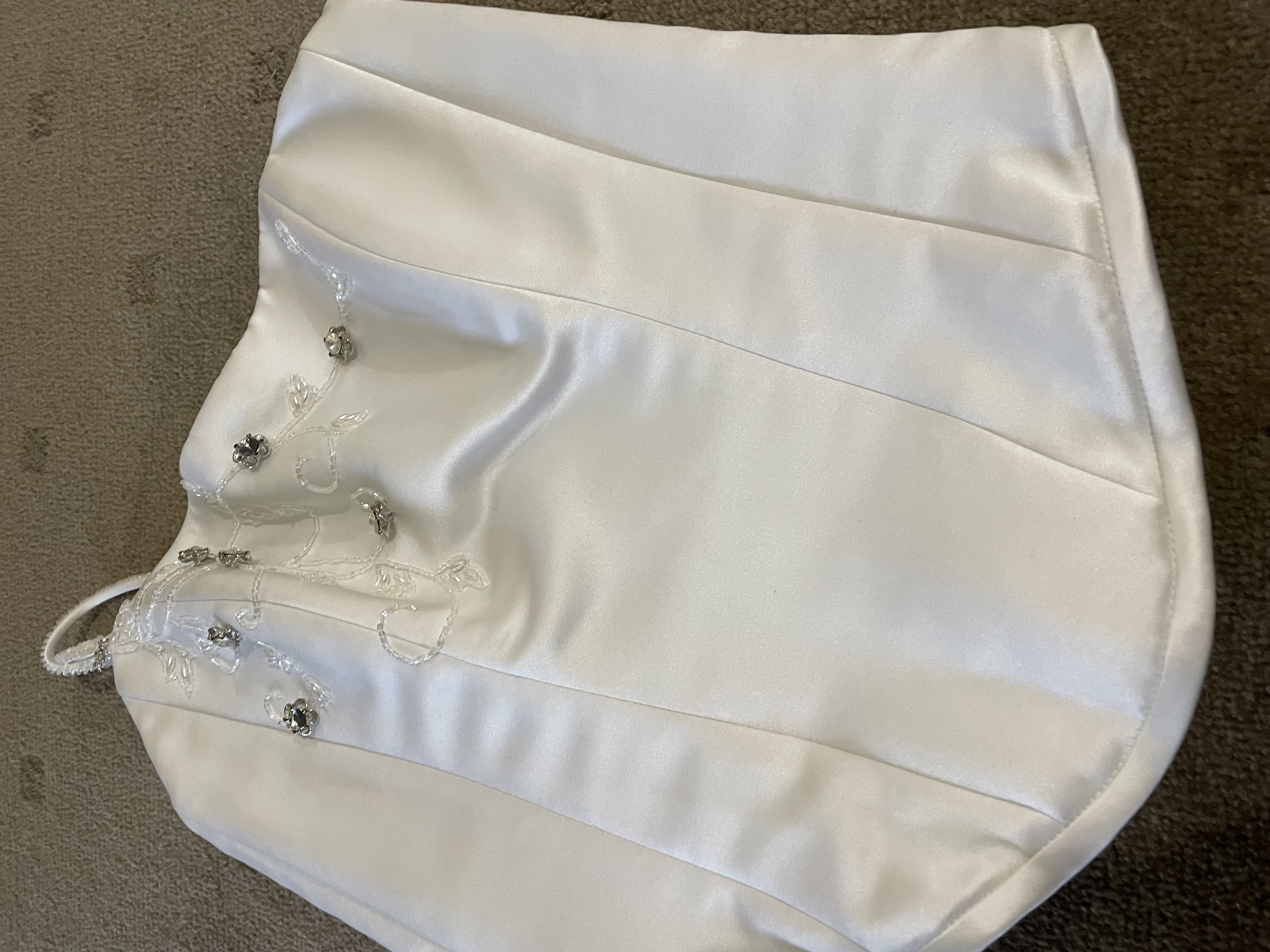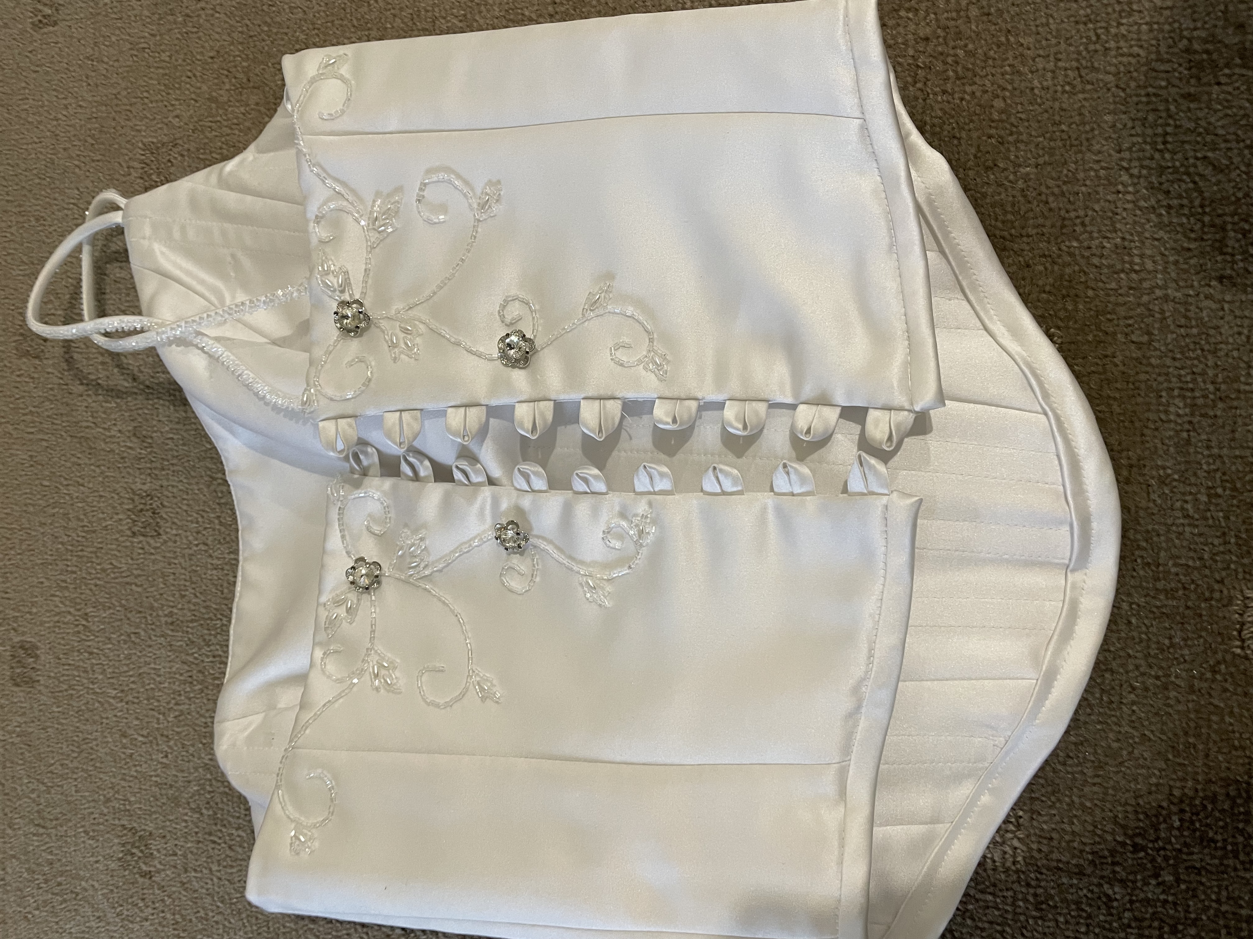 Three piece wedding gown with a corset bodice top, slimline skirt and ballroom skirt. Fits size 8-10. Dress features beaded detailing on the top with a tie up corset back and the ballroom skirt has a bow-feature on the back. Worn once but has been kept in incredible condition. Dry cleaned, boxed with acid free tissue paper by a cleaning and preservation specialist.