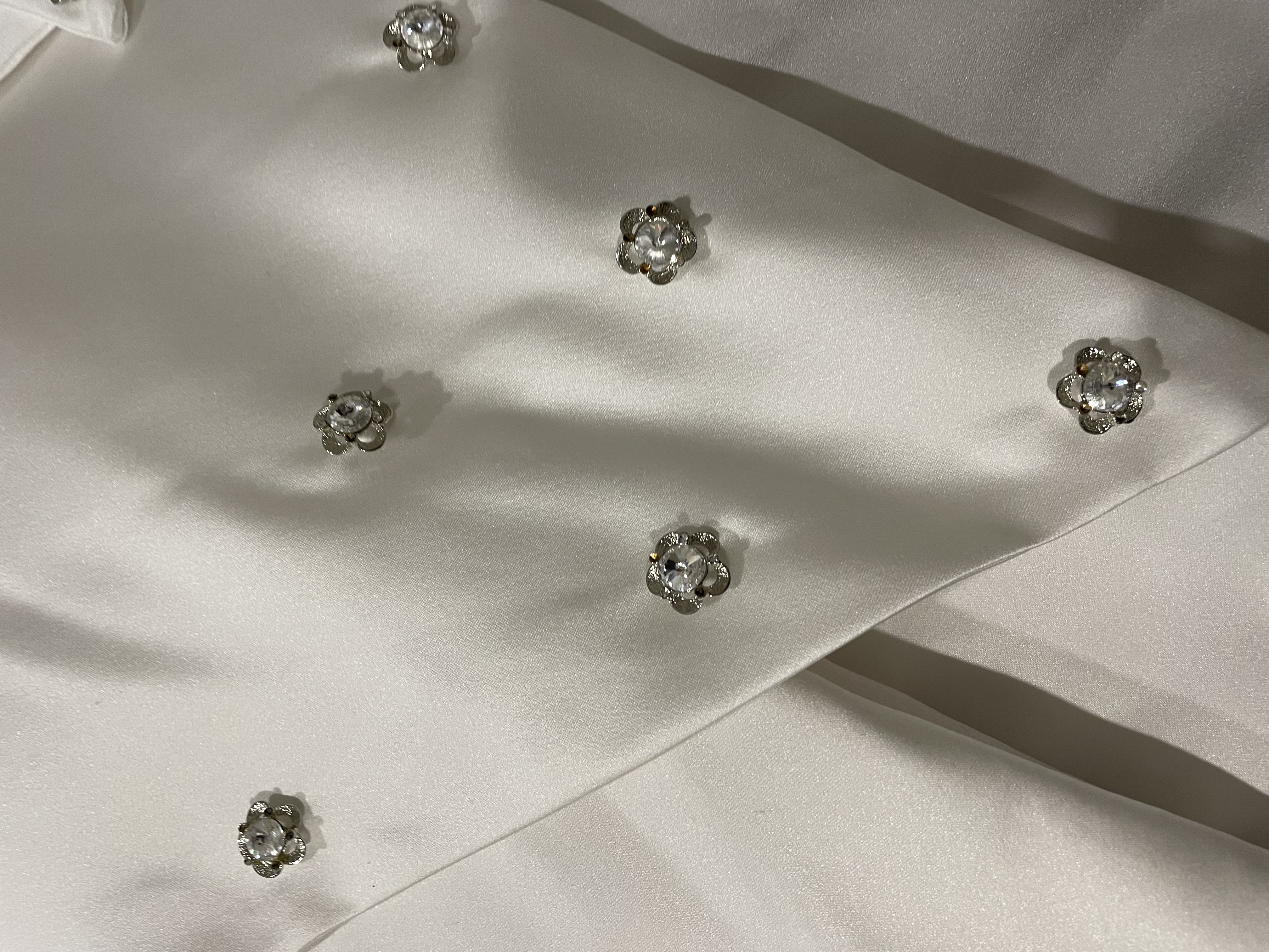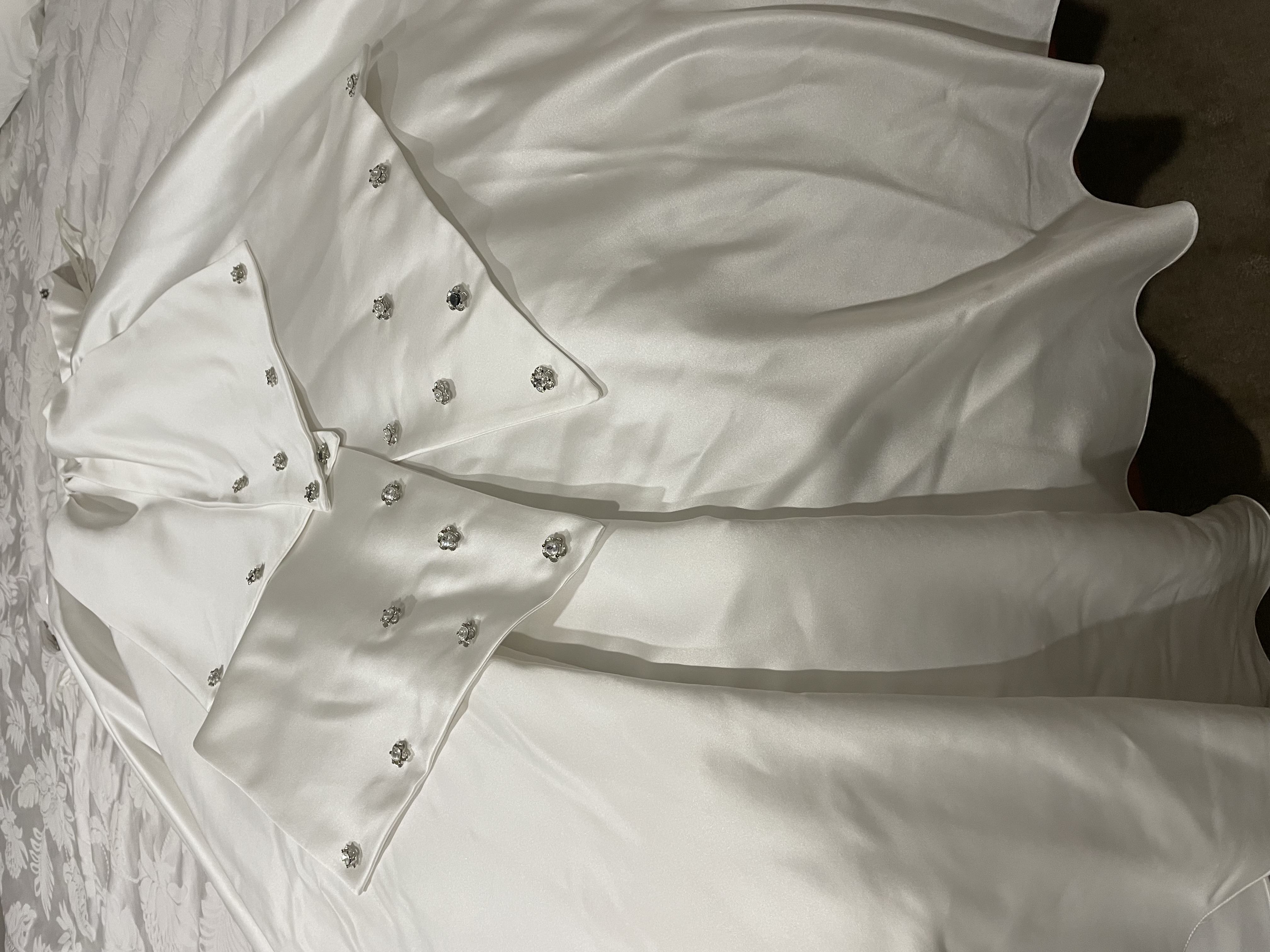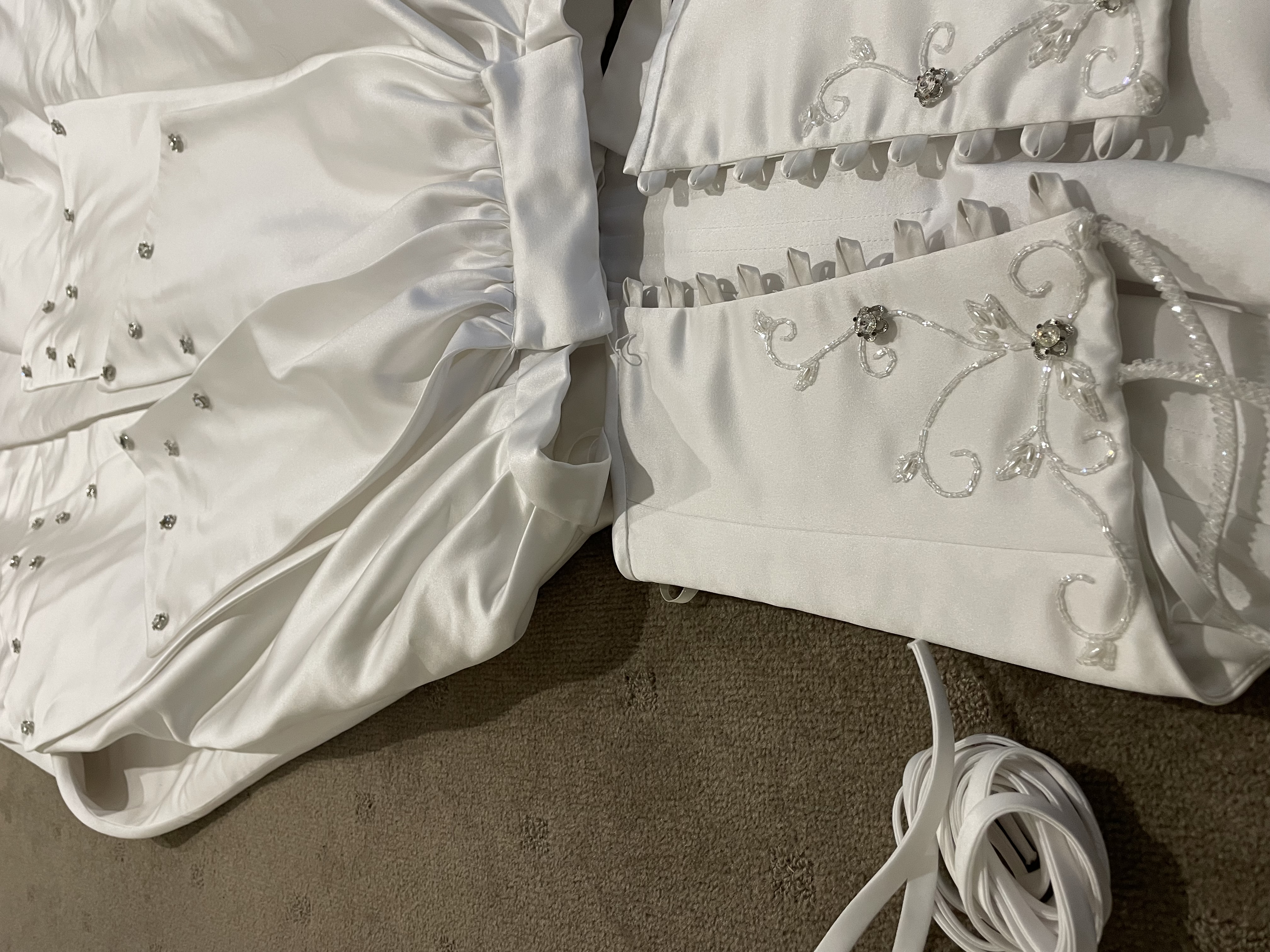 Three piece wedding gown with a corset bodice top, slimline skirt and ballroom skirt. Fits size 8-10. Dress features beaded detailing on the top with a tie up corset back and the ballroom skirt has a bow-feature on the back. Worn once but has been kept in incredible condition. Dry cleaned, boxed with acid free tissue paper by a cleaning and preservation specialist.