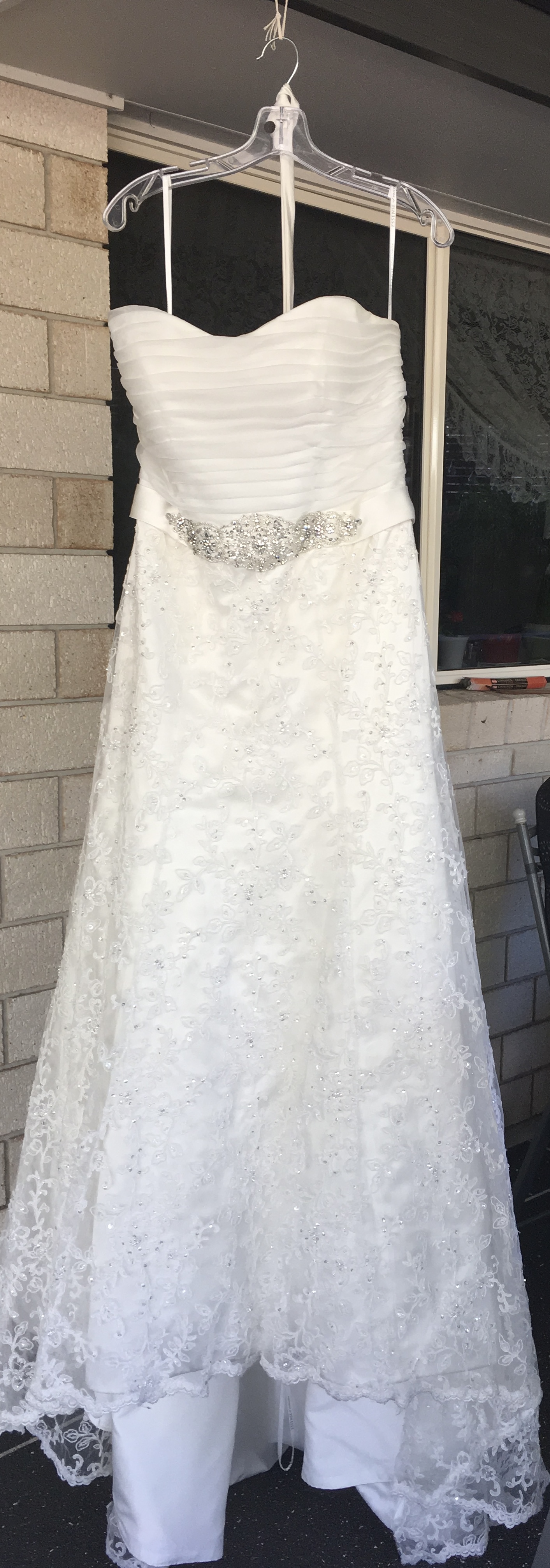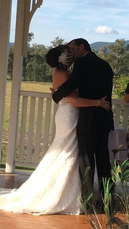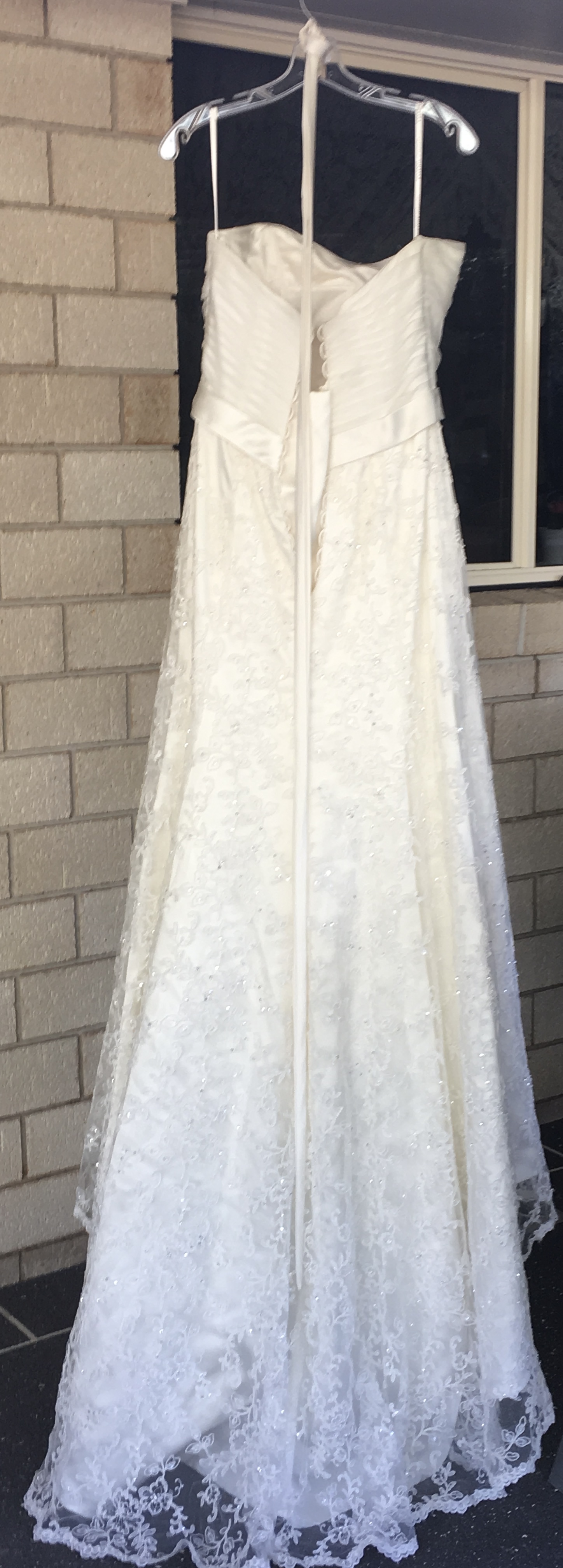Stunning custom bridal gown 4 sale. Beautiful laced gown with sparkling gems on the skirt, has a gorgeous train, tie up back and bustle to pin the dress up for the reception (hoop included). Would fit someone that is size 12-14. Perfect for someone around 164cm and suited to medium height high heels. Pick up only from Logan area.