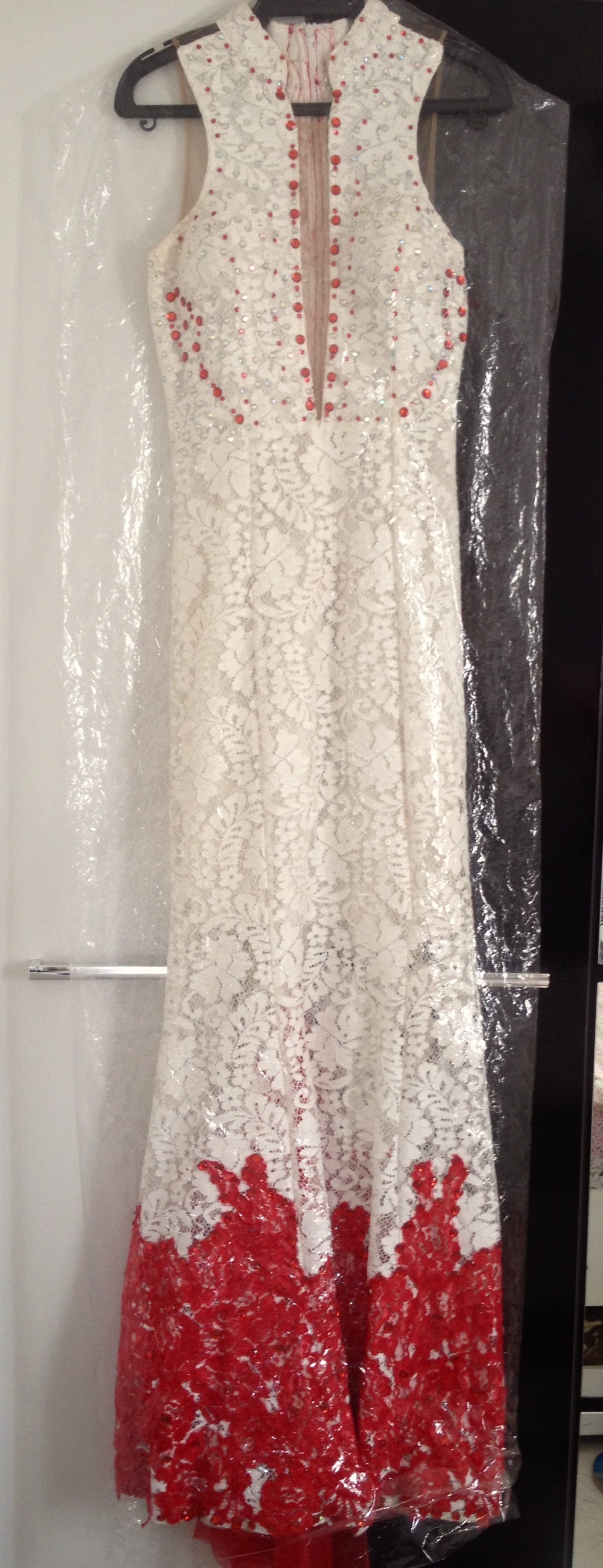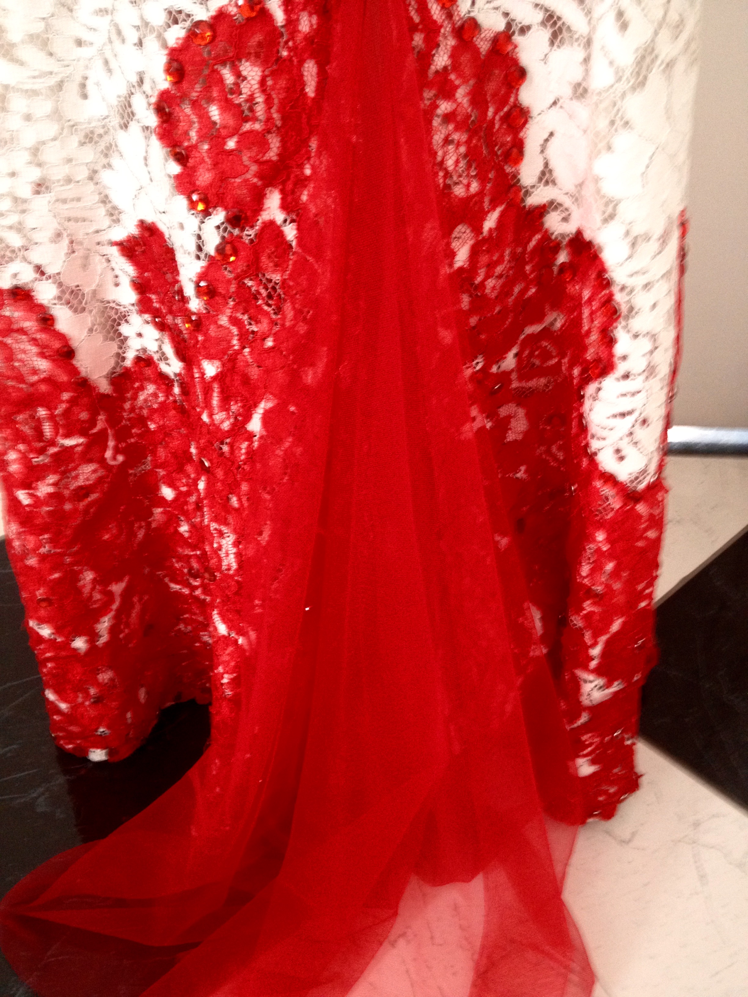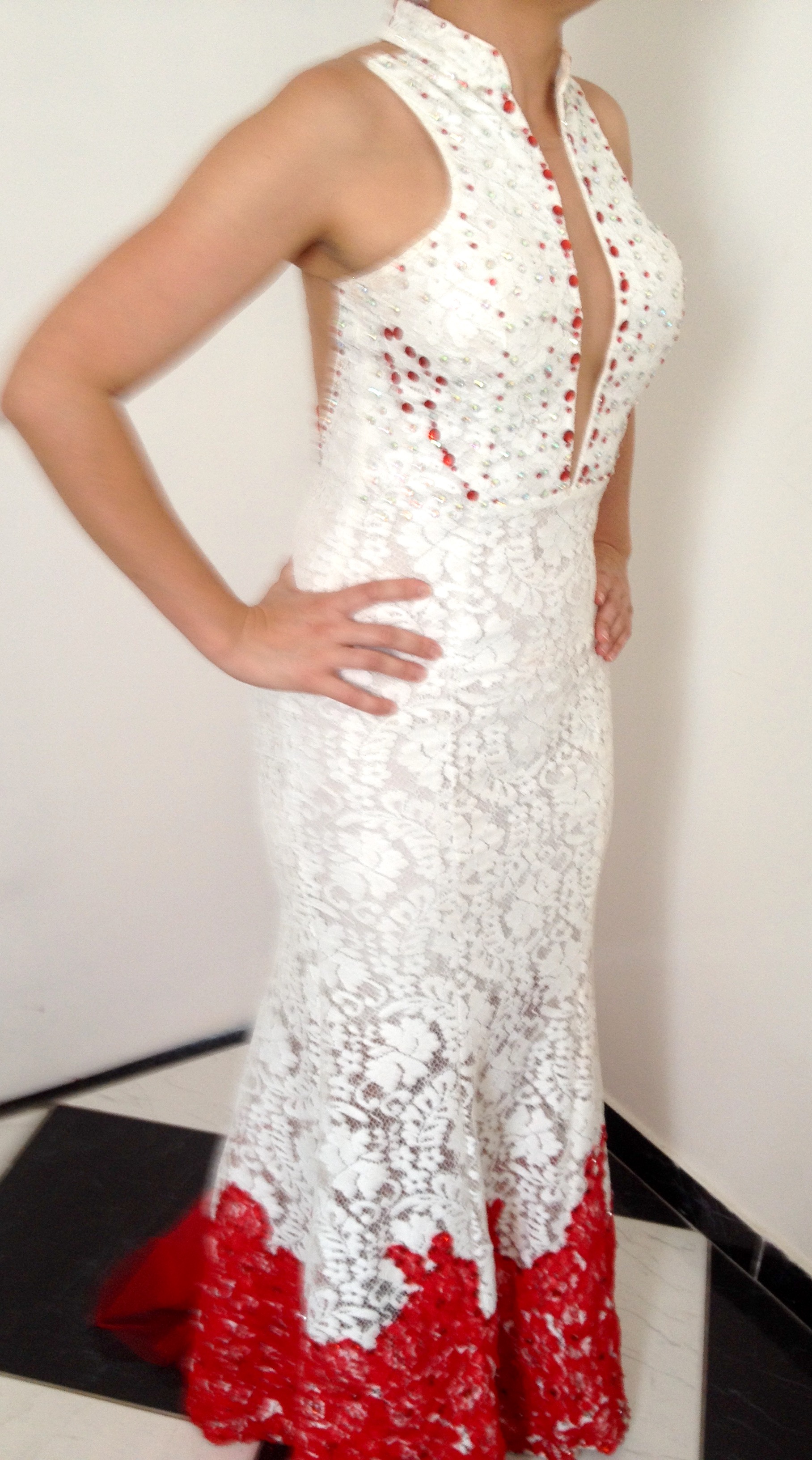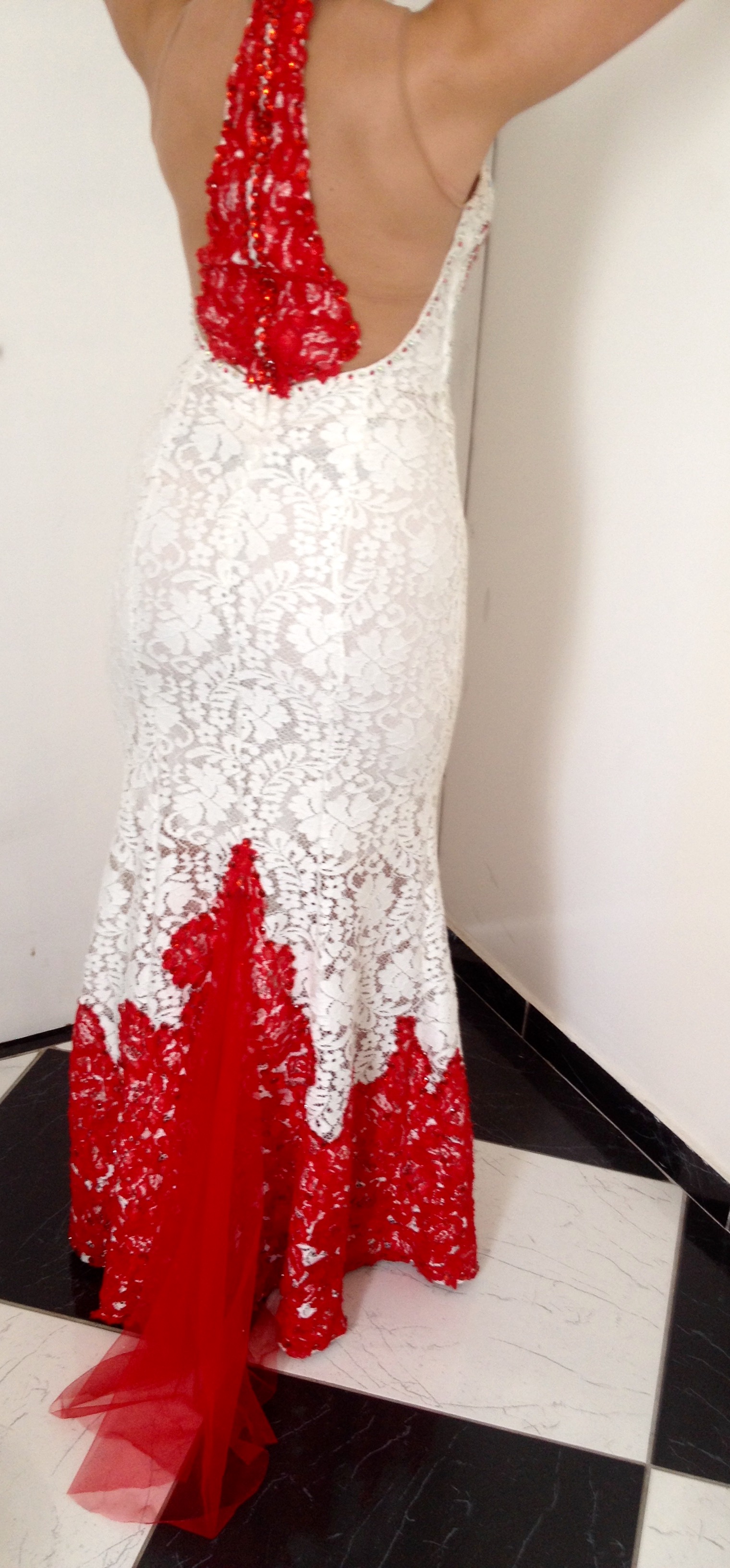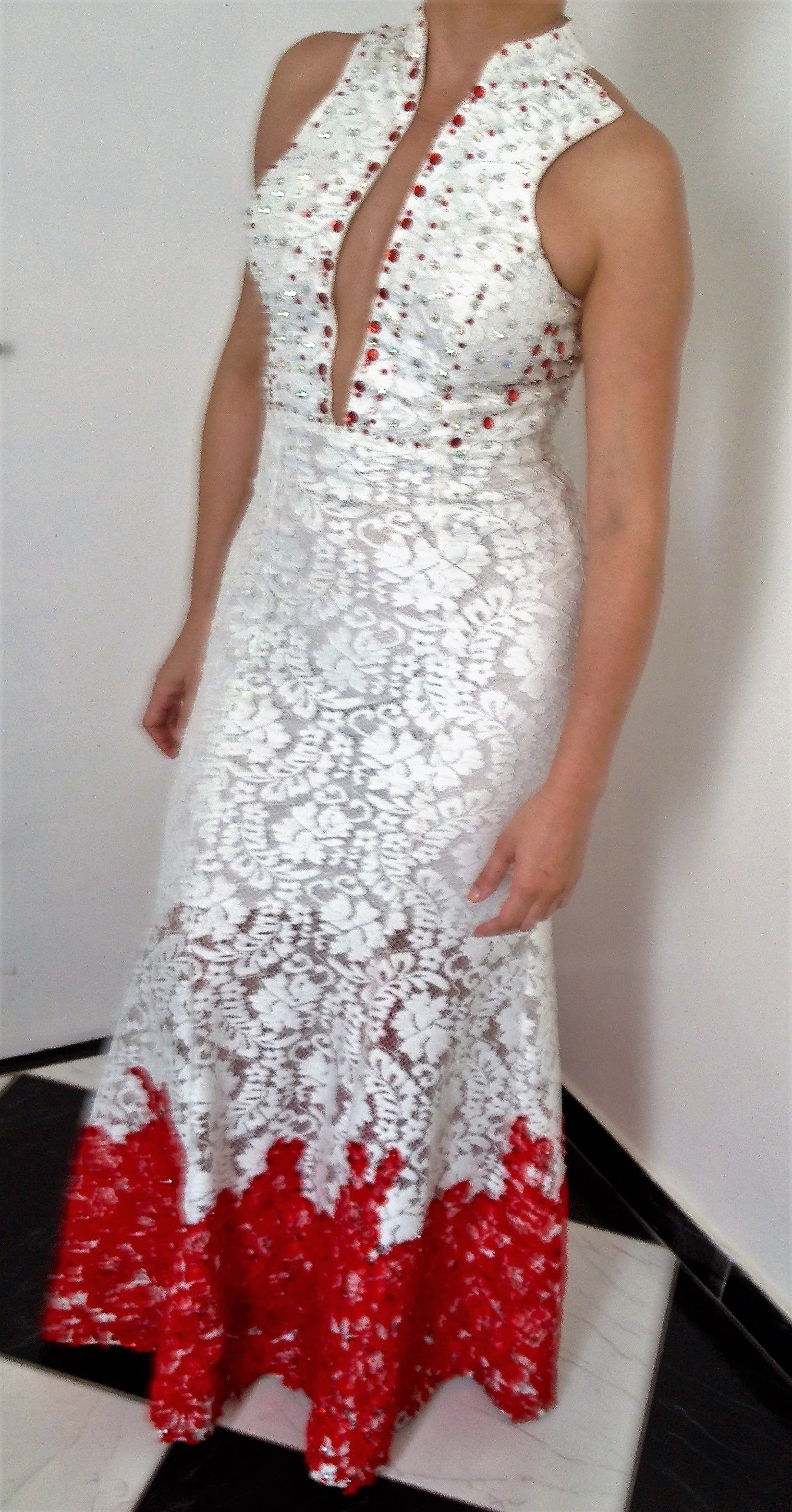 Vestido vermelho e branco no estilo cauda de sereia que modela, alonga e valoriza a silhueta, dando um caimento maravilhoso. Todo confeccionado em renda antialérgica na cor branca e detalhes vermelhos. Contém apliques de pedrarias nas costas, tronco e em toda barra vermelha, todos colocados a mão. Na parte traseira da cauda, possui um detalhe sanfonado em tule vermelho, atribuindo glamour à peça. As costas e o busto apresentam um tecido tule “ilusion nude” (tecido com efeito ilusório que imita a pele). Fechamento com zíper invisível nas costas e bojo para sustentar os seios.