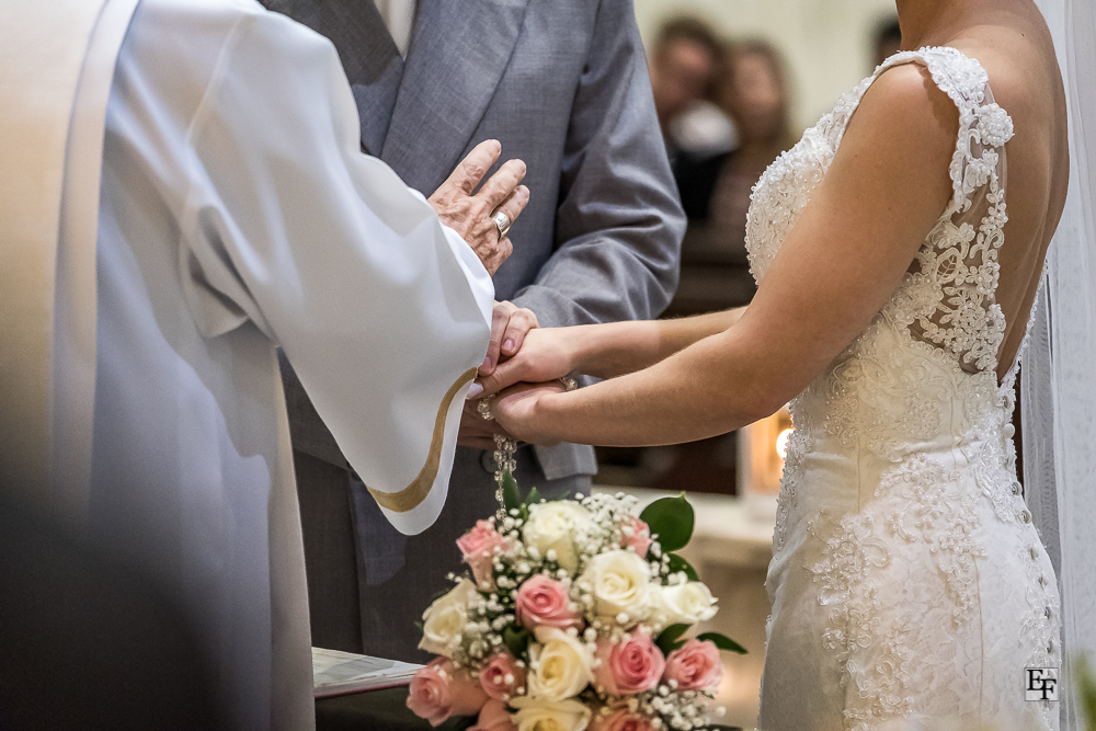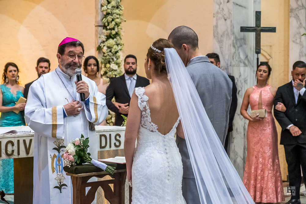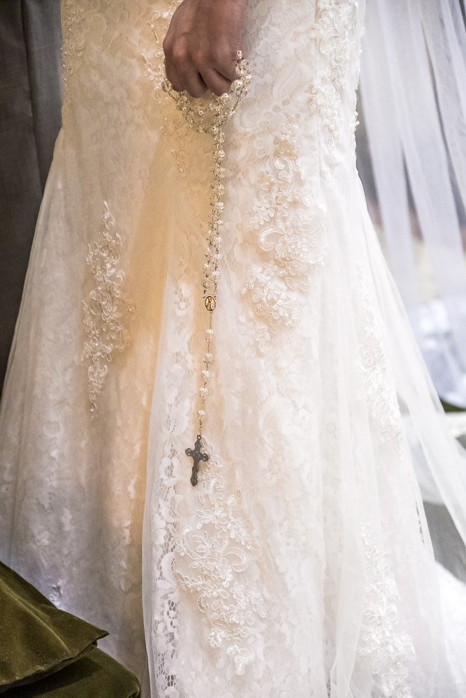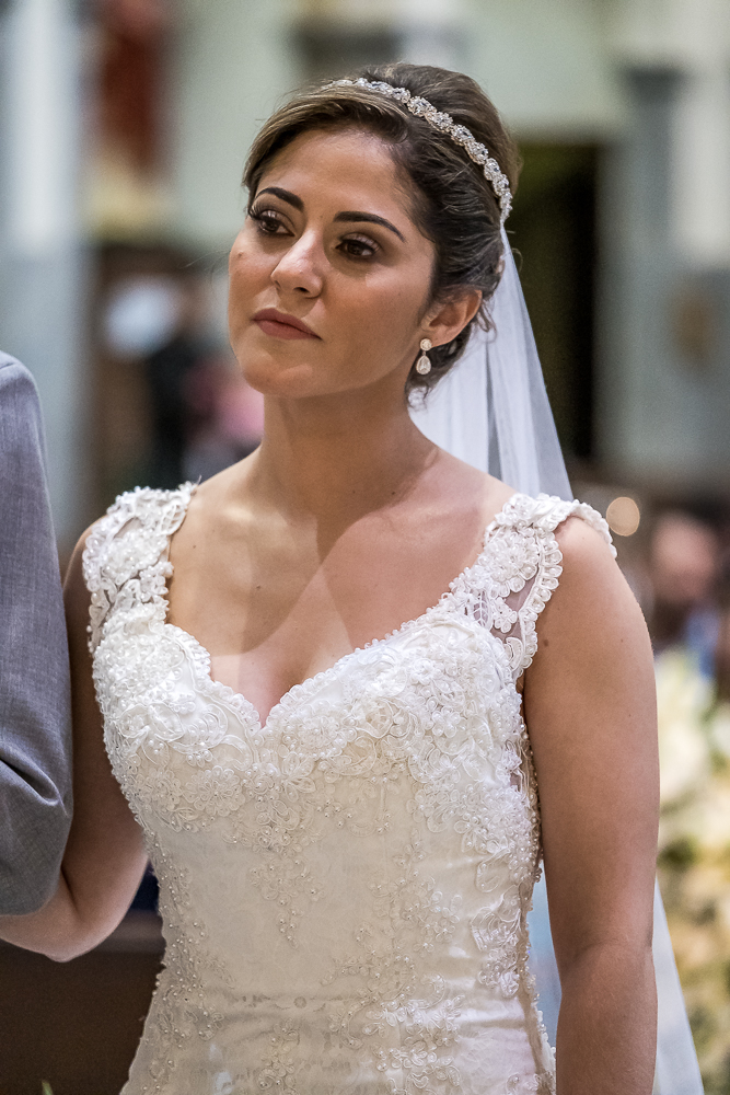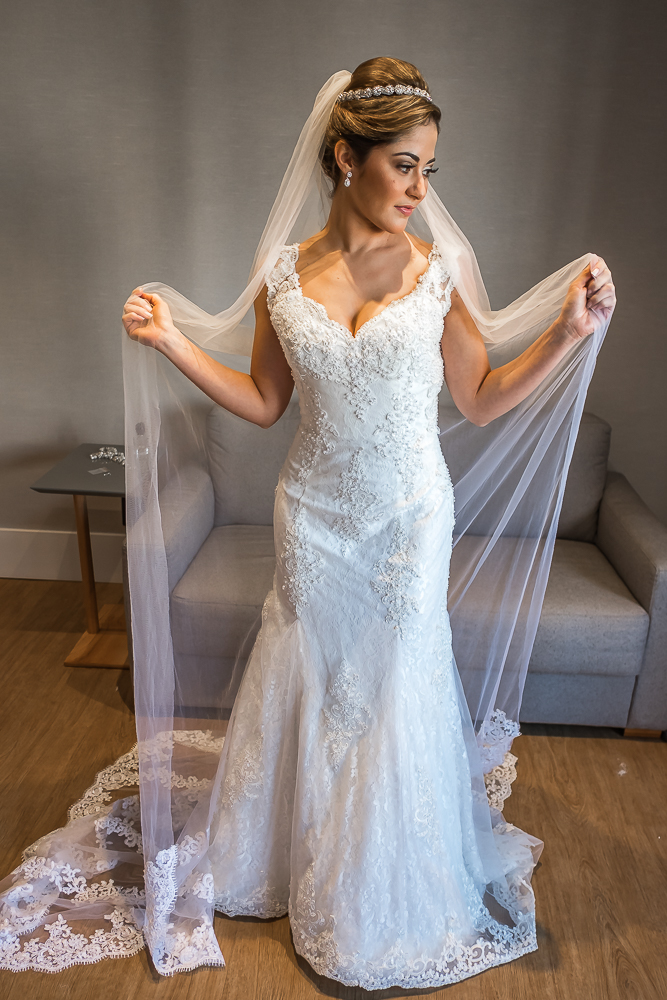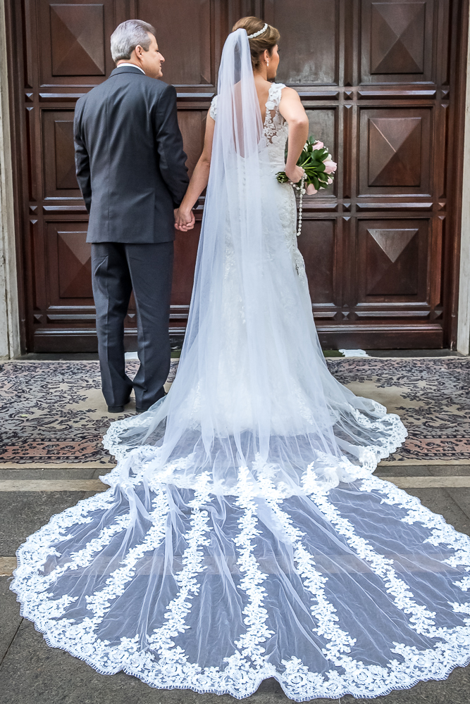 Véu: Longo, com barrado em renda que acompanha o desenho da cauda