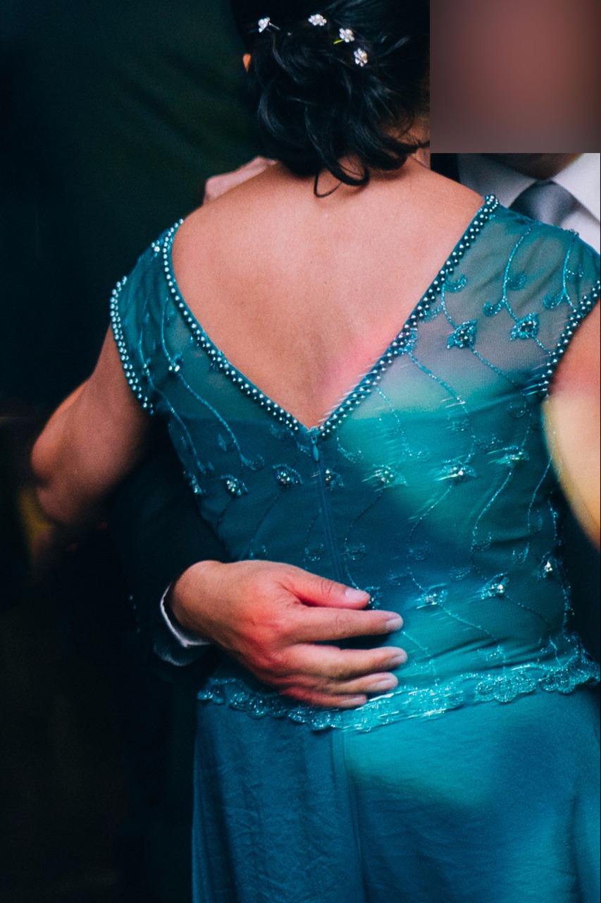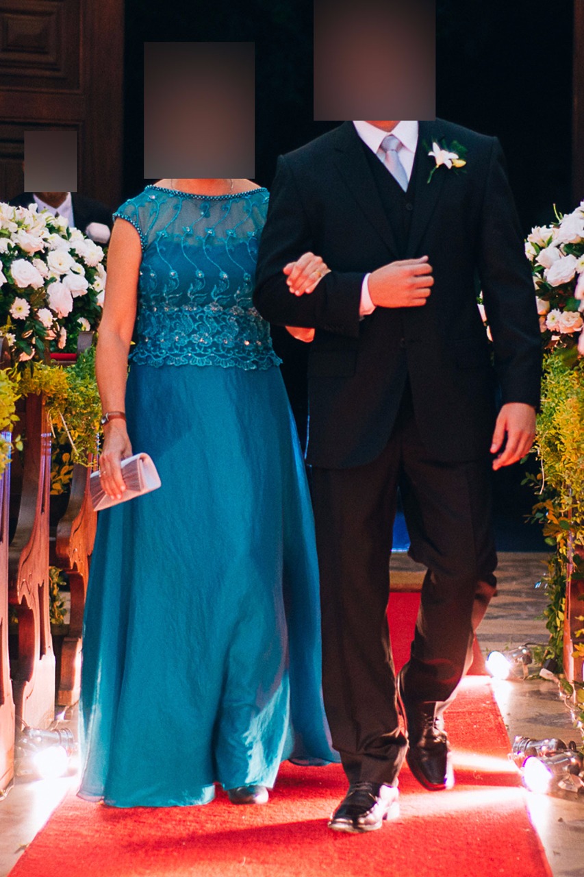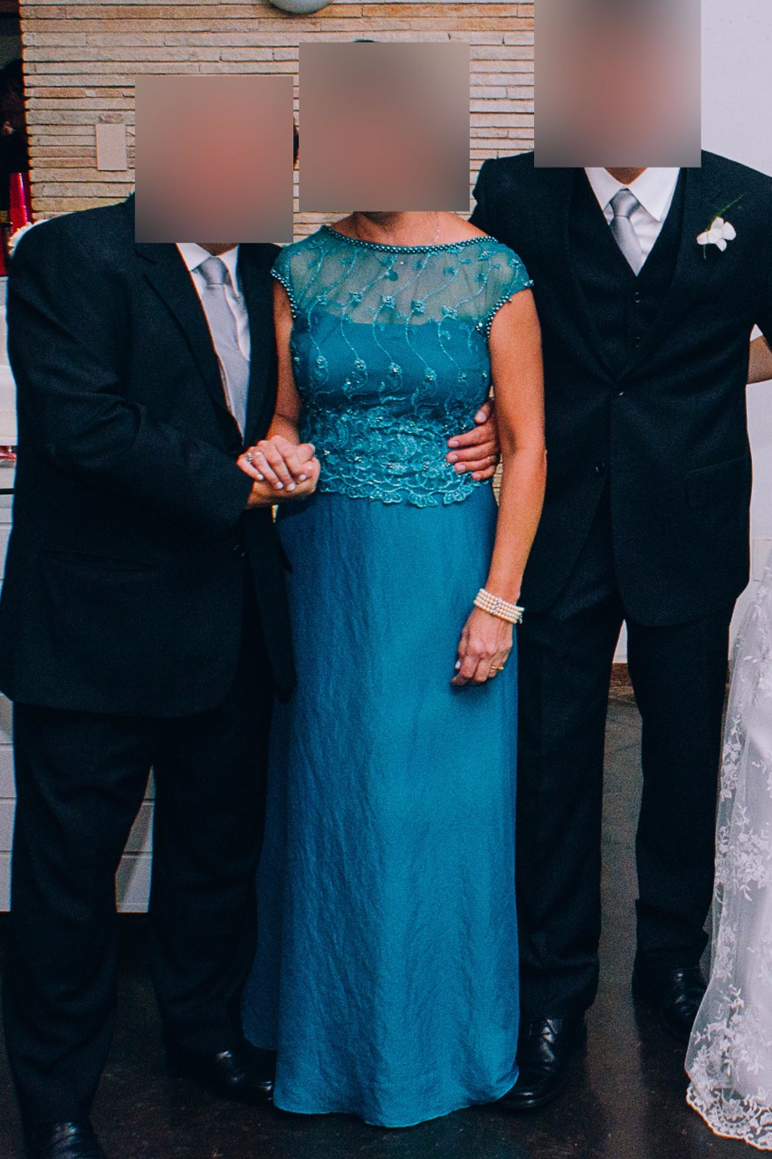 Vestido de festa com o corpo de renda bordada, com detalhes de pérolas na gola,manga e costas. espalhadas no corpo do vestido, acompanhando alguns detalhes do bordado.O decote nas costas é em “V”. O forro acompanha o movimento da saia, que é solto e leve. Usado só uma vez. Caimento perfeito.Veste muito bem.Sucesso garantido numa bela festa!