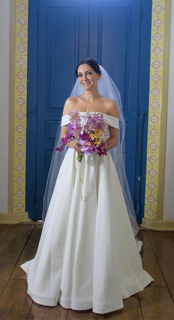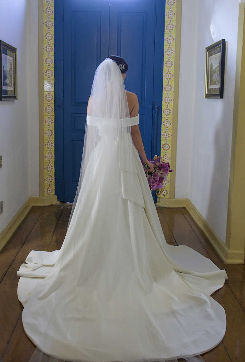 Vestido sob medida, tomara que caia, em crepe dublado, com dobraduras na parte posterior, aplicação de rechilieu exclusivo no corpete. cauda retrátil de 1,5 m, por baixo do vestido. véu de tule liso incluso, com pala removível.