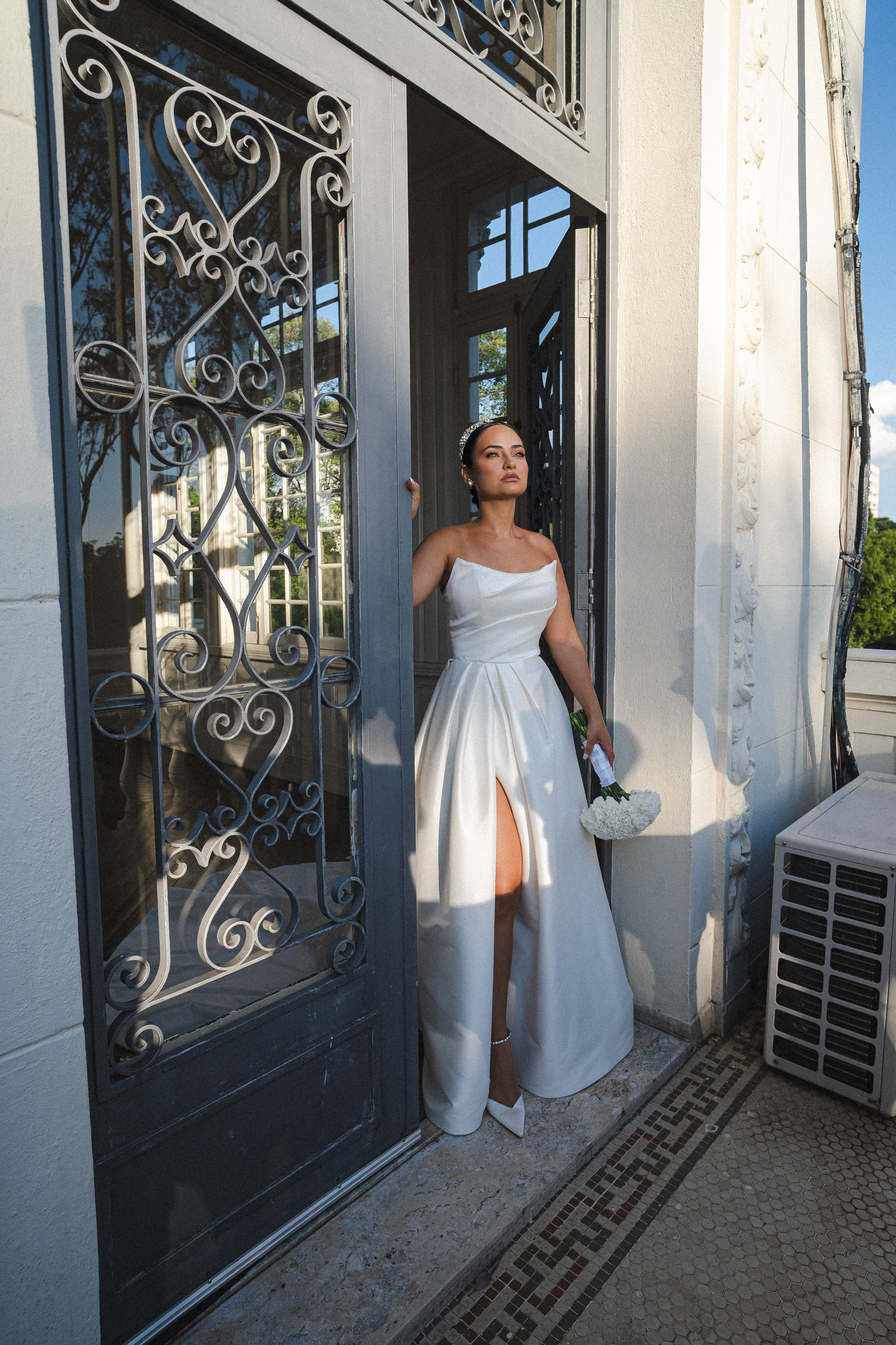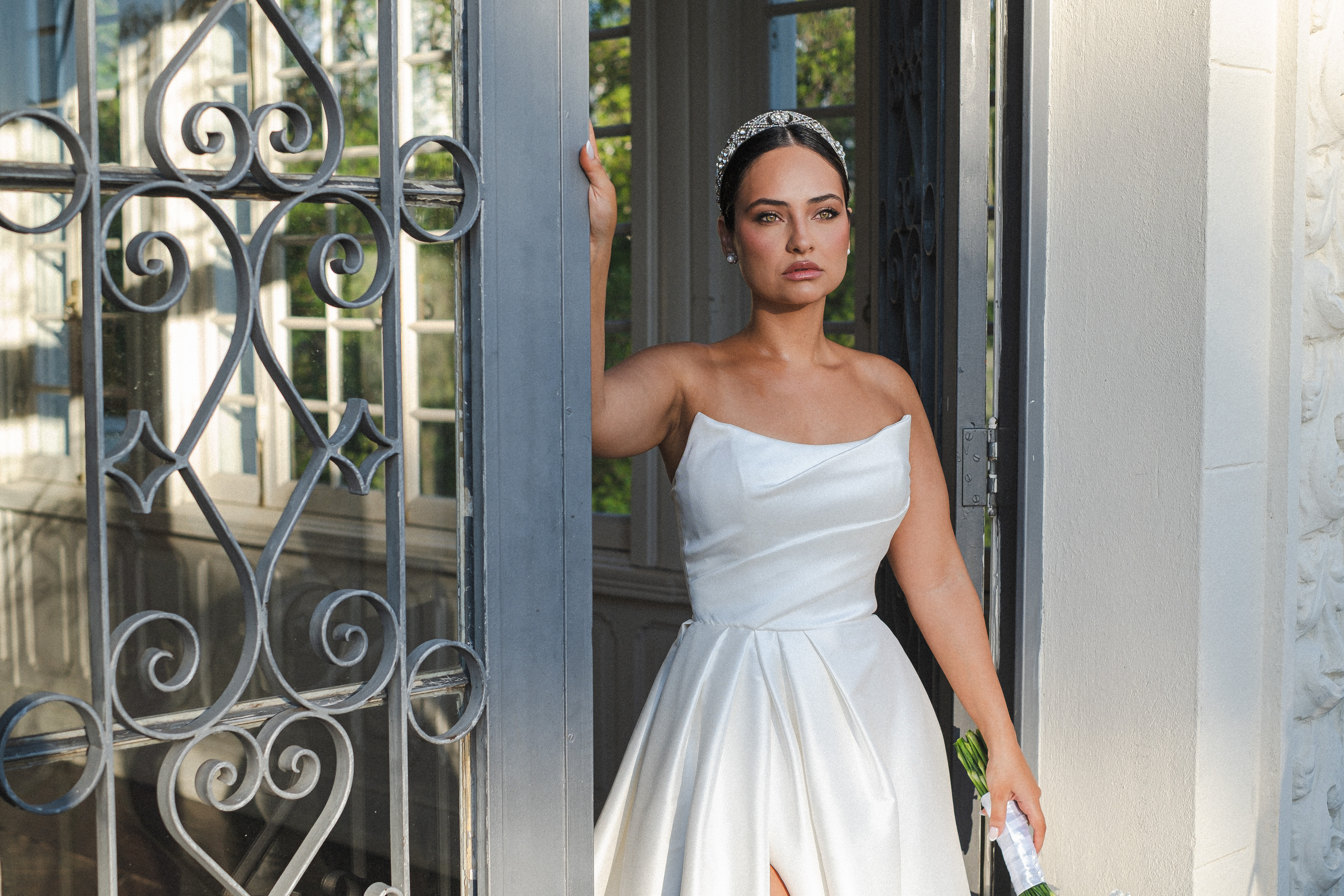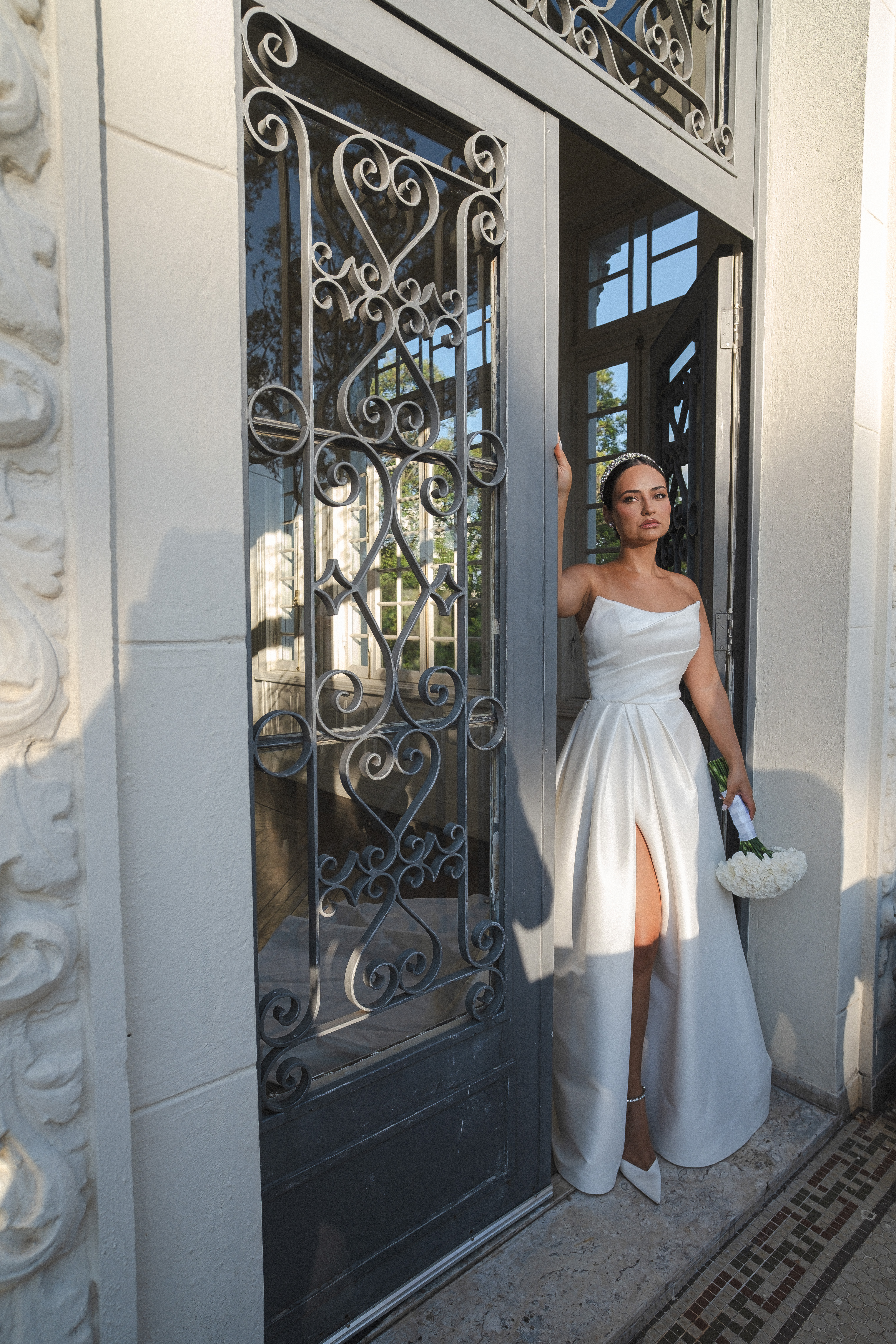 Vestido de noiva Casamarela, com fenda, tomara que caia e modelo estruturado. O detalhe geométrico no decote adiciona uma aura de modernidade e estilo, escapando um pouco do tradicional.