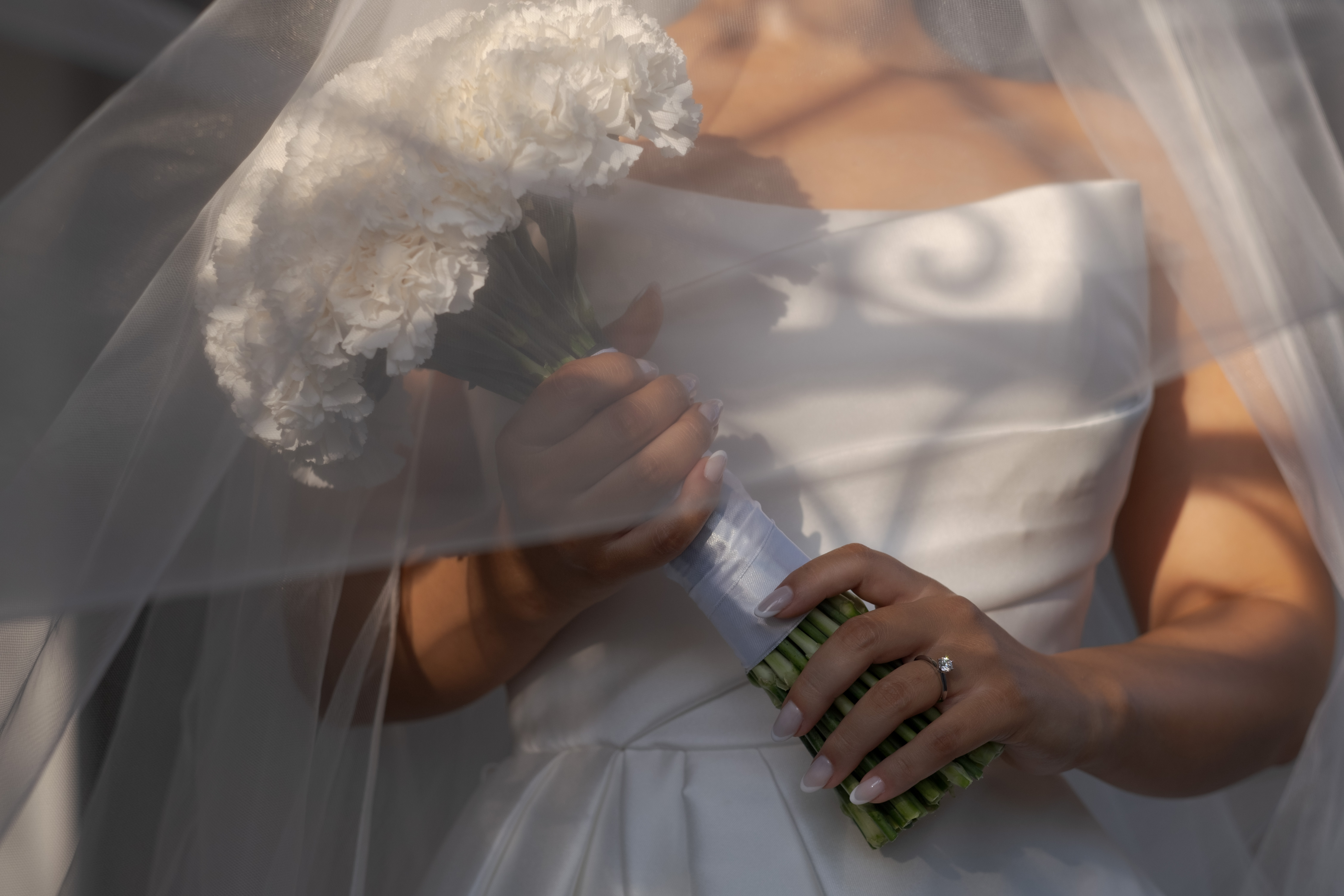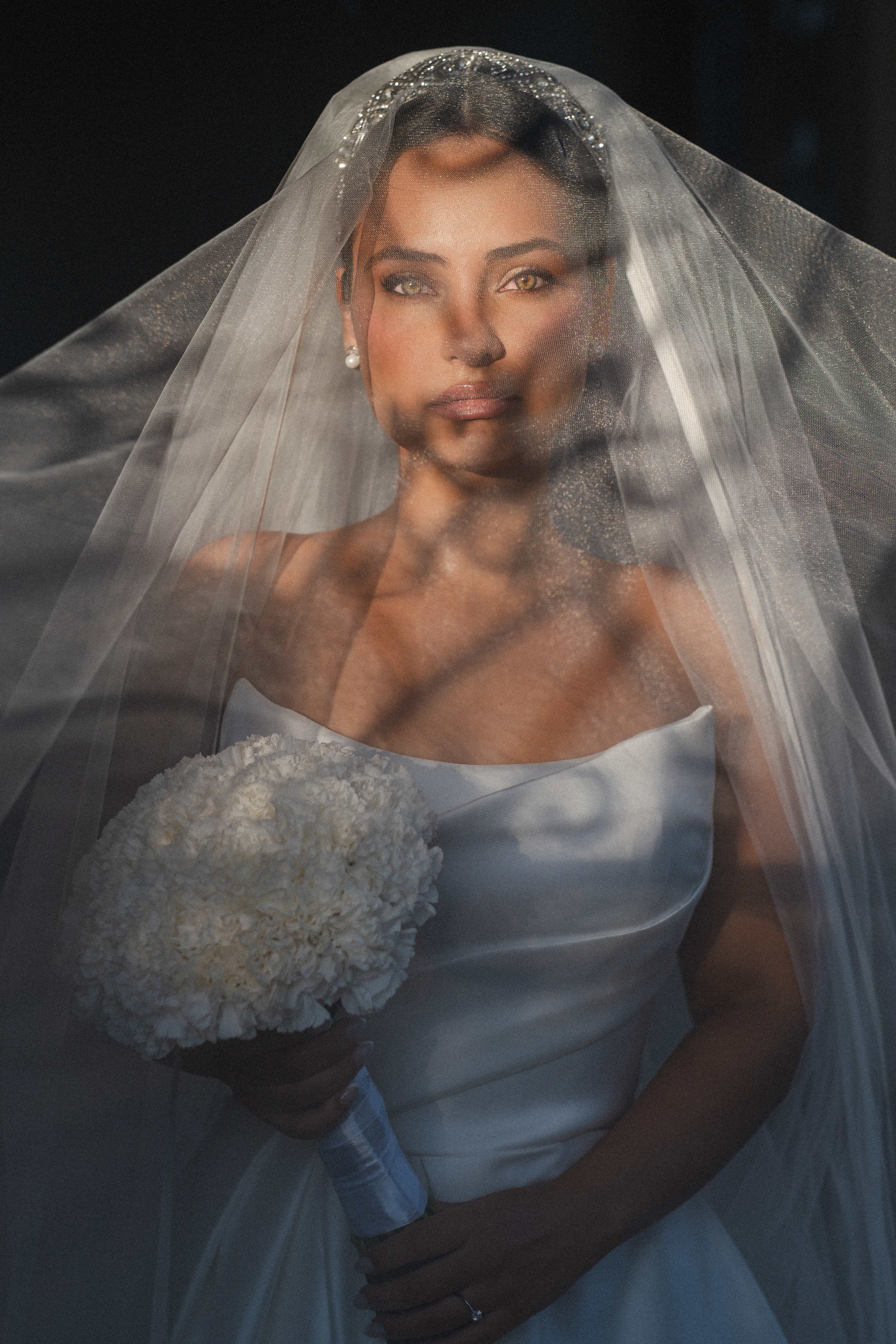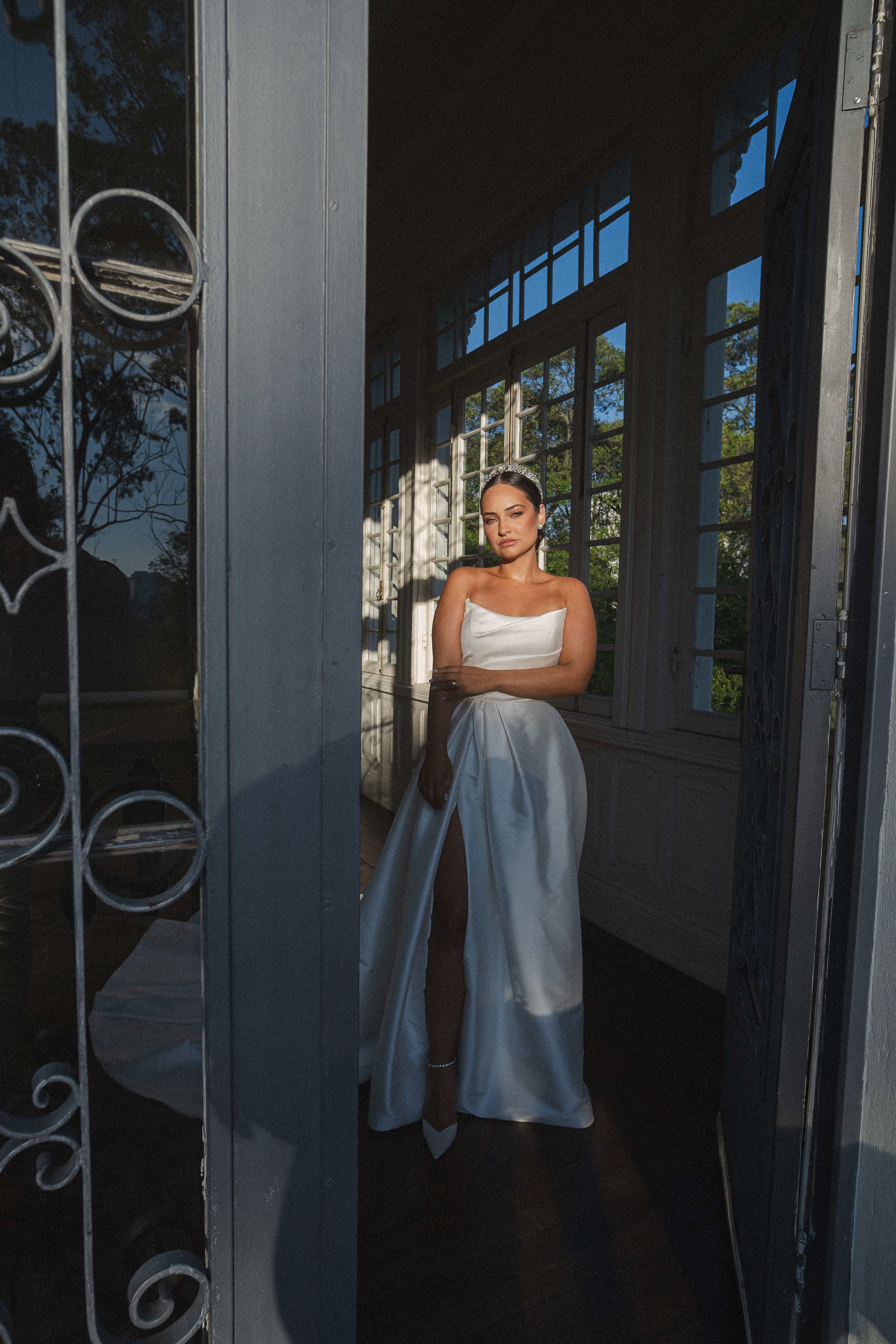 Vestido de noiva Casamarela, com fenda, tomara que caia e modelo estruturado. O detalhe geométrico no decote adiciona uma aura de modernidade e estilo, escapando um pouco do tradicional.