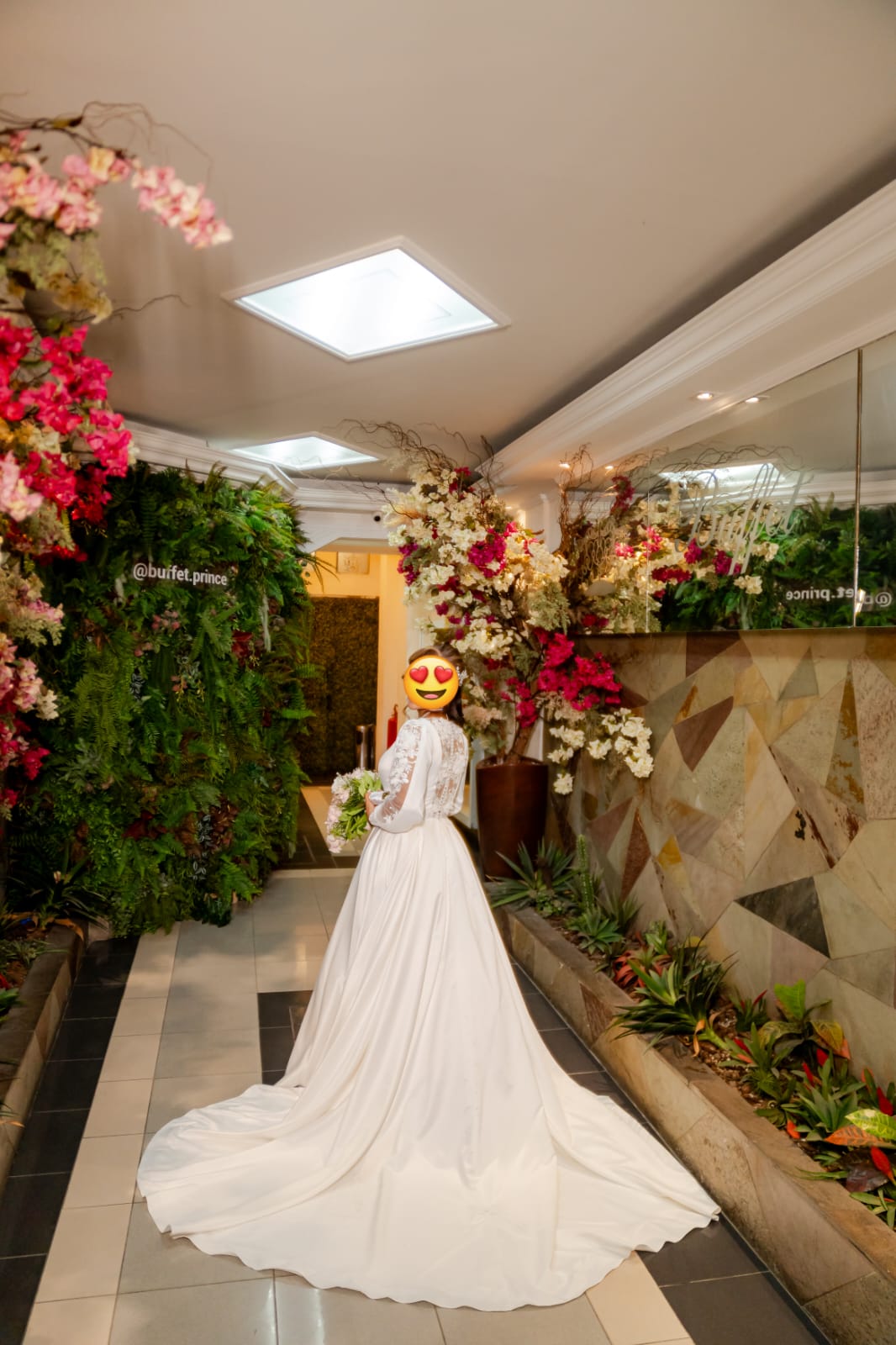 A saia ampla com cauda média traz imponência e romantismo, perfeito para noivas que desejam marcar esse momento especial com graciosidade. O vestido também conta com mangas longas e detalhes em renda, elevando ainda mais sua beleza e sofisticação.