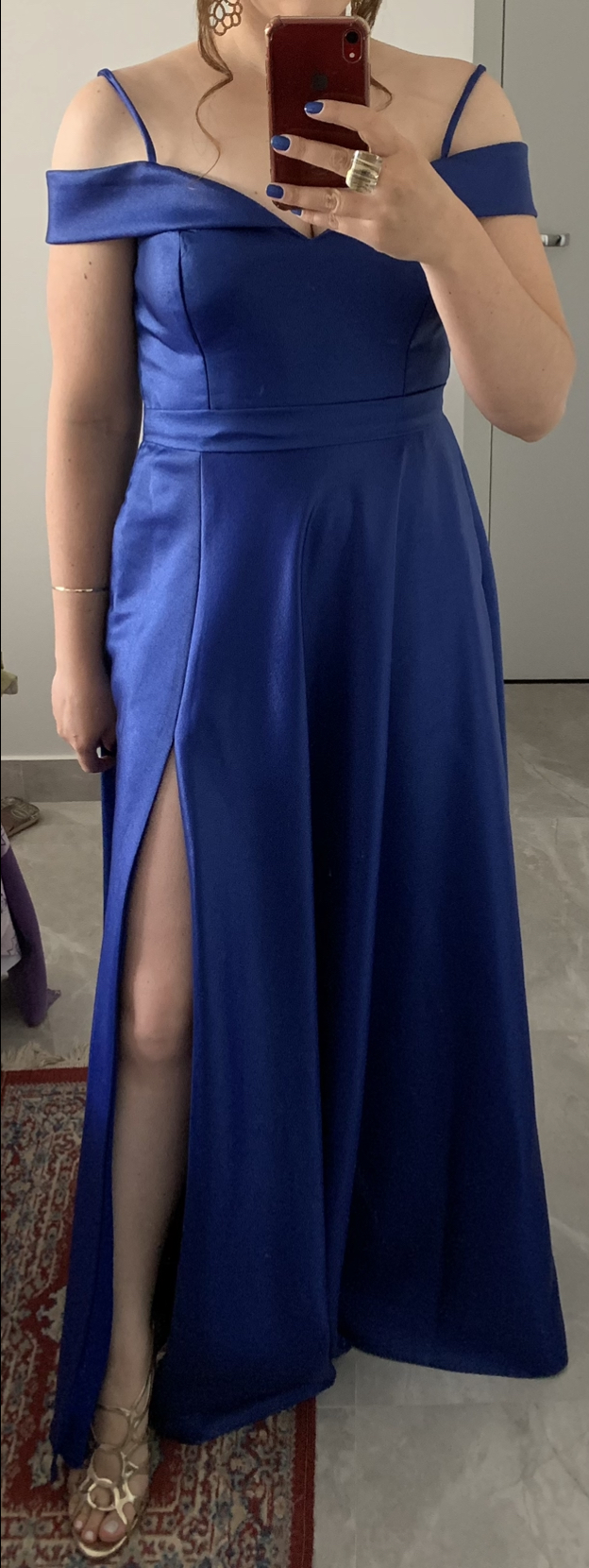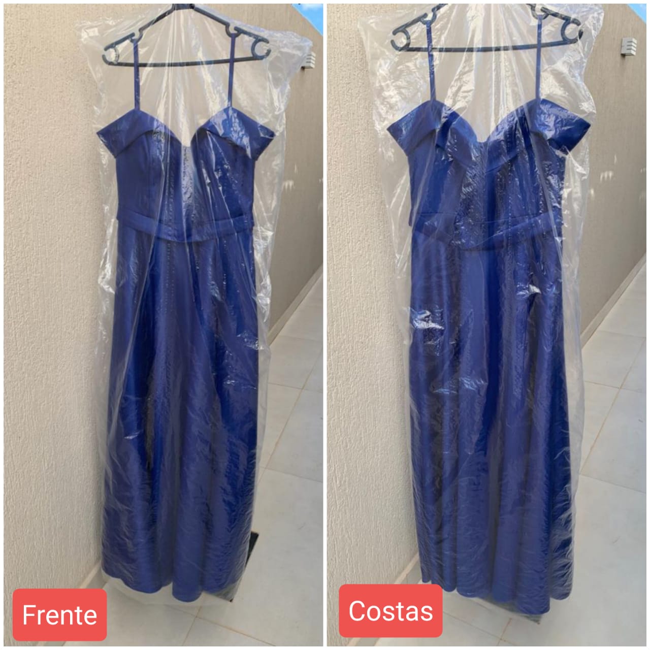 Tamanho G (veste número 42), com 98cm de busto, 80cm de cintura, 110cm de quadril, e comprimento de 1,60 metro.