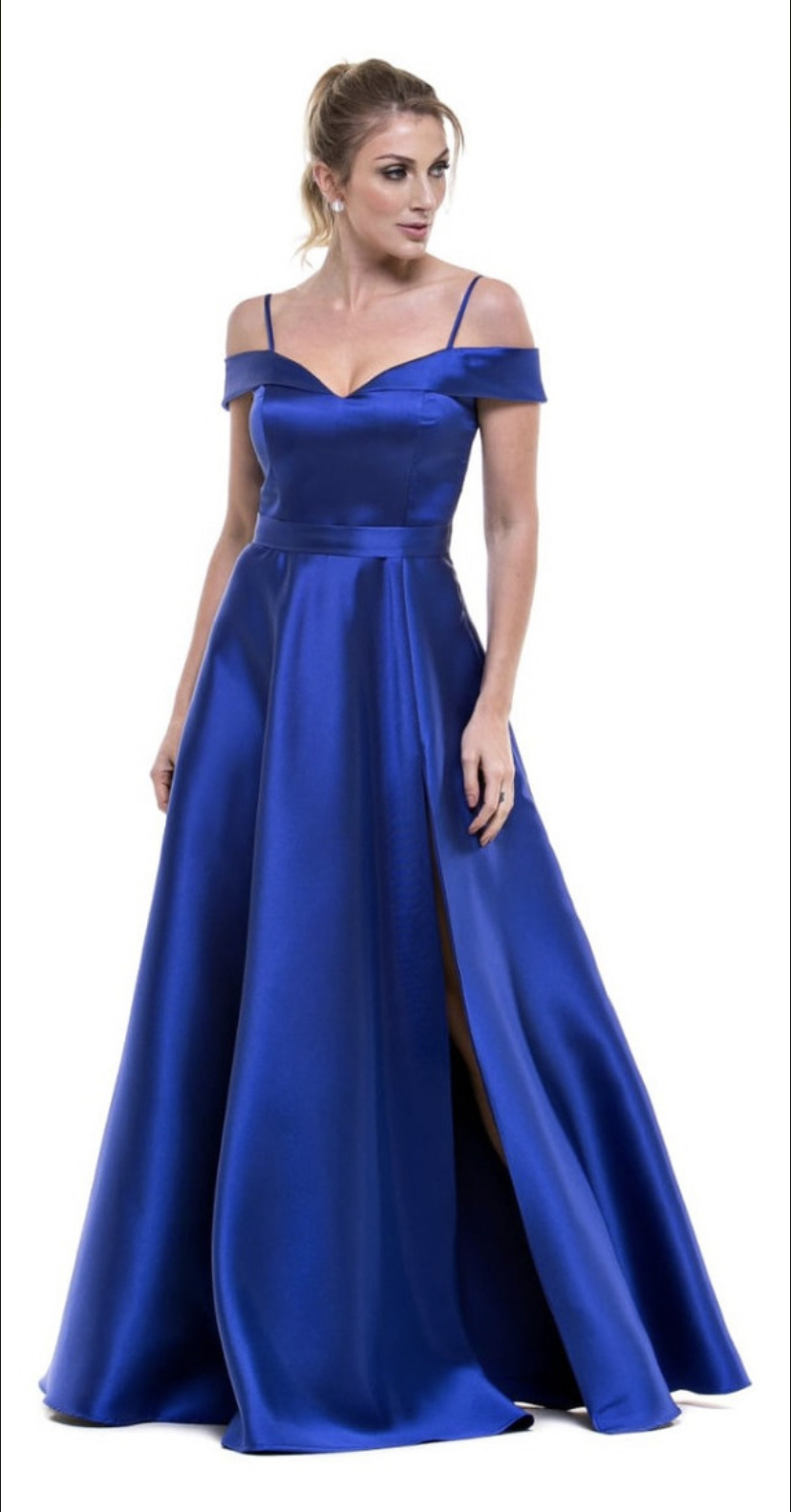 Vestido zibeline em evasé, com bojo, decote ombro a ombro, fenda lateral.