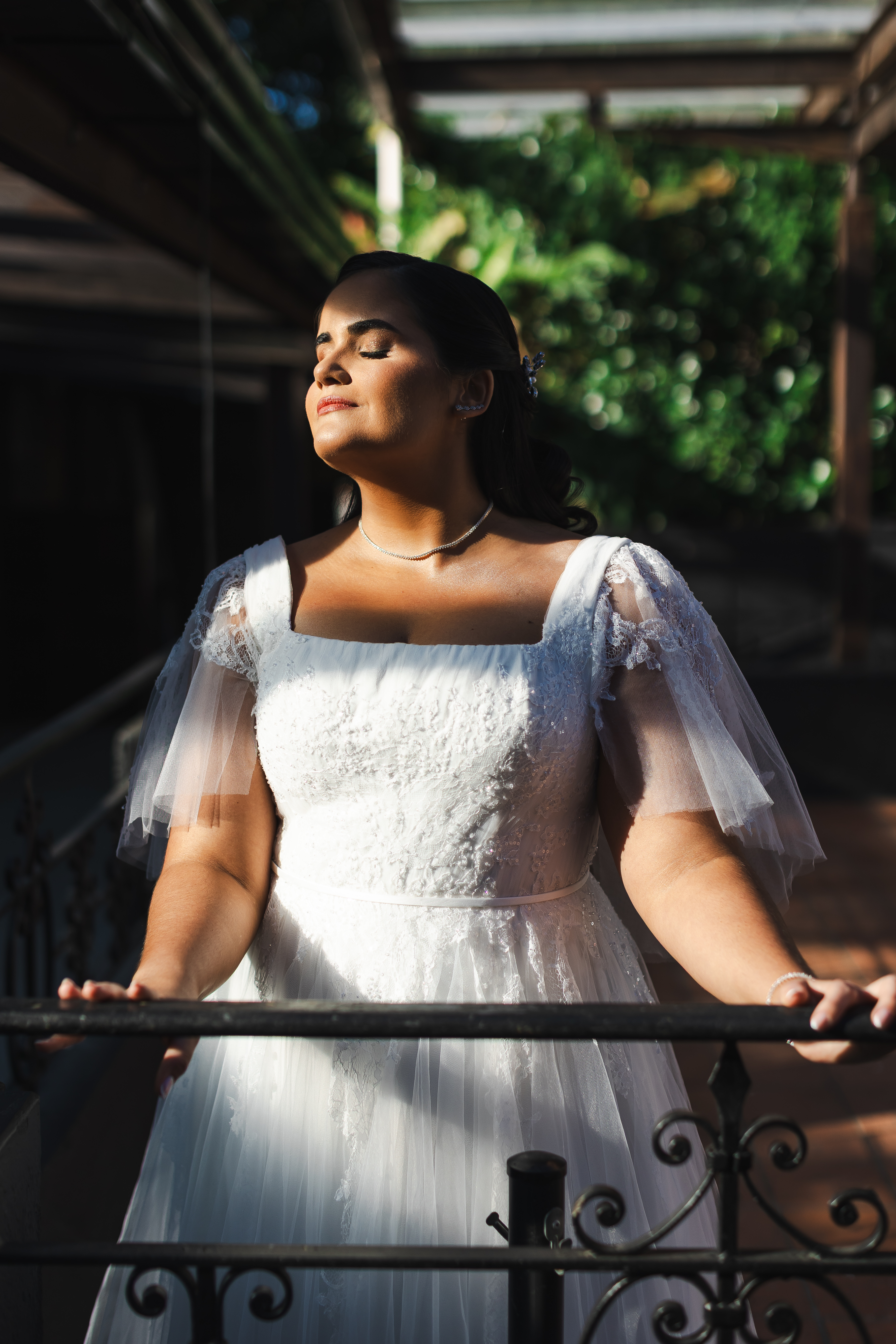 Possui manga em tule e renda chantilly removível, podendo ser retirada e ficar somente a alça.