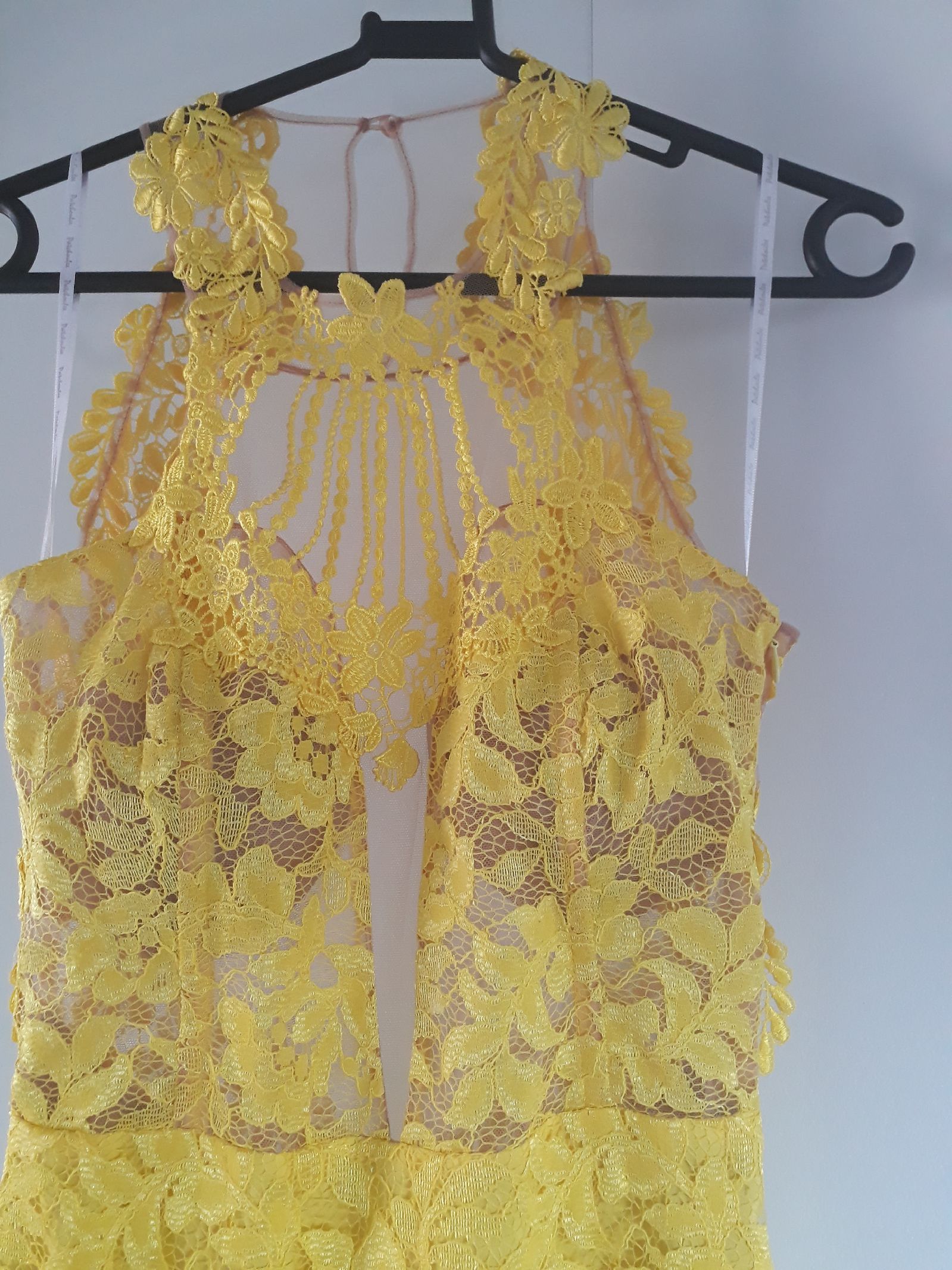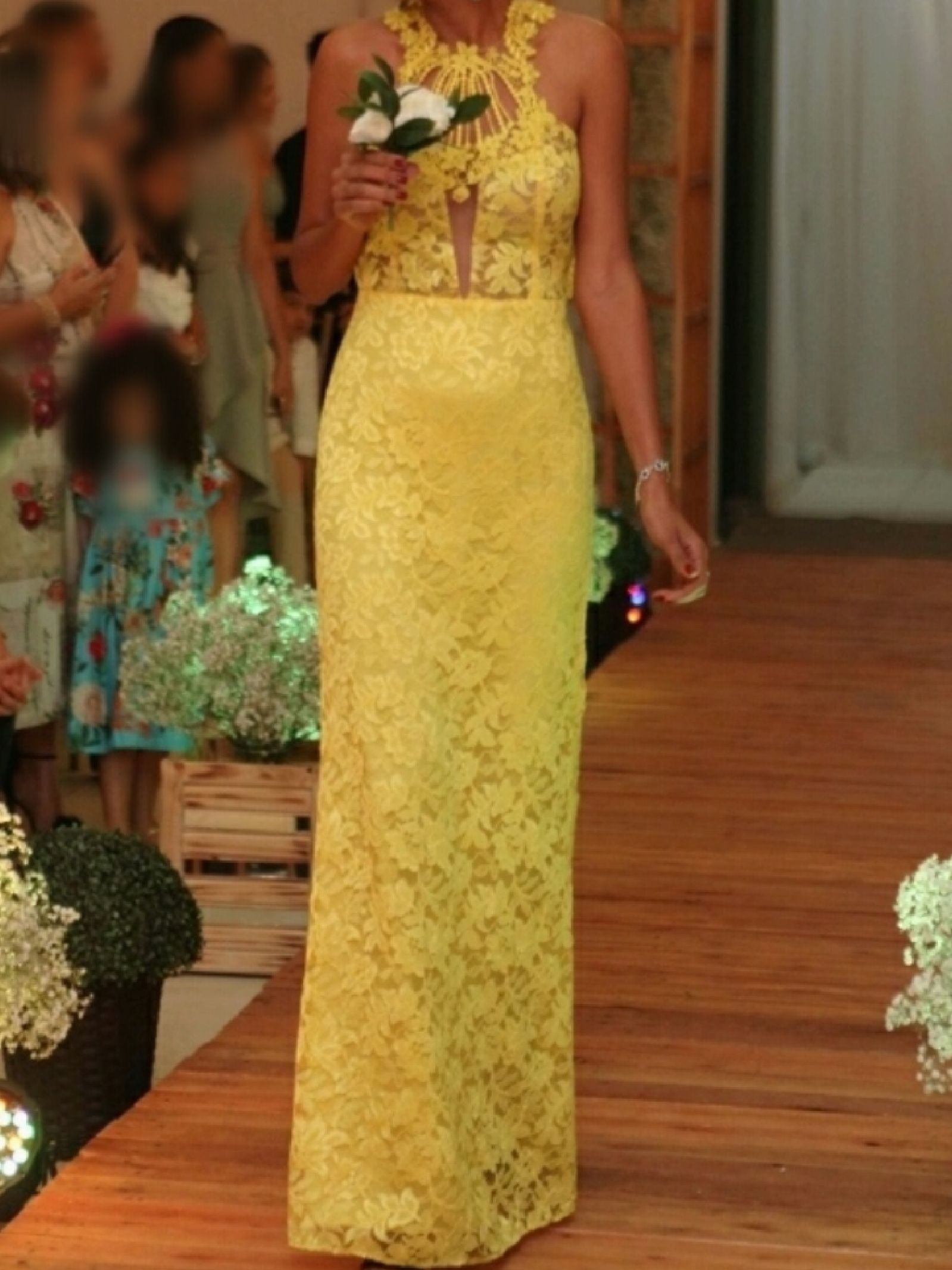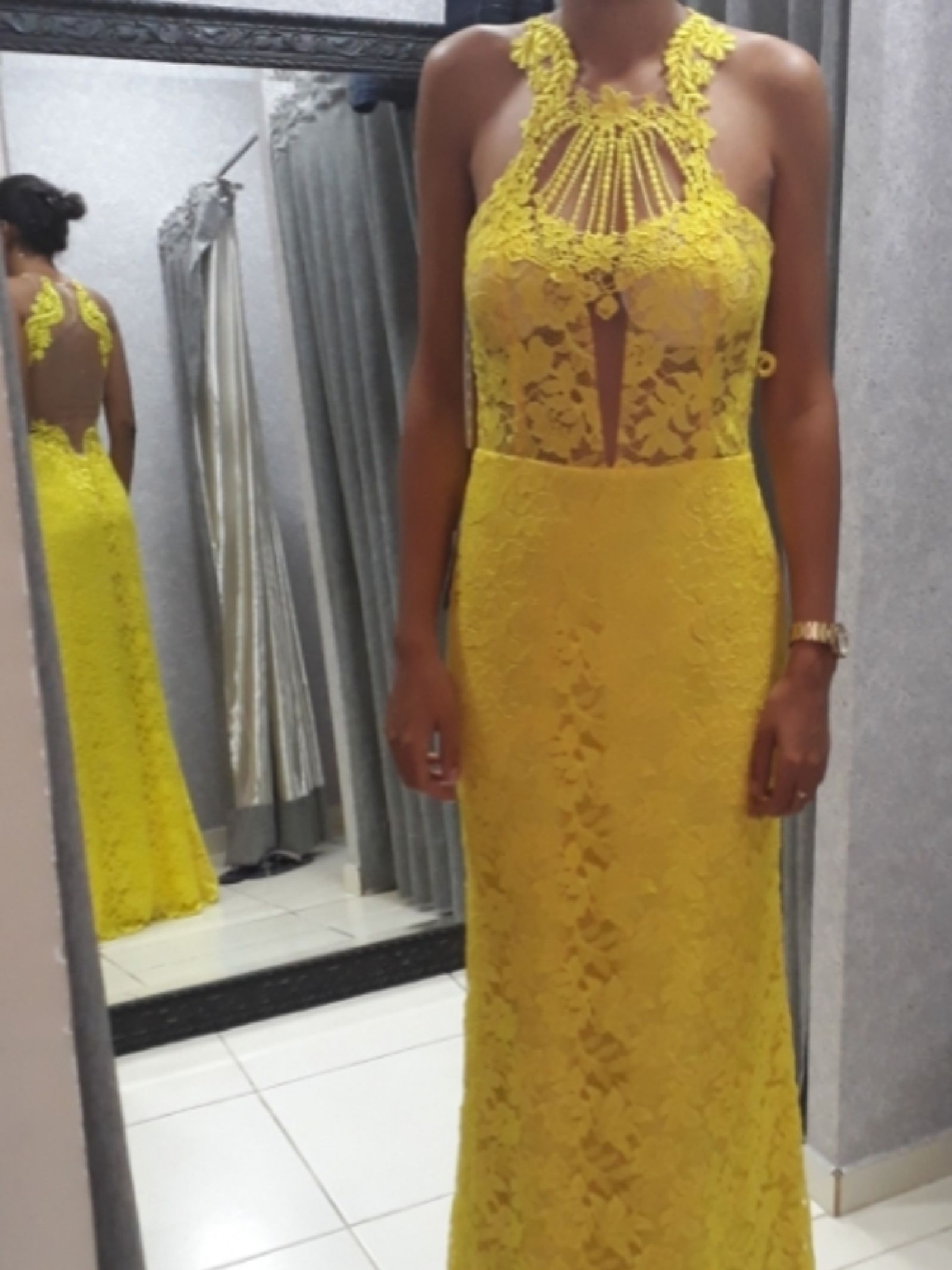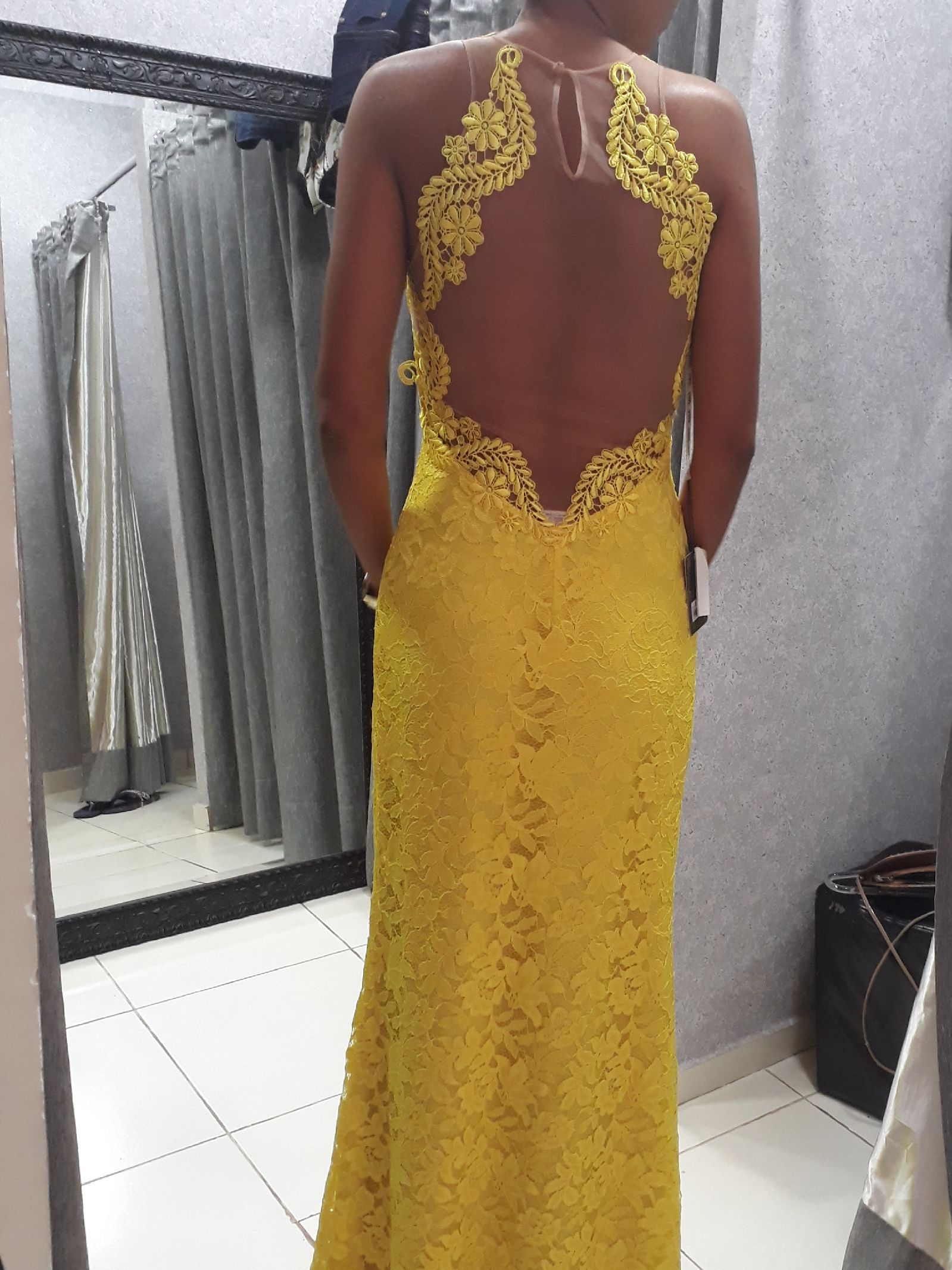 Vestido longo, amarelo, usado rapidamente uma única vez. Costas no tule, com Belo decote. Extremamente delicado.