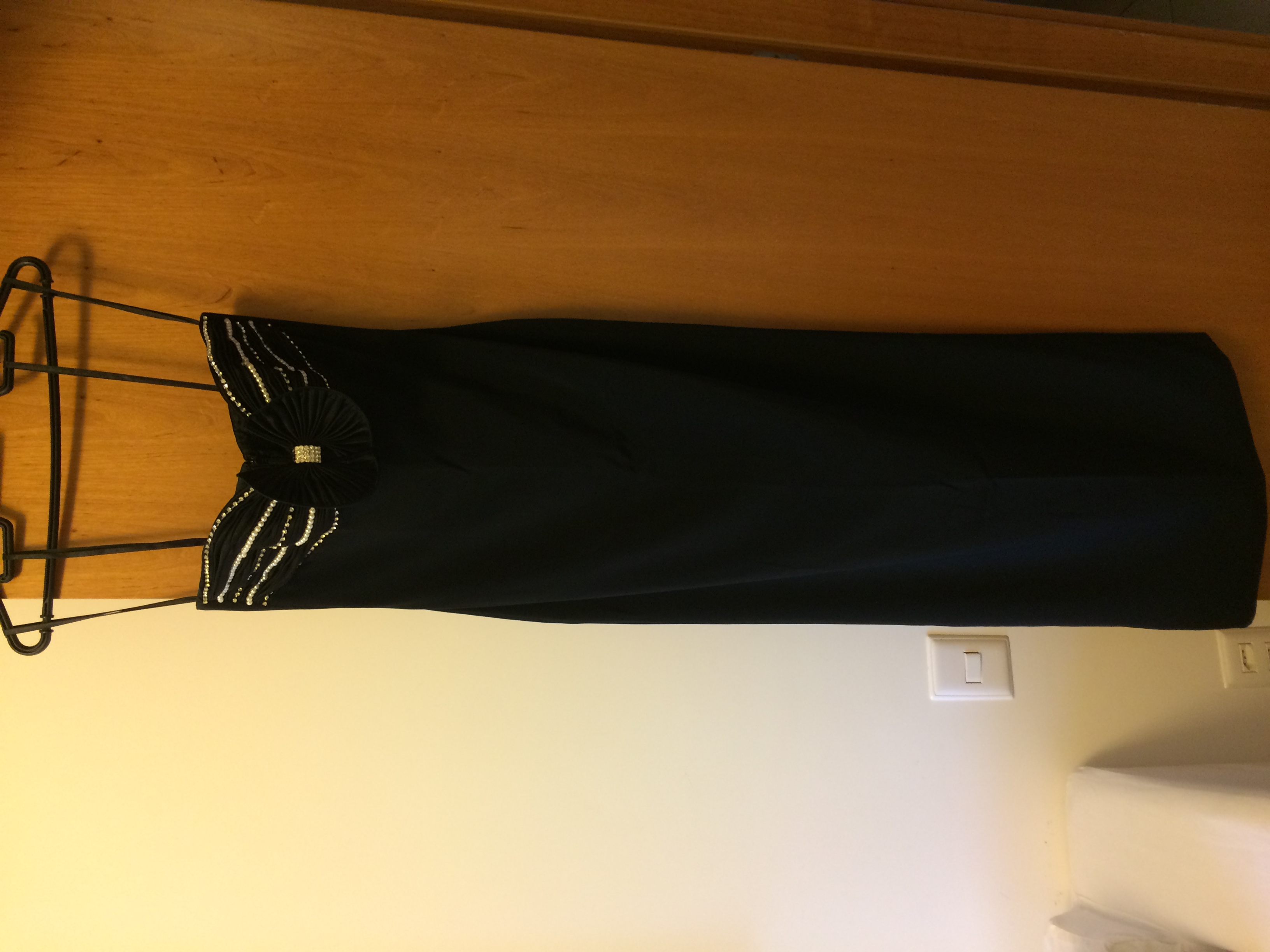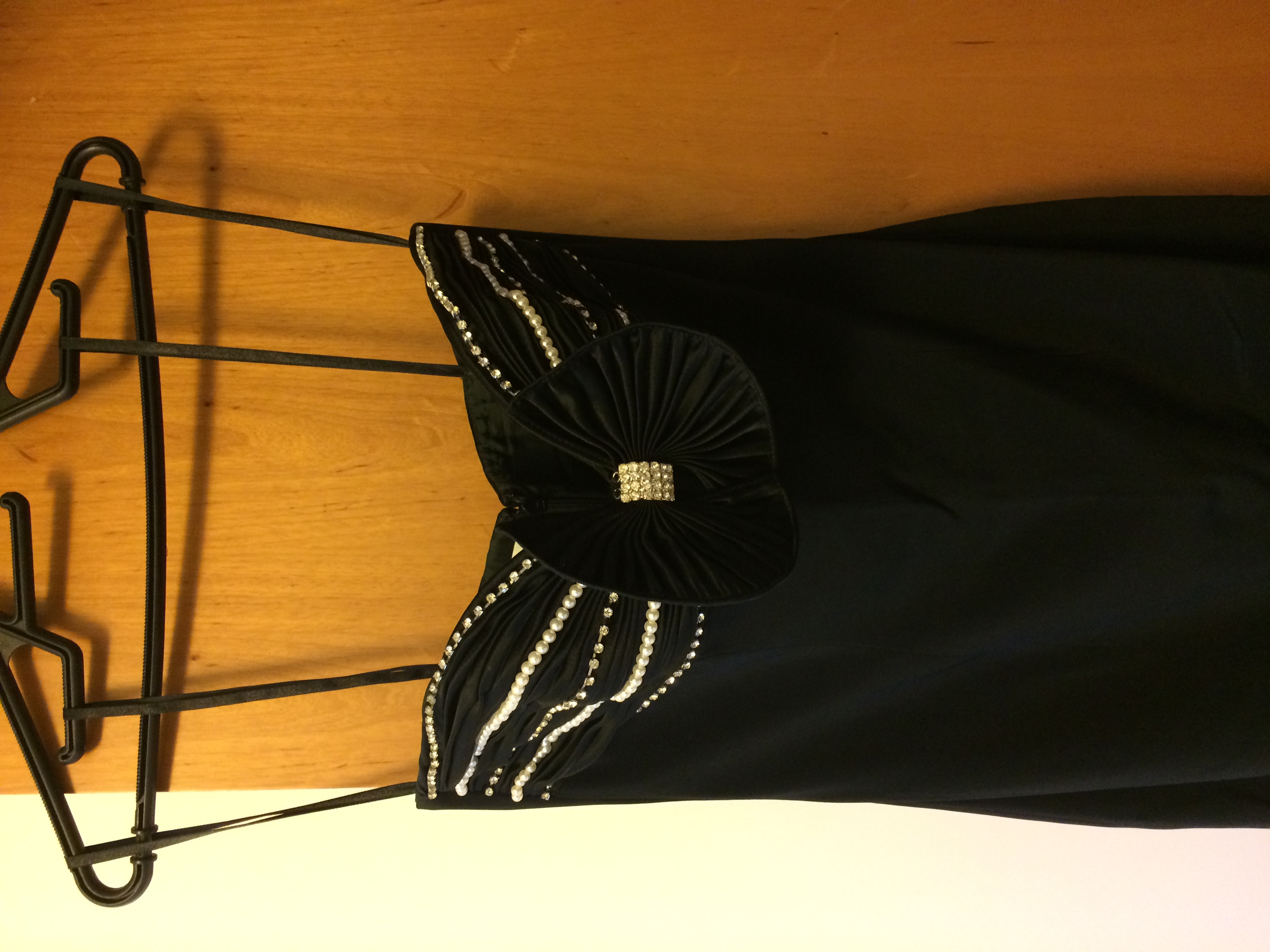 vestido longo preto, tomara que caia, com bordados em pérolas e strass; tamanho 8