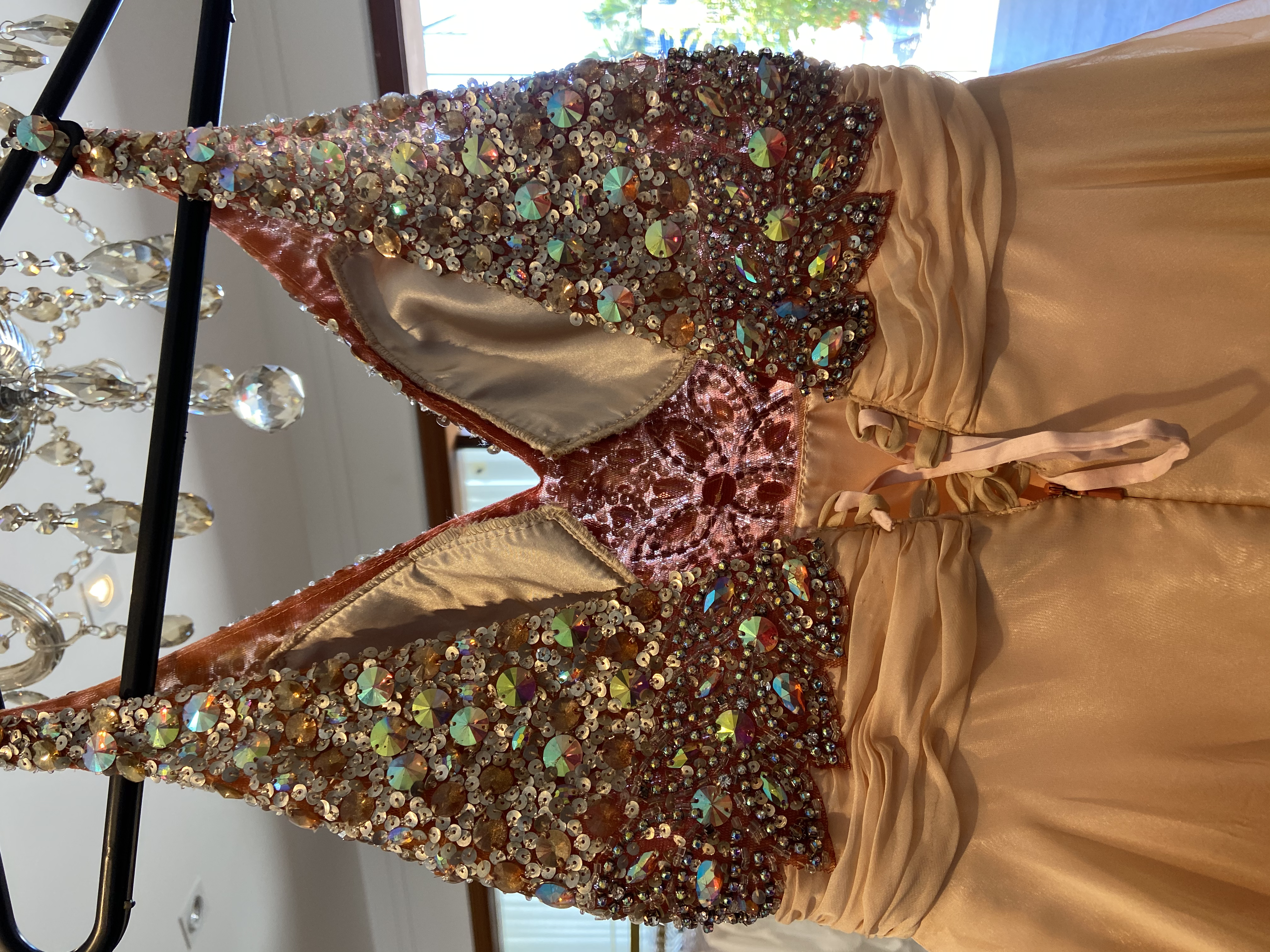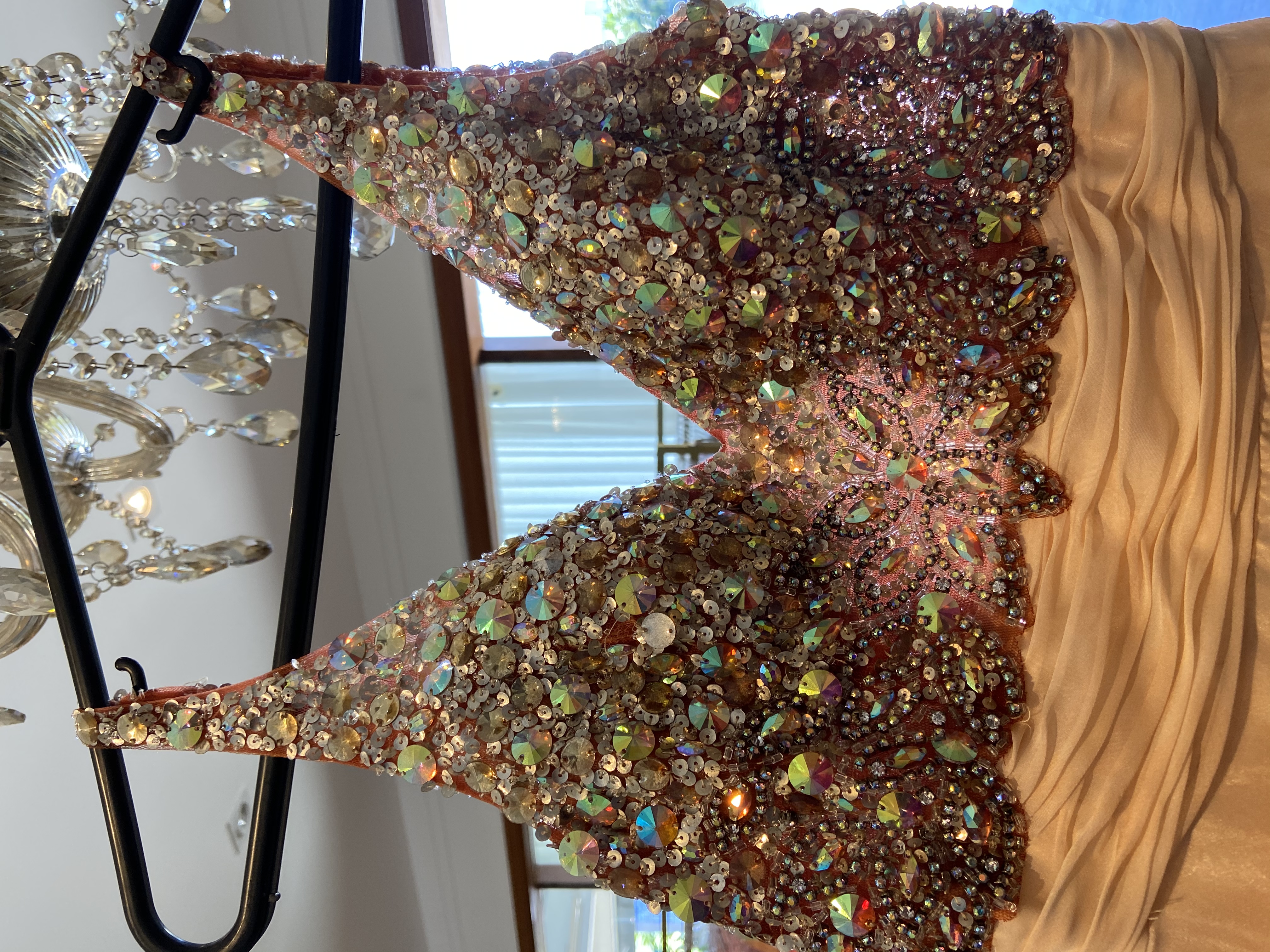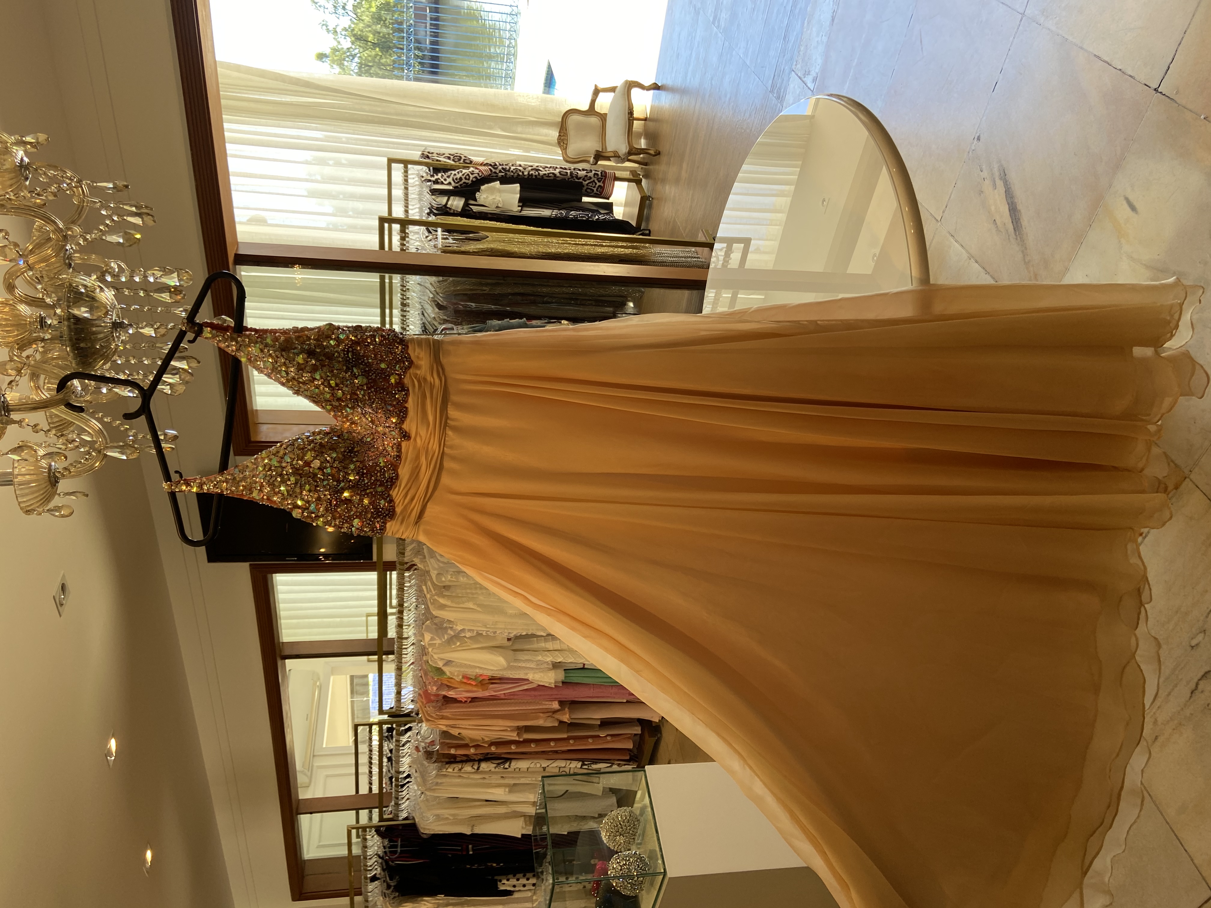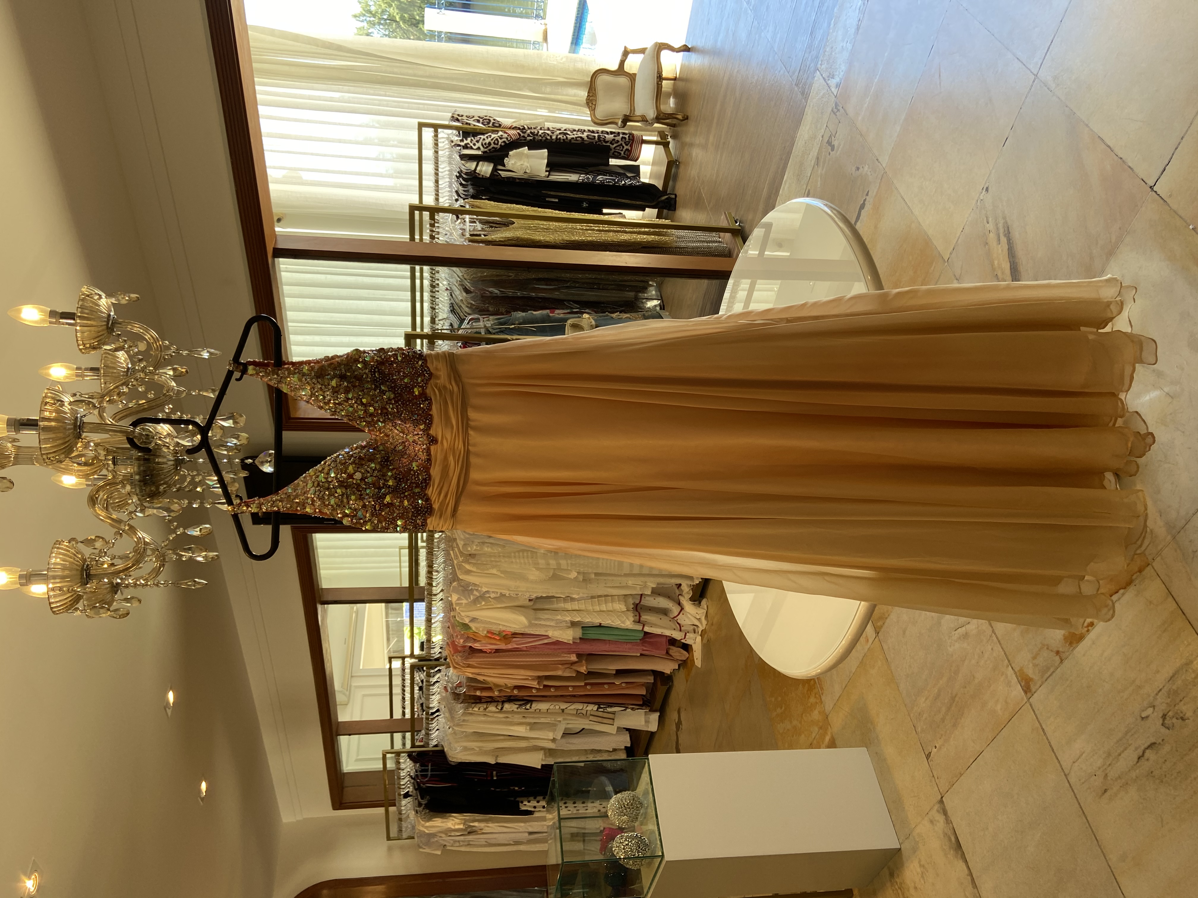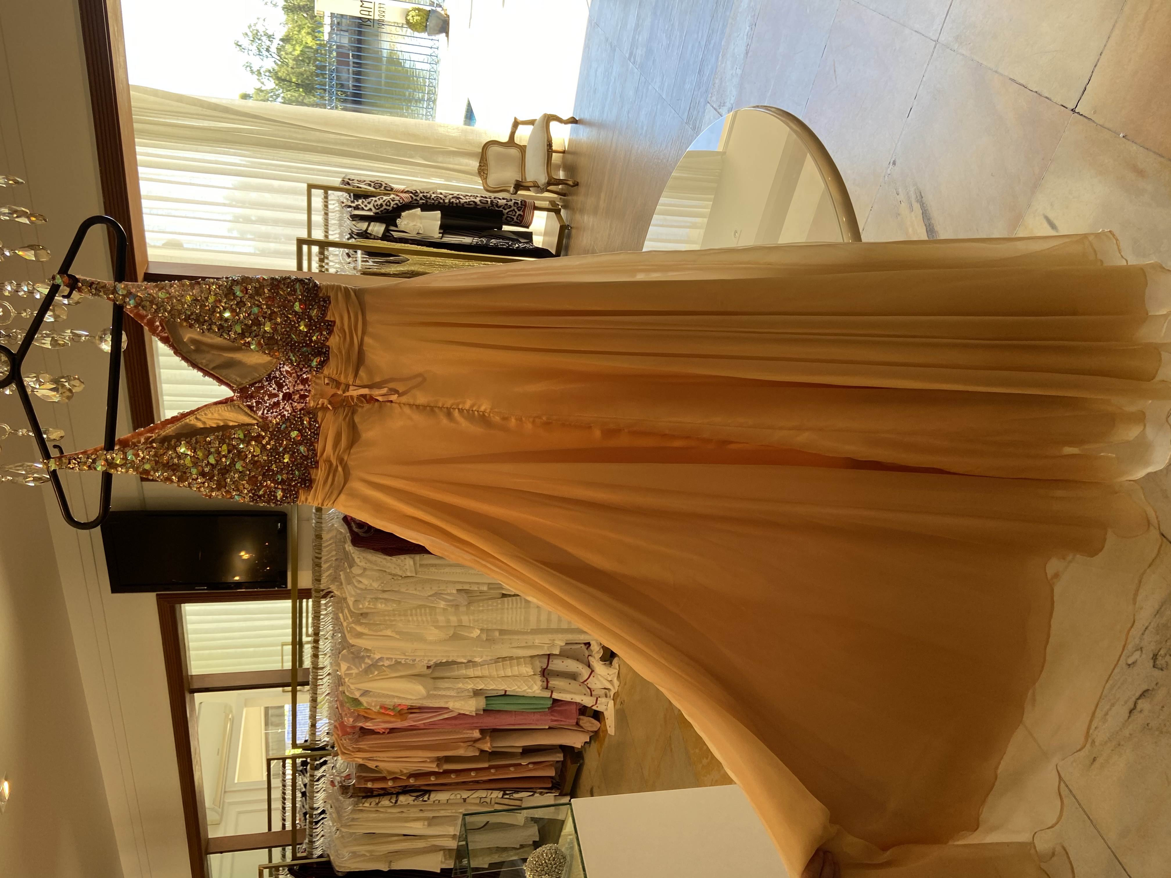 Vestido de seda com pedraria, longo, usado uma única vez, novo.