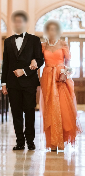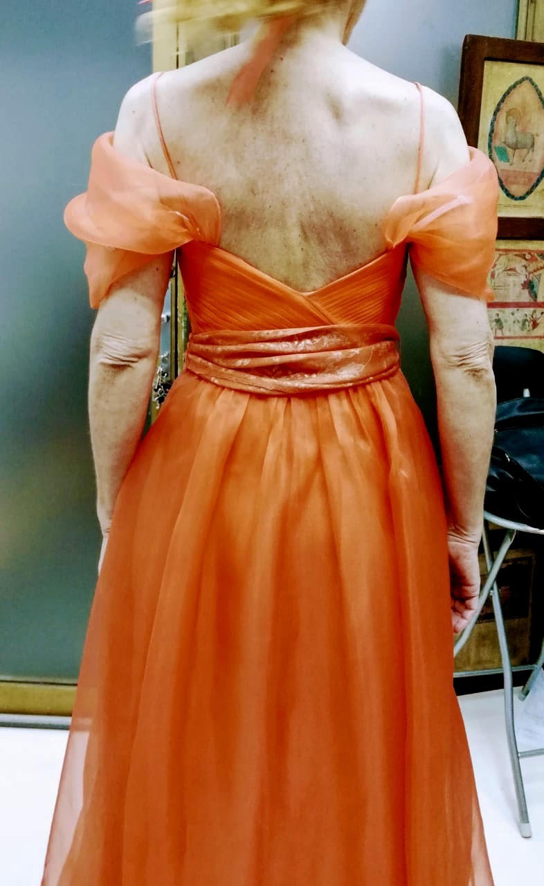 Es una combinación de dos tonos; salmón en la parte superior y la falda color pomelo en tres telas vaporosas.