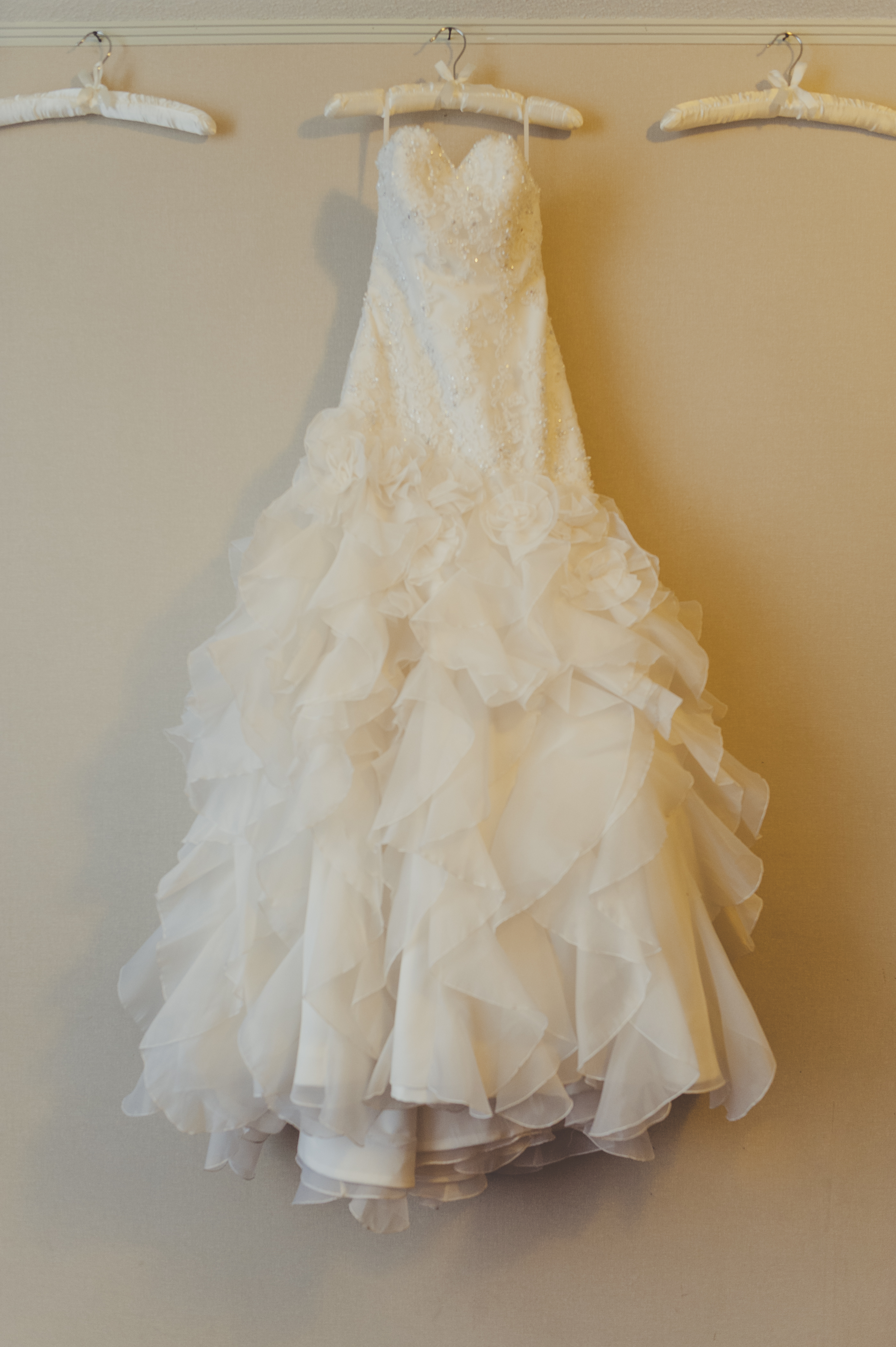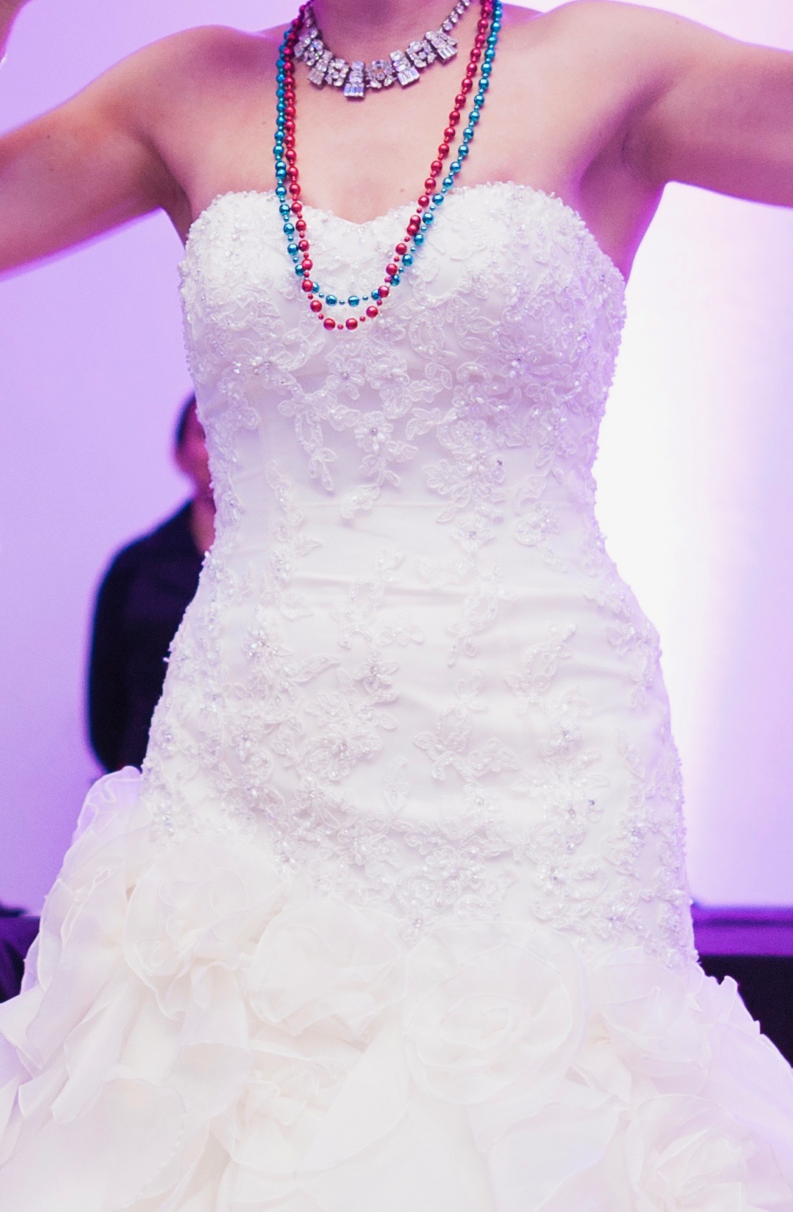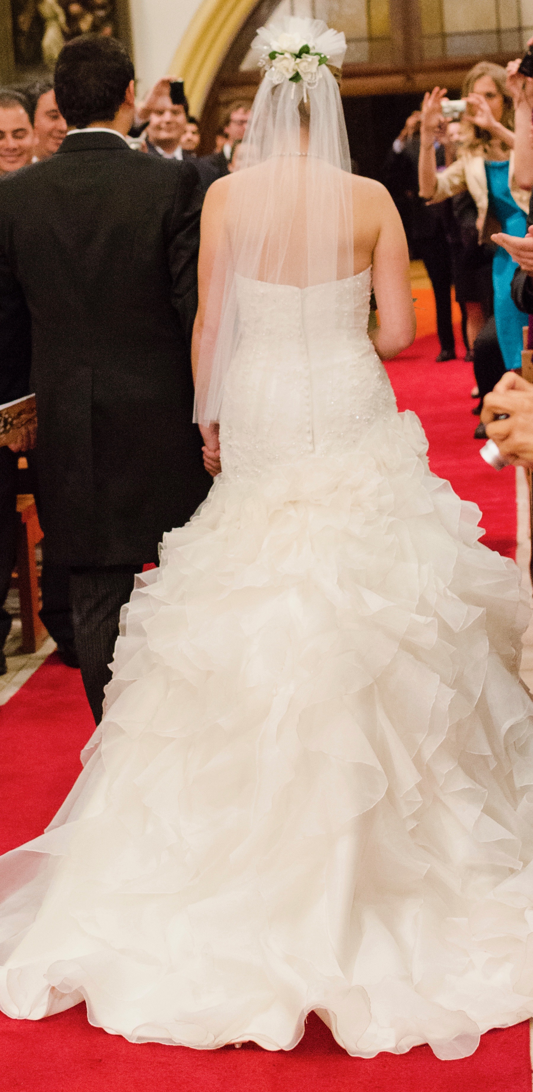 Vestido impecable y en excelente estado. Escote de corazón con corpiño ajustado que acentúa las curvas naturales de una manera halagadora. El corpiño tiene adornos de abalorios en un patrón de encaje / brocado que agrega un detalle bien lindo y brillante dependiendo de la luz. El cierre tiene botones de satén superpuesto como otro detalle, pero queda con la función practica y fácil para cerrar el vestido. Cuenta con una falda de aro para usar debajo de los volantes para mantener el aspecto de sirena. La falda se abre en un estilo de sirena en la mitad del muslo, con capas de organza. Tiene un tren corto que también tiene la capacidad de abrocharlo para mejorar la movilidad durante la parte de fiesta de la boda. En general, un vestido cómodo para la boda, tanto comer y bailar, que son consideraciones importantes si lo va a usar durante 10 horas. Una buena mezcla de ser elegante y también lúdico, y da la sensación de una princesa sin exagerar. Es halagador y sexy sin ser demasiado y está en muy buen estado para ser usada nuevamente en el día especial de otra persona. ¡Definitivamente no debería quedar guardado en el closet!!