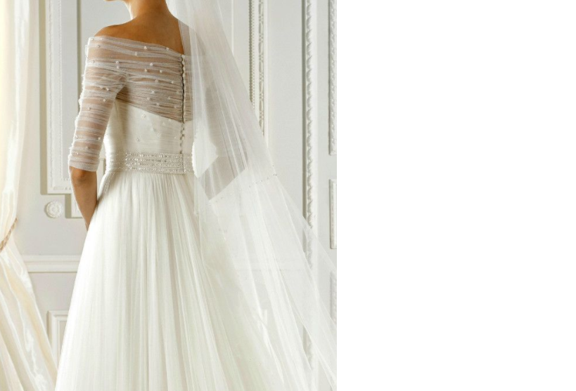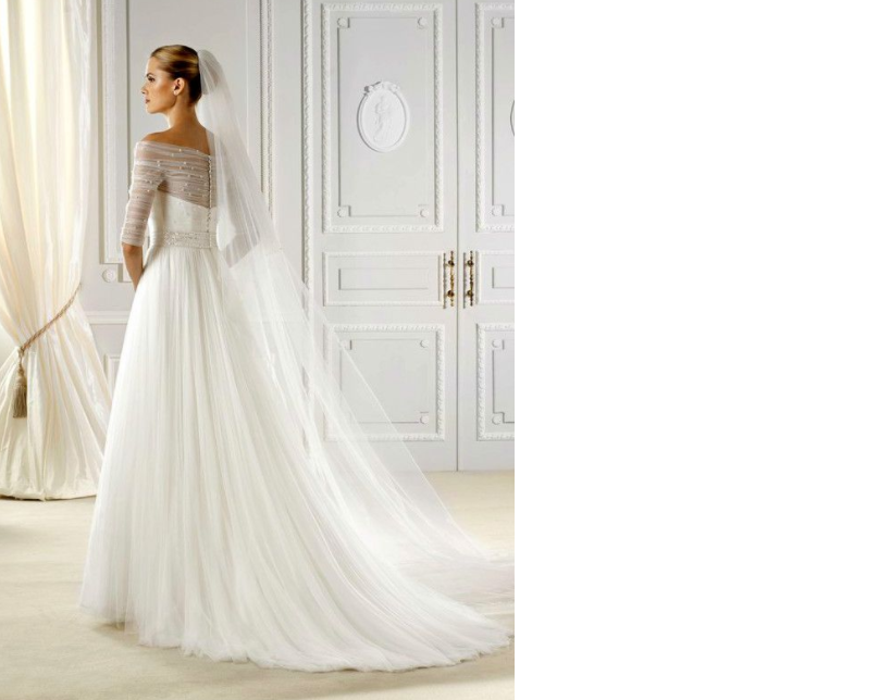 Vestido de novia nuevo, sin uso, color blanco natural – off white, confeccionado en tul y aplicaciones de pedrería con escote velado y media manga.