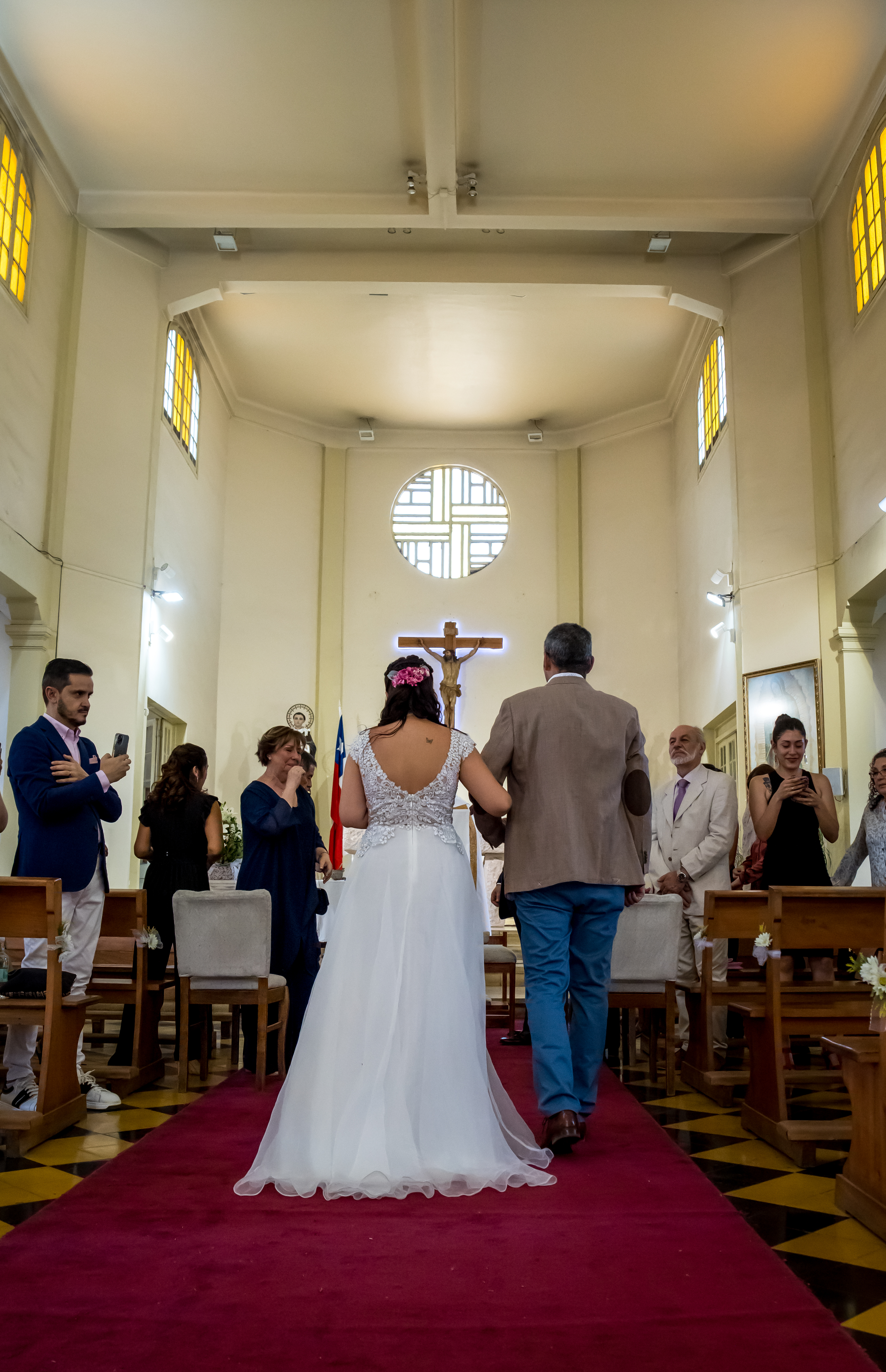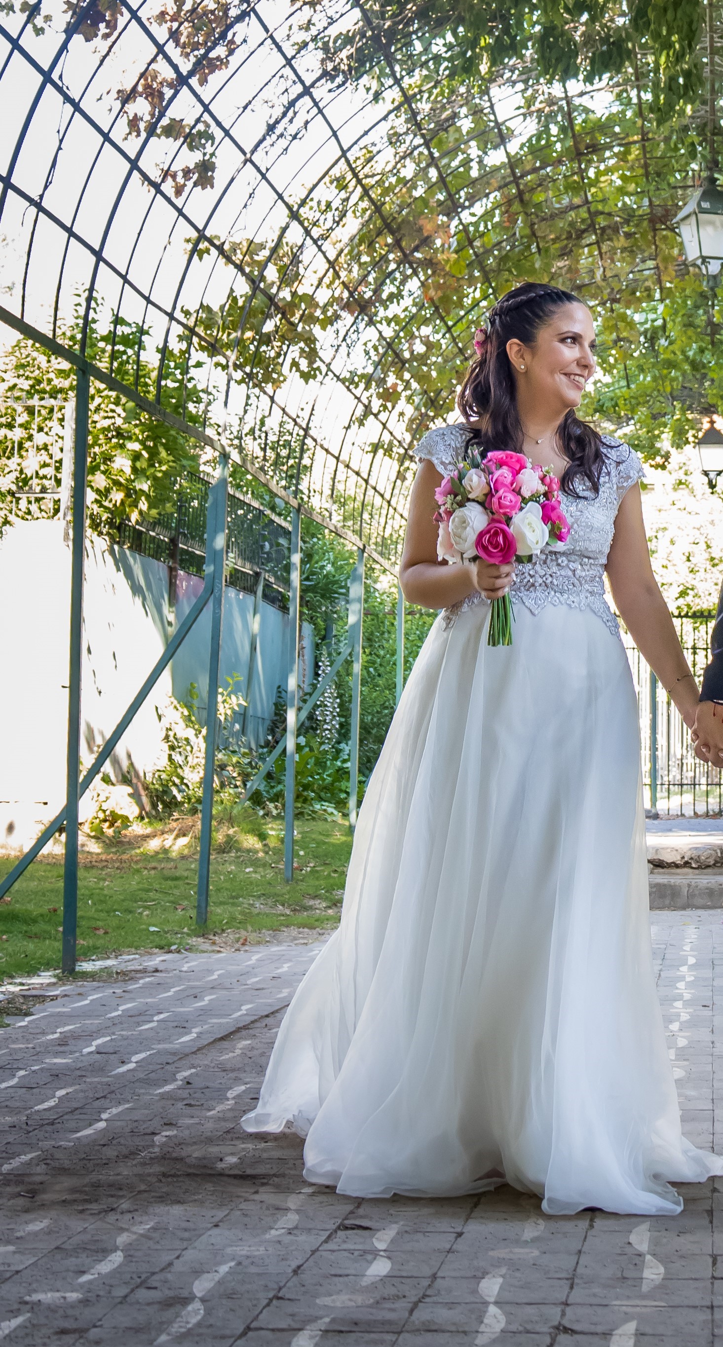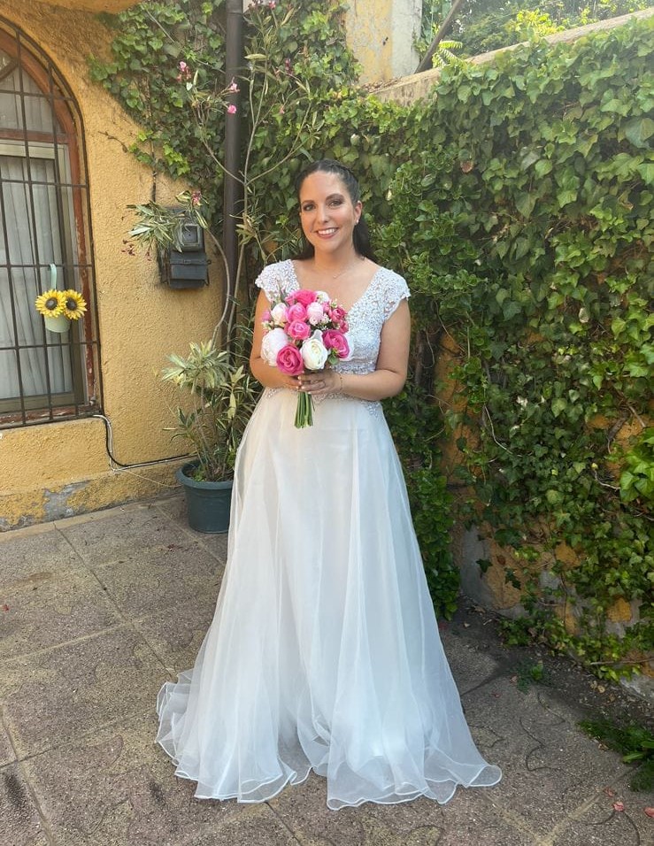 El diseño de nuestro Roma tiene un corset de escote medio profundo en V de gasa, no elasticado, lo que ayuda a dar estructura y figura al vestido. Su espalda lleva un escote en V hasta la espalda media, donde nace un cierre de color blanco que permite cerrar el vestido de una manera cómoda y sutil. Su amplio faldón cae suelto, de corte princesa.