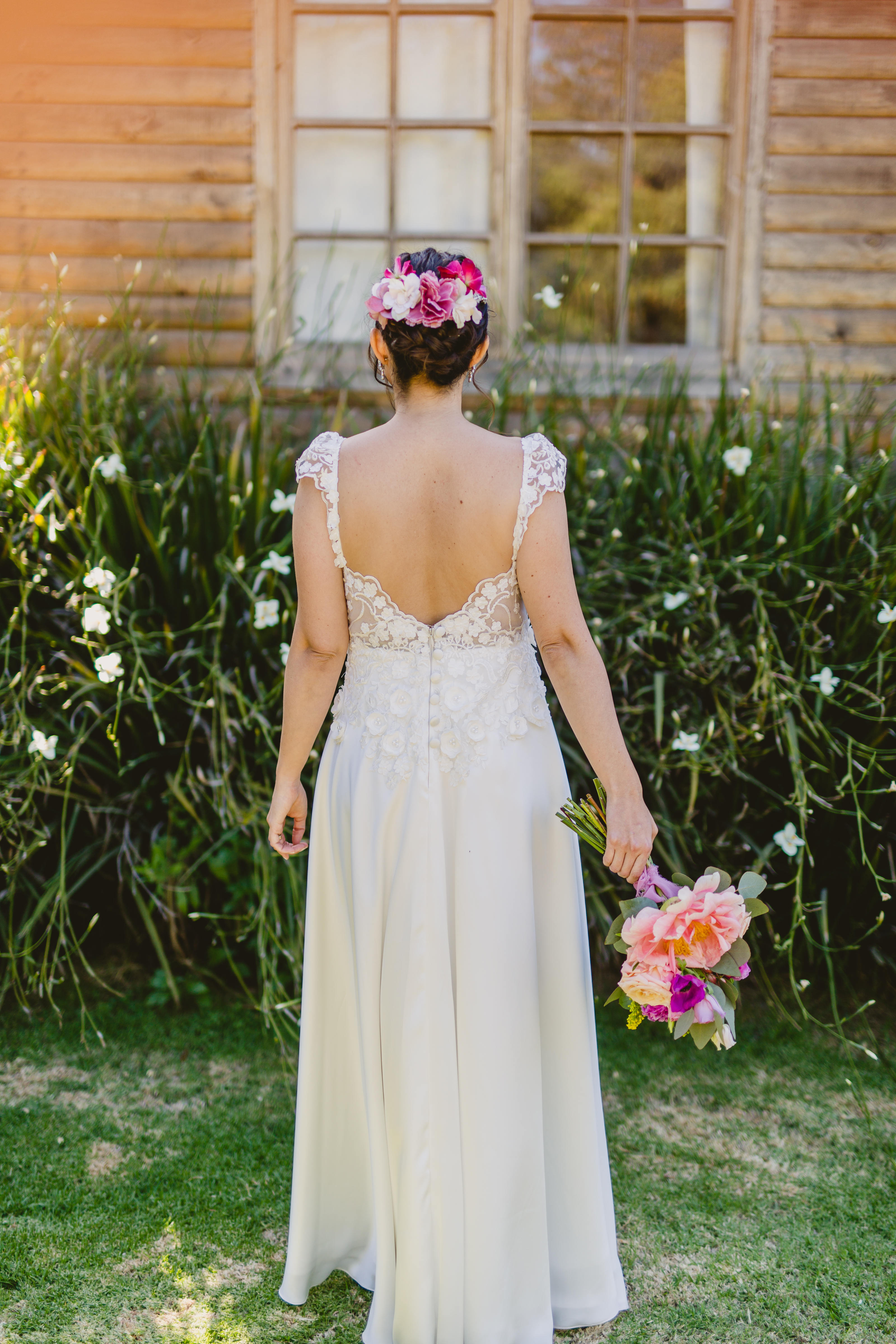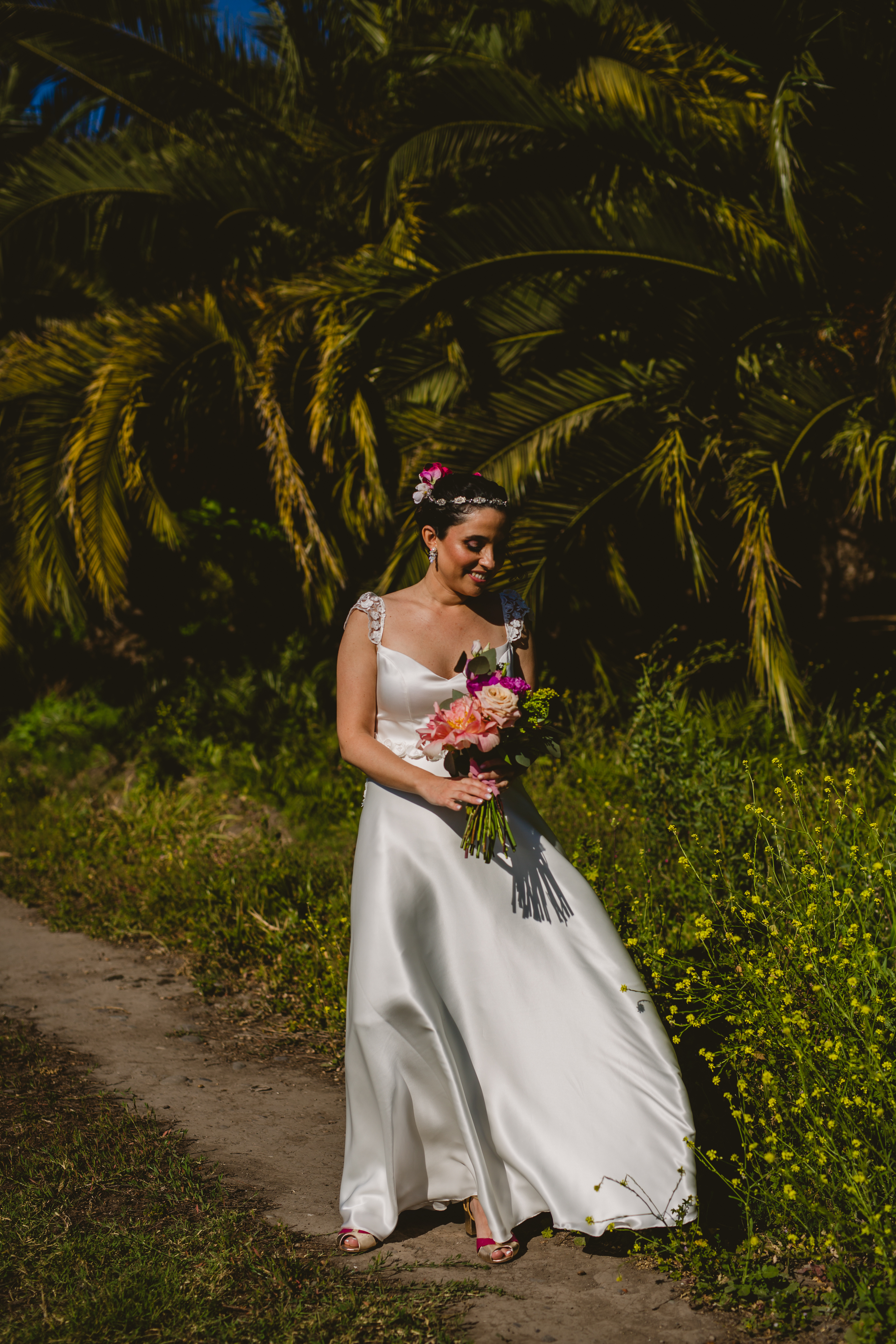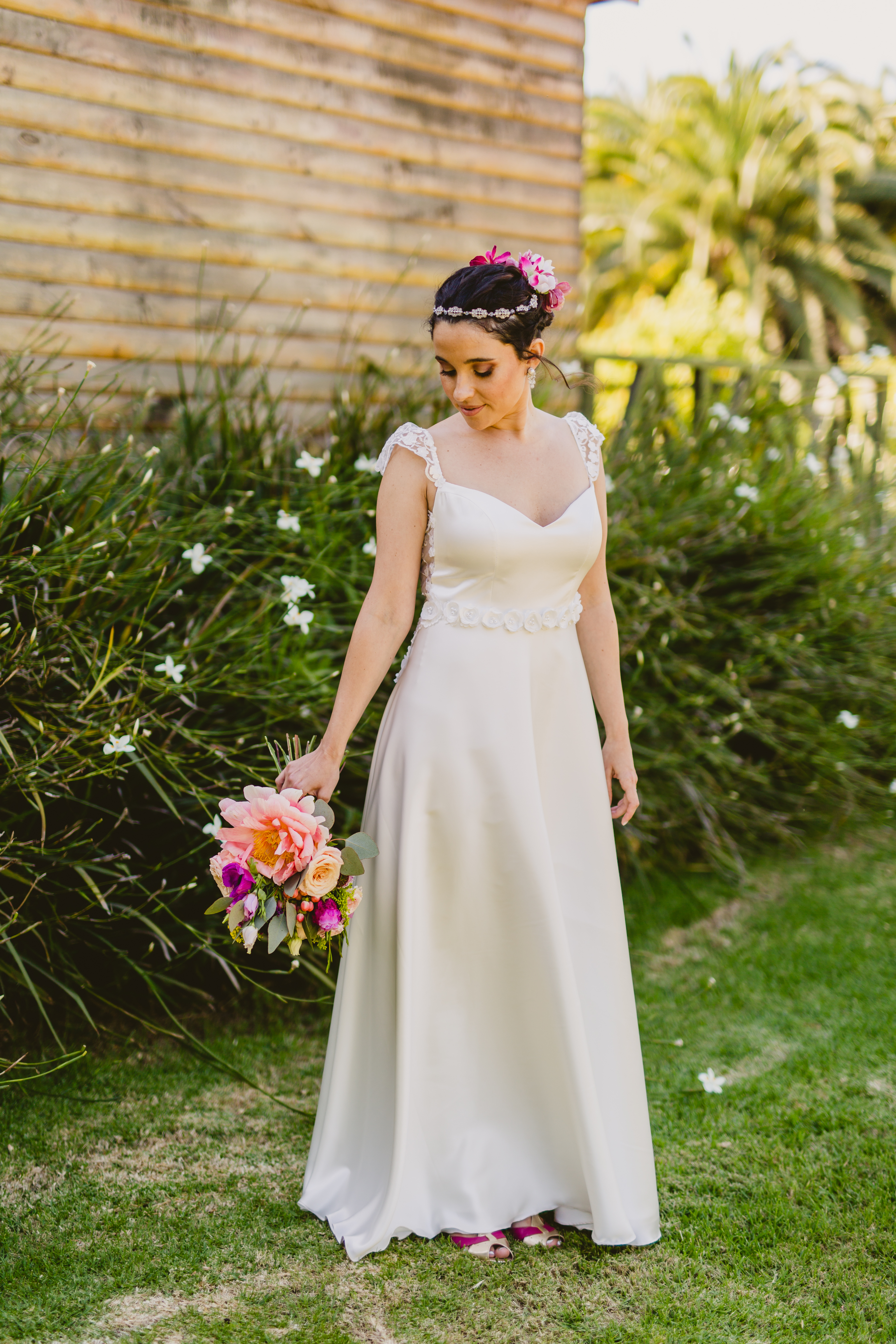 Vestido de novia hecho a mano en base a Charmeuse de Seda y encaje. El escote frontal es en forma de corazón, el encaje va en las mangas y en la espalda que es en escote en V. El encaje tiene flores de distintos tamaños que sobresalen, lo cual aporta volumen a la tela, y cada flor tiene un centro de mostacillas perladas. En la parte frontal tiene un cinturón hecho con las flores del encaje, cada flor fue cosida a mano. En la región de la espalda, bajo el escote en V, tiene botones forrados que van cosidos sobre el encaje a modo de decoración ya que tiene cierre interior. Es un vestido muy cómodo y liviano, y la tela tiene un brillo muy bonito.
