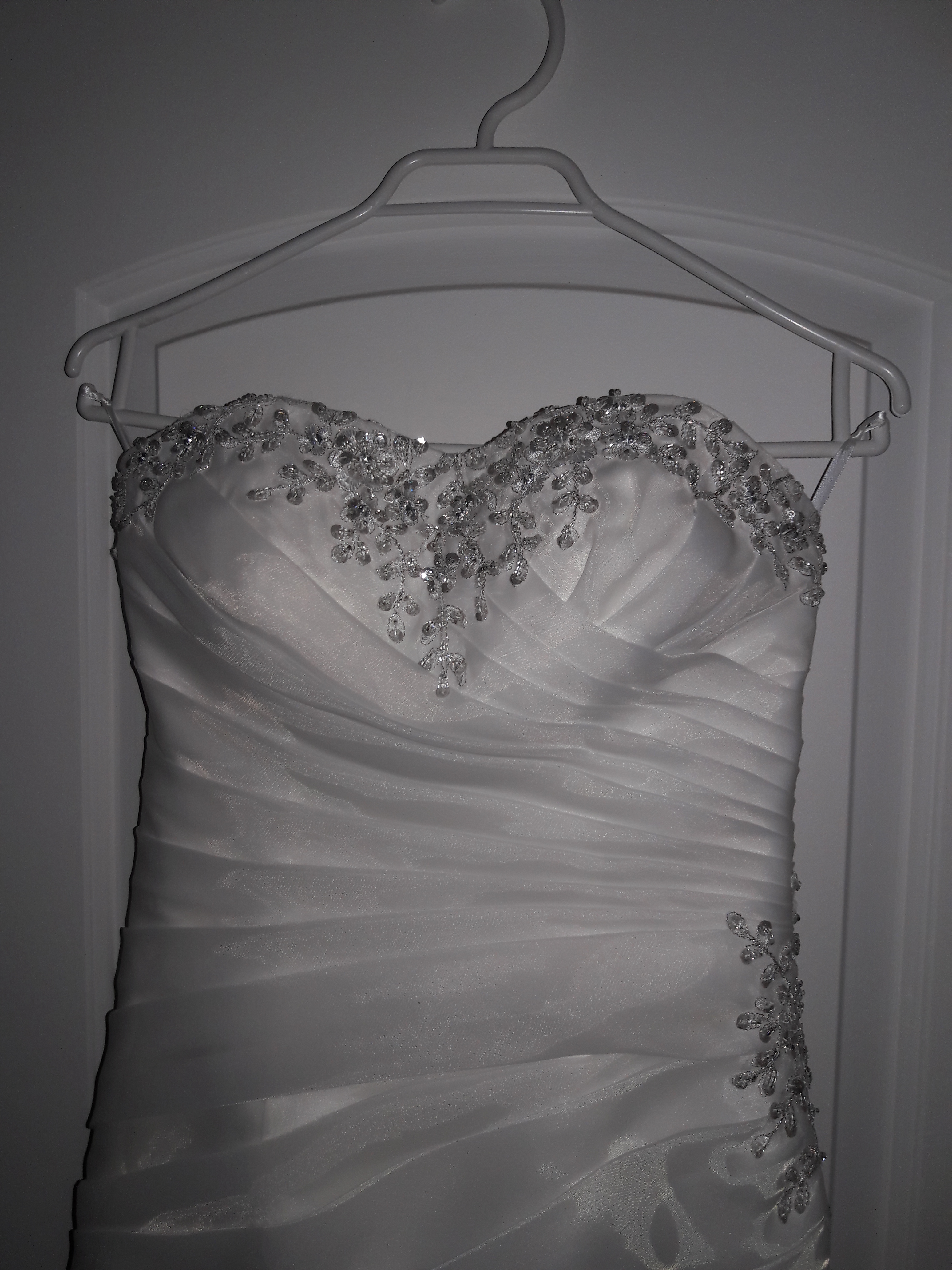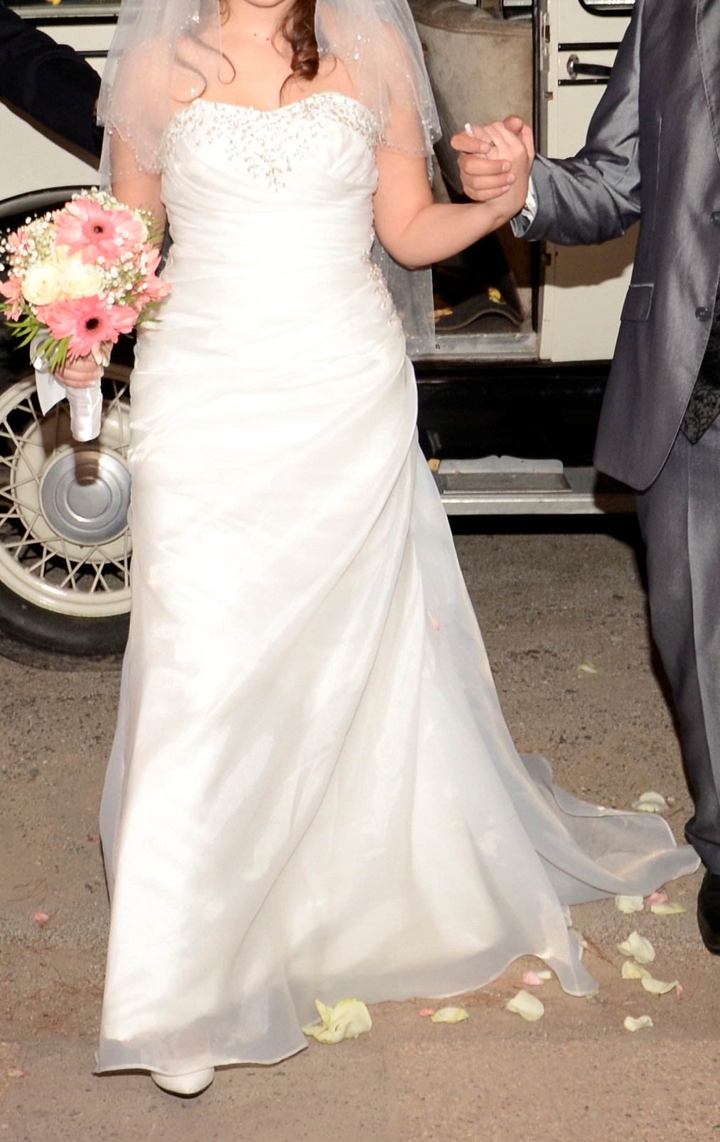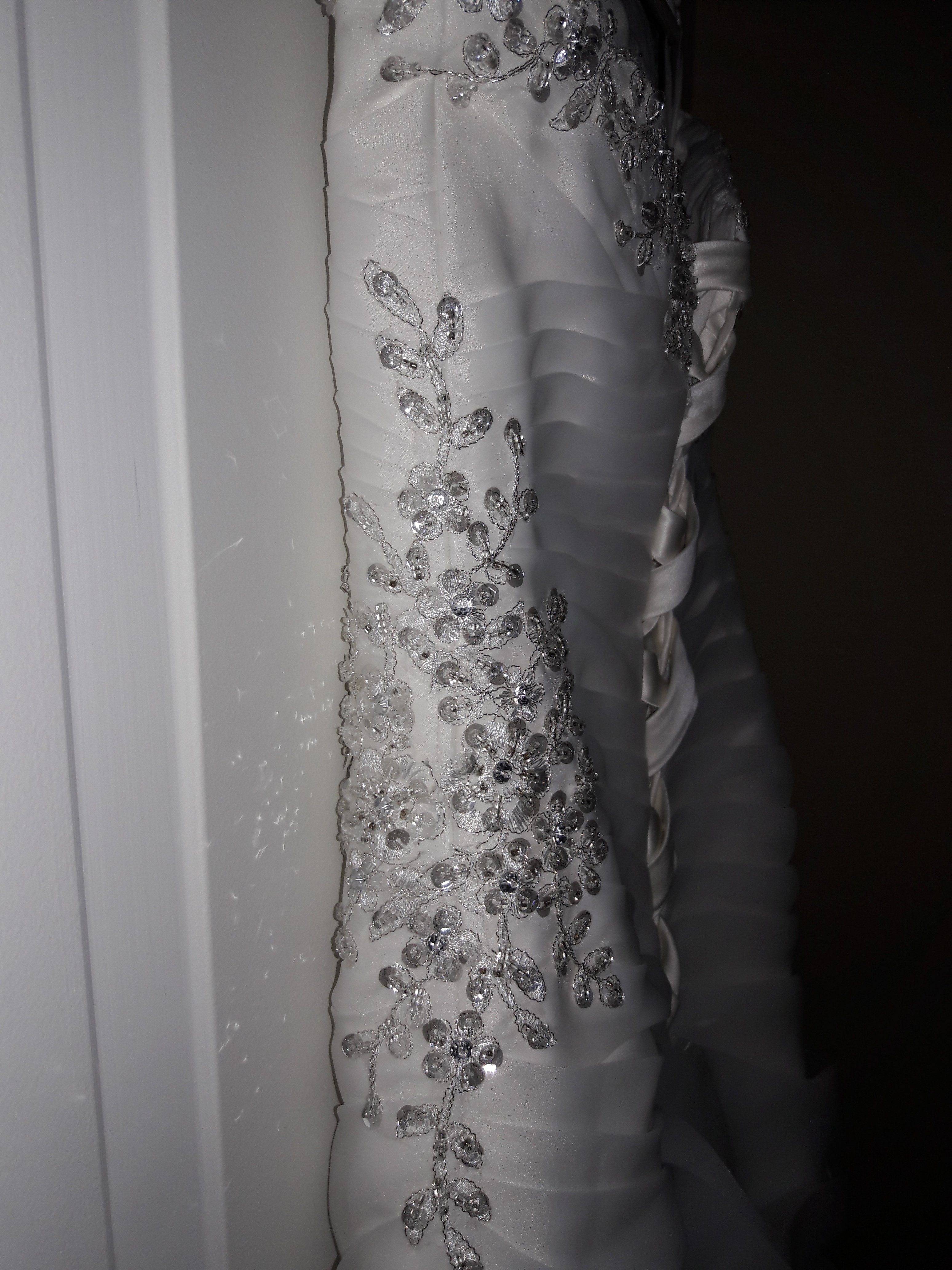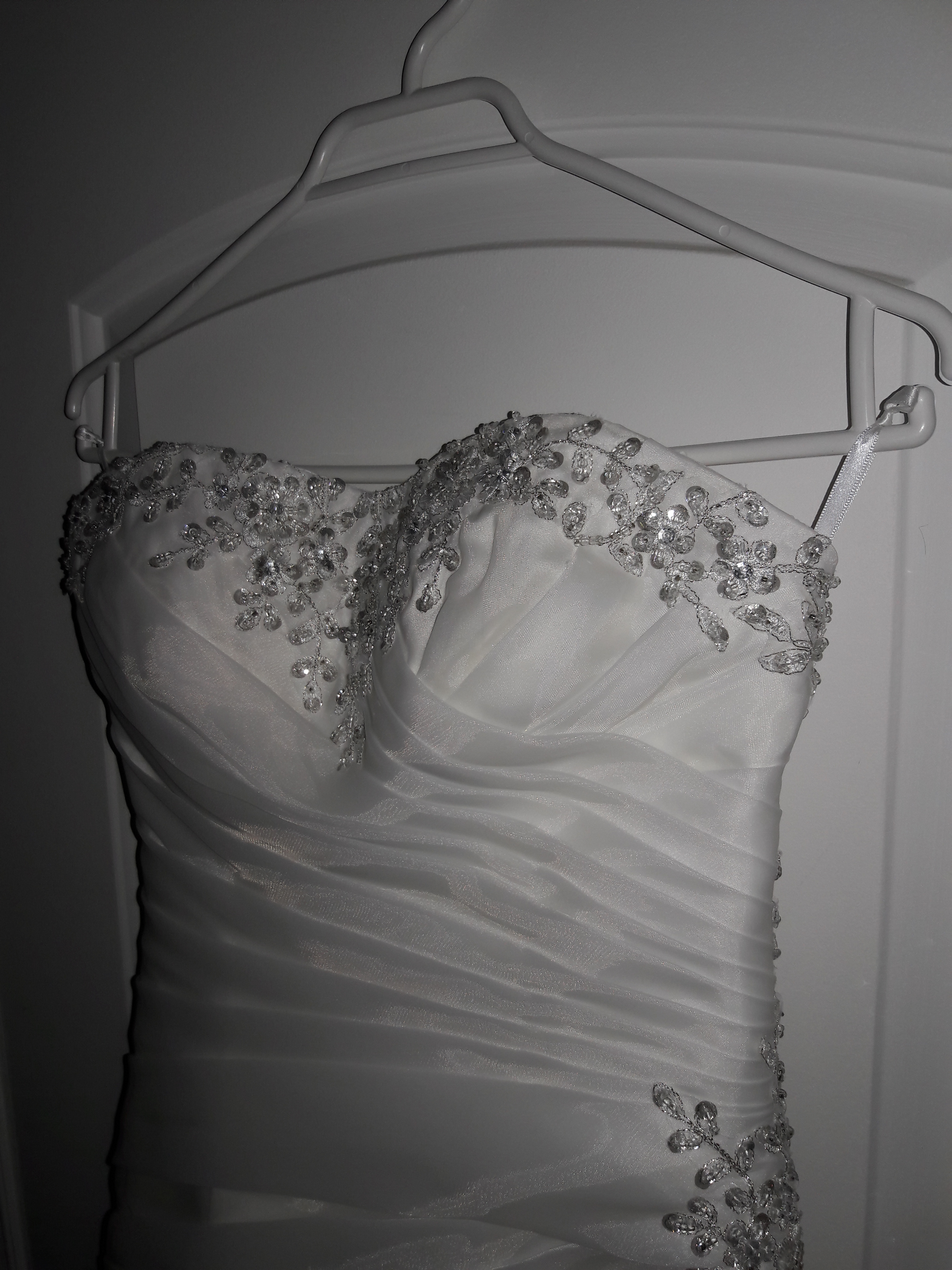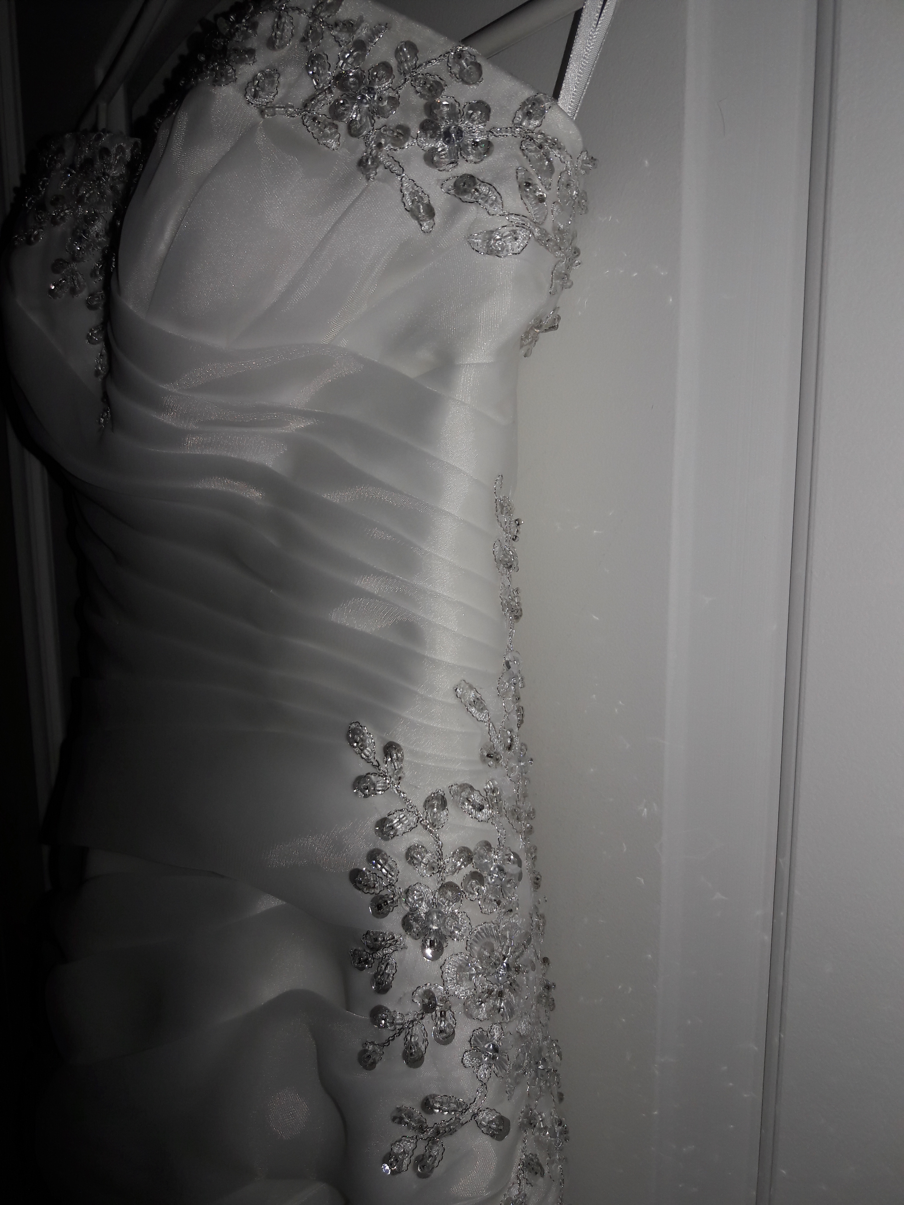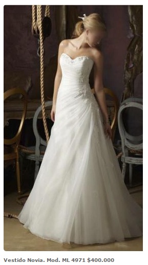 Vestido talla 38, ajustable a 40. Modelo strapless, tela Organza, diseño con bordado y pedrería fina, color ivory (marfil). Importado de EE.UU. Una sola postura, luego fue lavado a mano y guardado. Precio Original $400.000. Se vende a mitad precio.