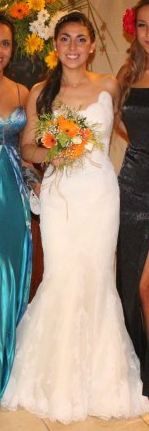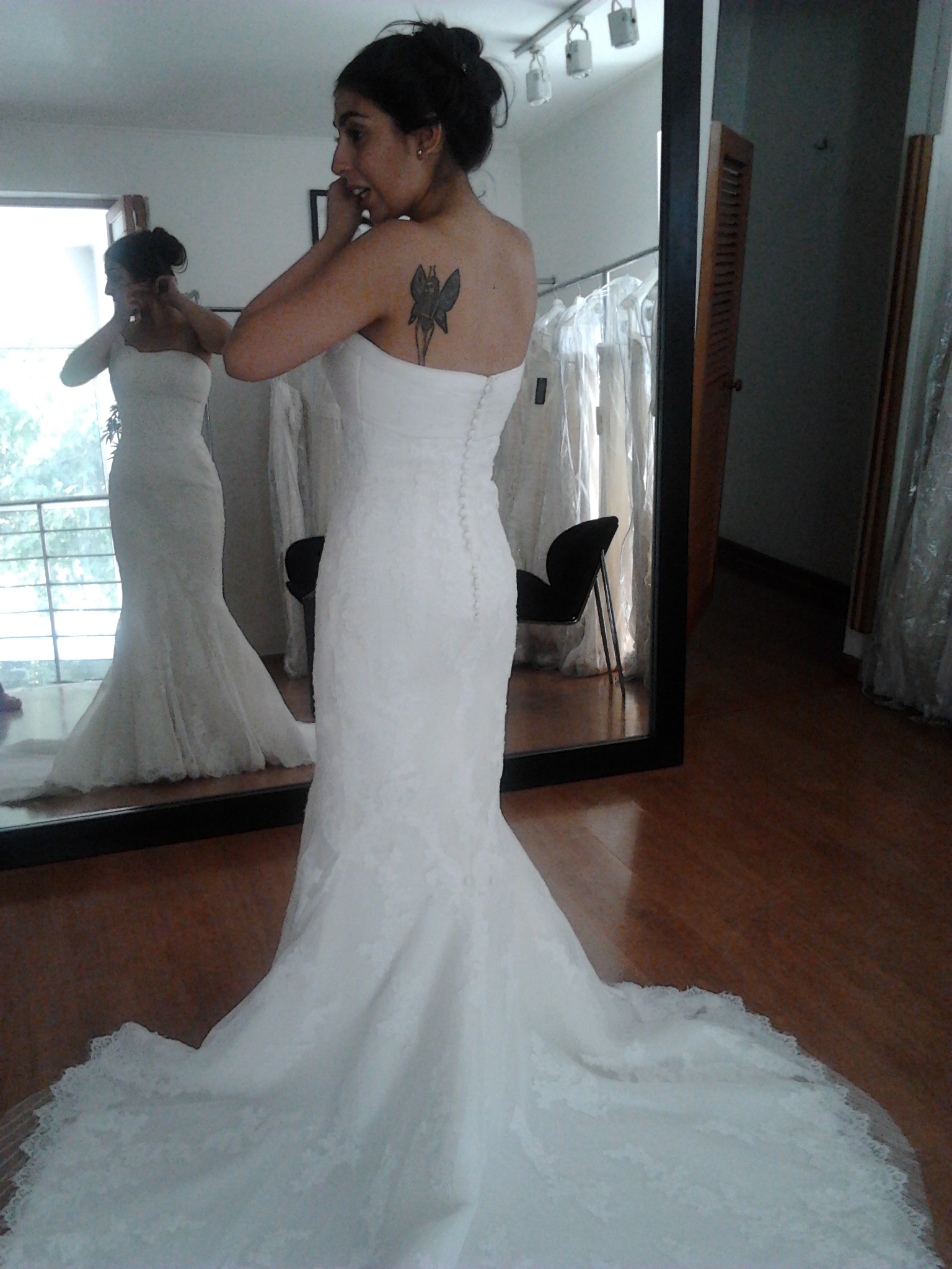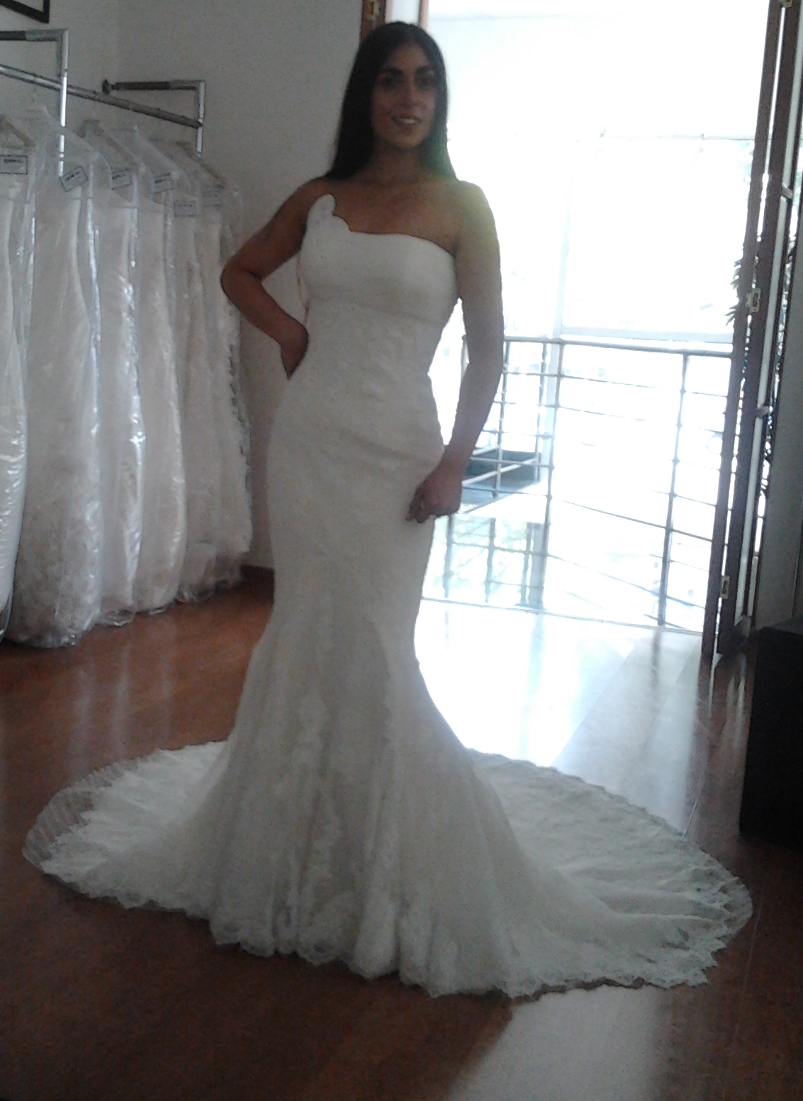 Vestido de un solo uso (matrimonio), comprado nuevo en Pronovias en Santiago, talla 36 sin arreglos, sin detalles. Tela de encaje y tul, corte sirena con cola que se toma por atrás, con elegante caída de encaje y tul. Ideal para mujeres de altura 1, 65 – 1,70. En perfecto estado y limpio de tintorería