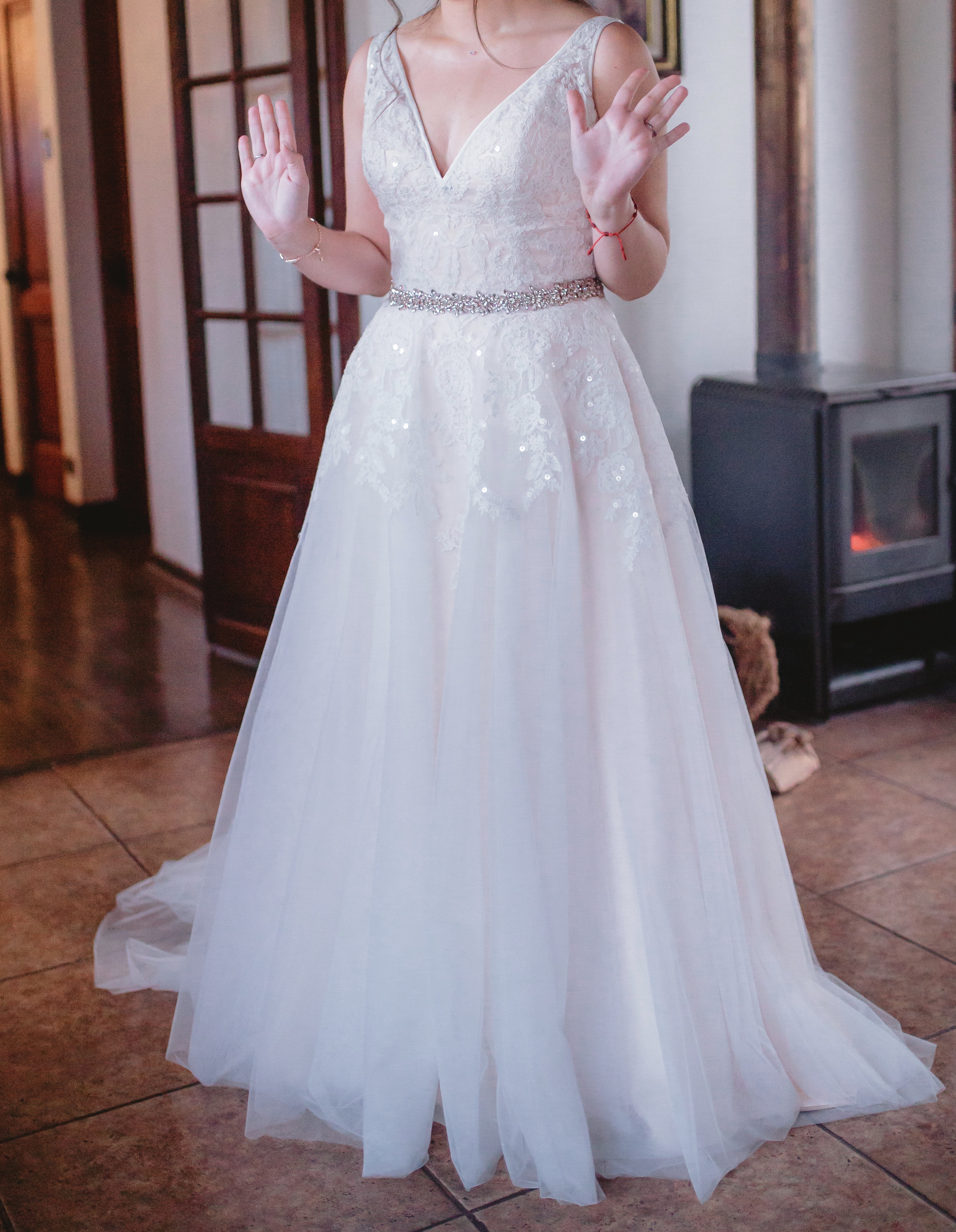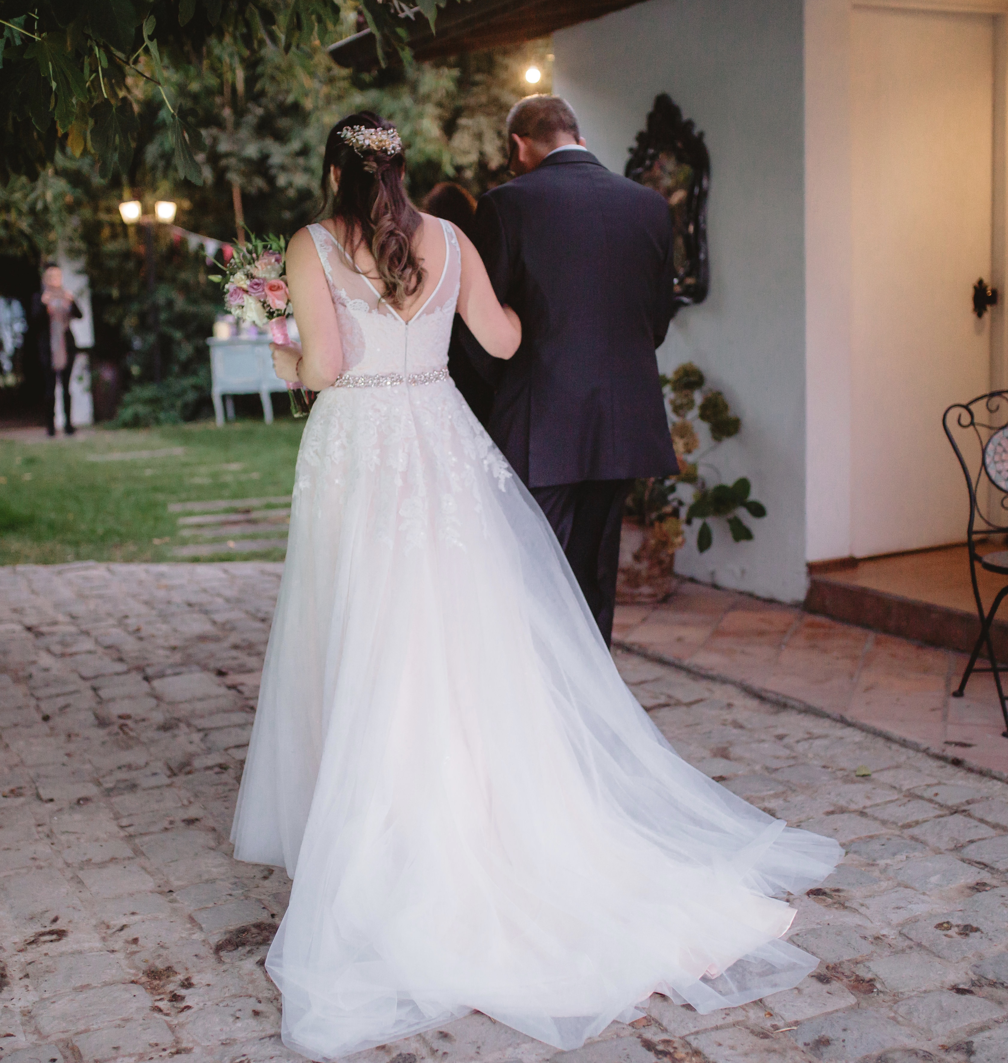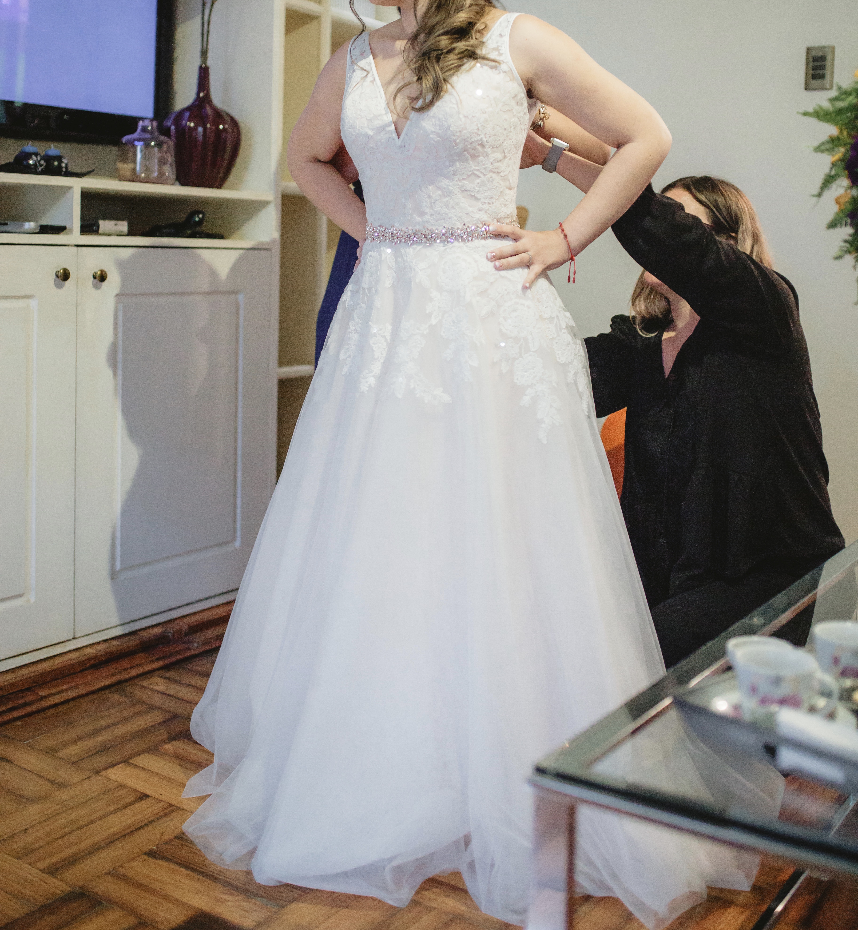 Maravilloso vestido de Somos Novios Chile, confeccionado a mano, escote V en busto y espalda, con hermosos detalles en su tela, bordados, color, tull y cinturón Rose Gold.