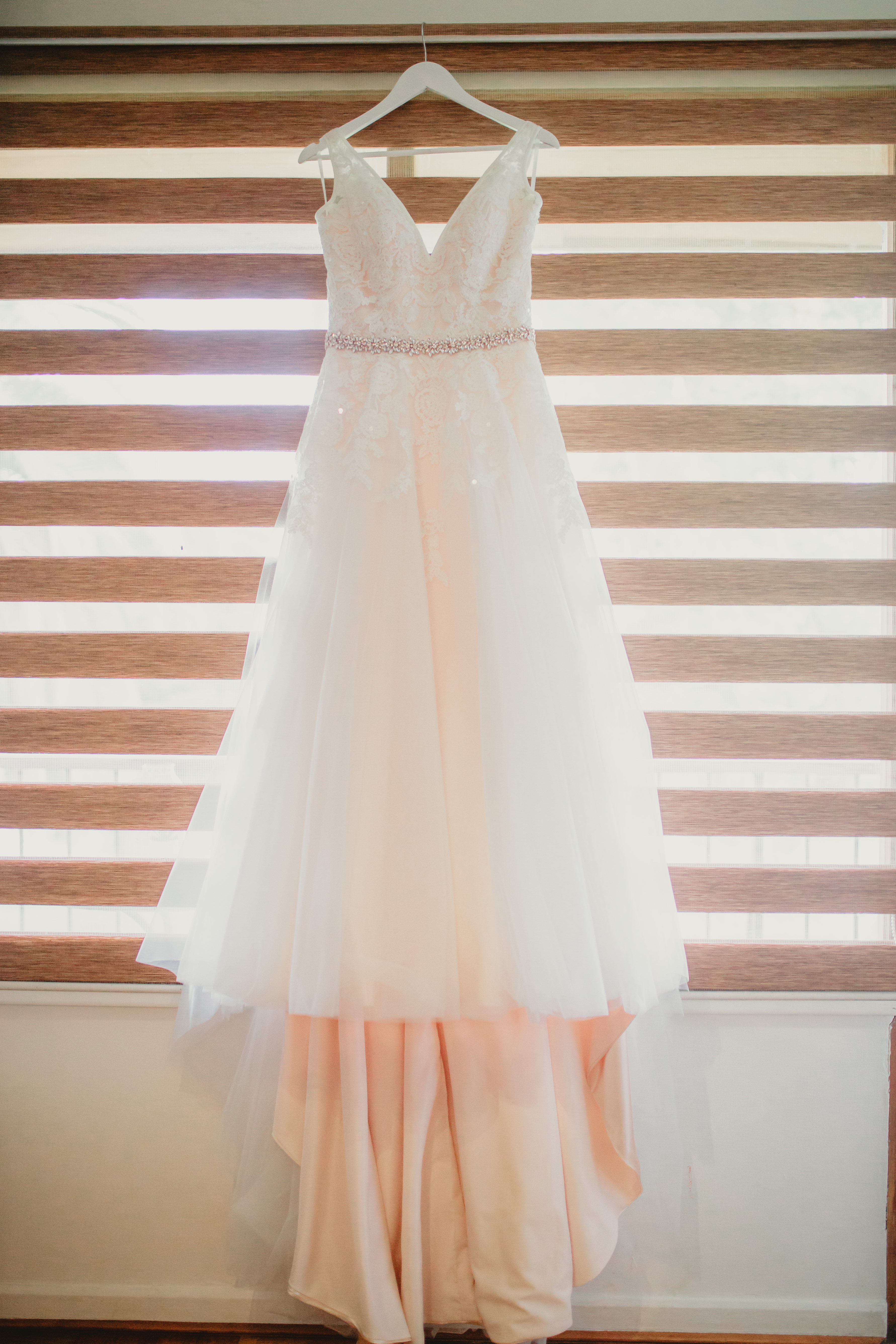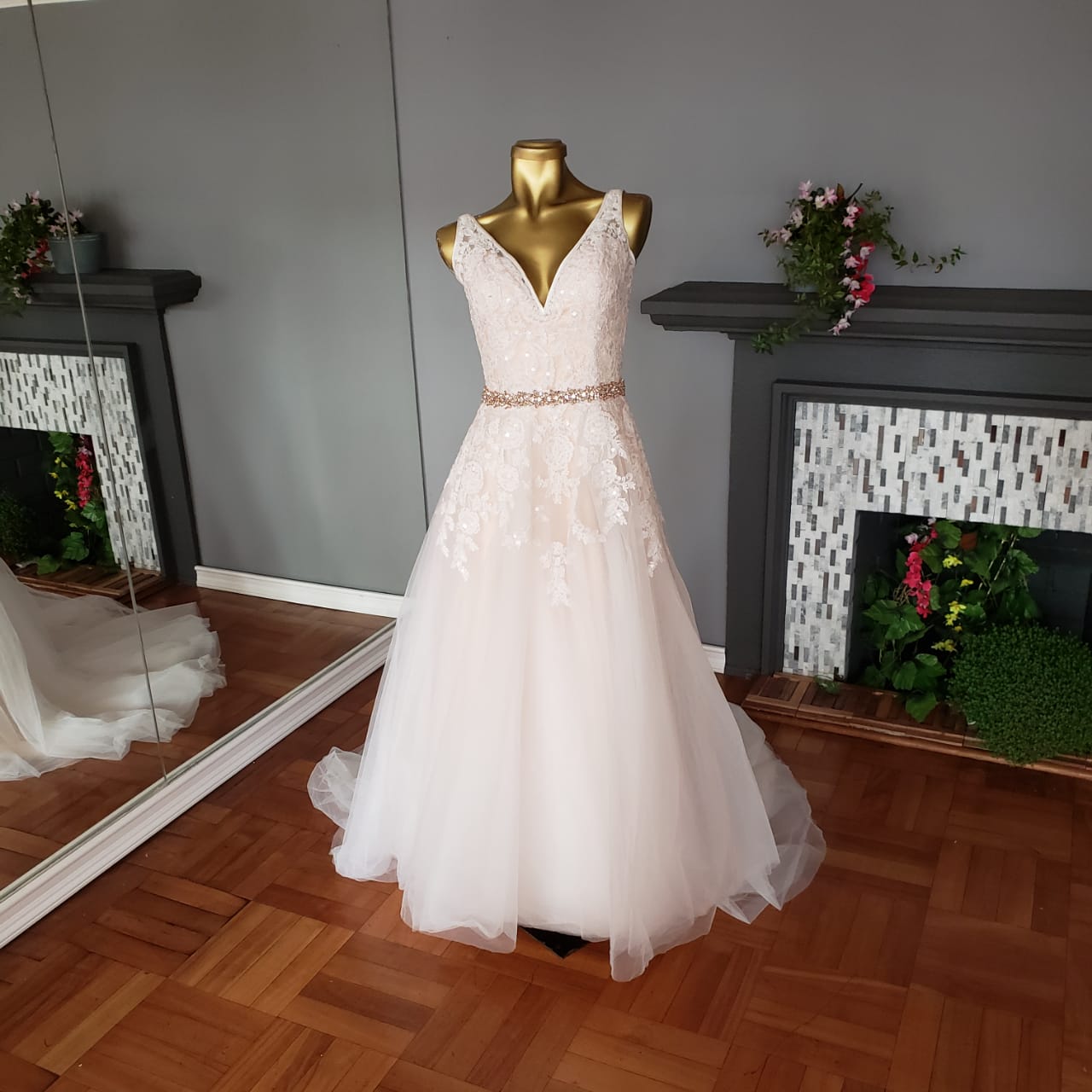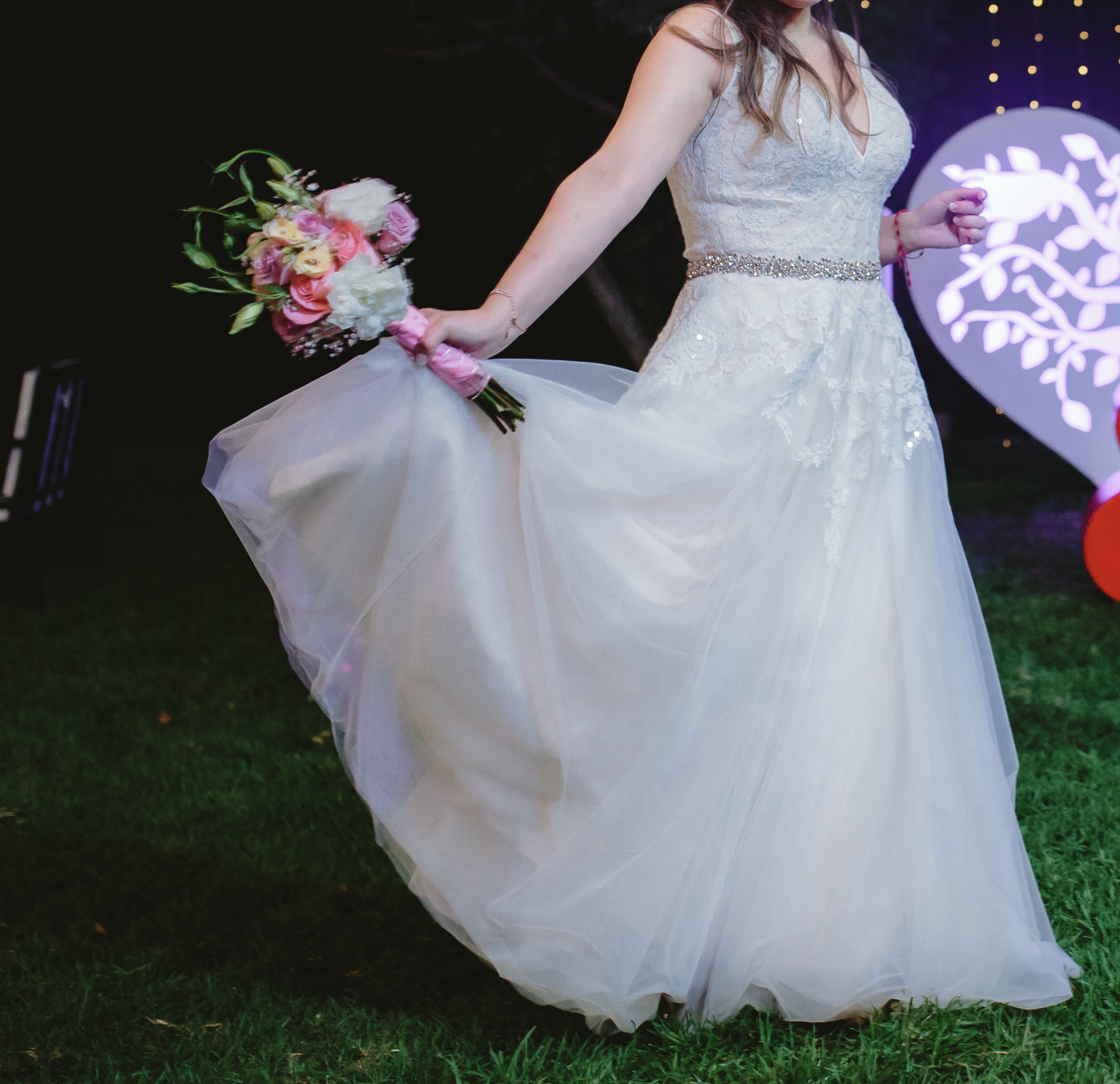 Maravilloso vestido de Somos Novios Chile, confeccionado a mano, escote V en busto y espalda, con hermosos detalles en su tela, bordados, color, tull y cinturón Rose Gold.