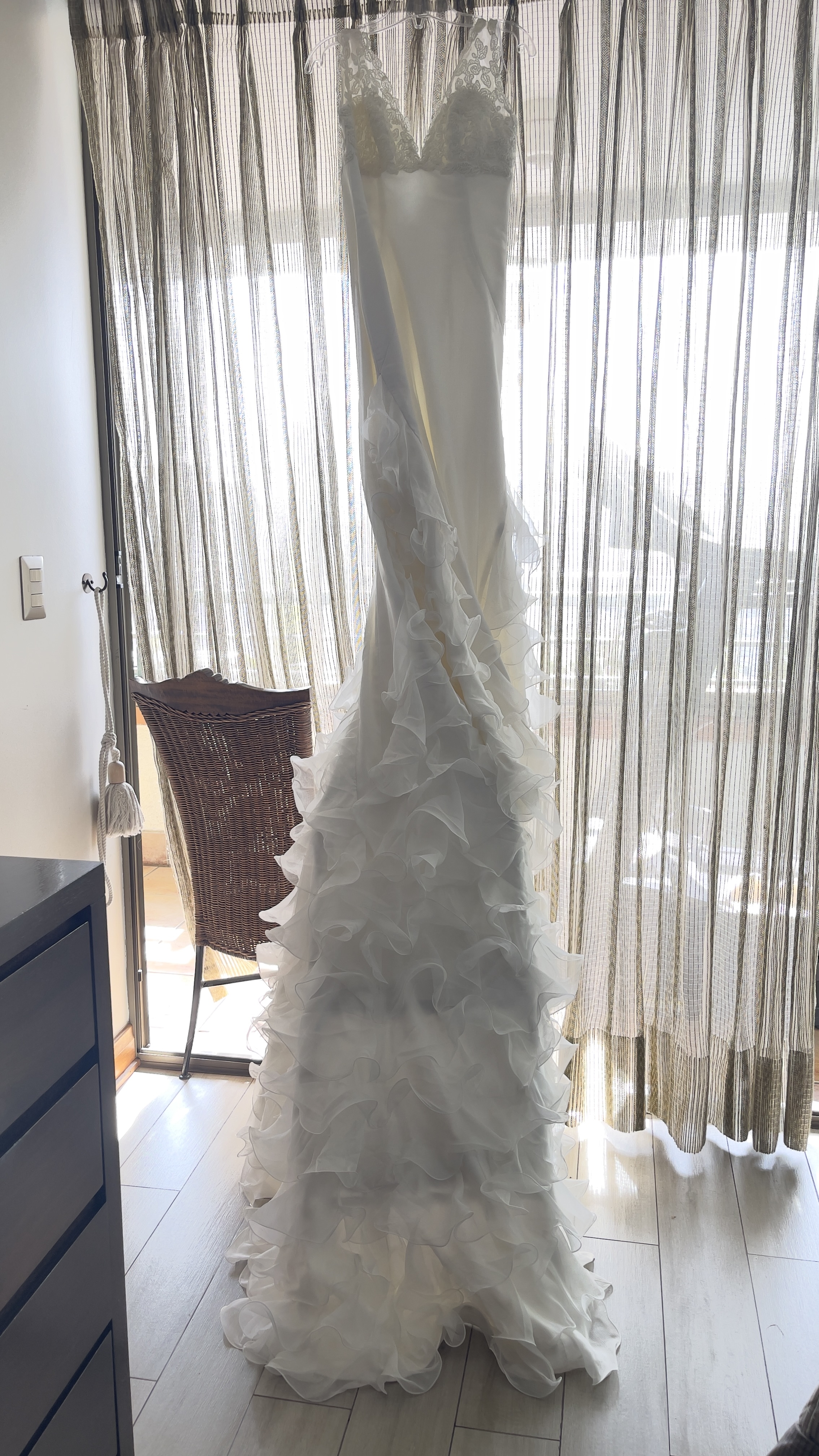 Vestido importado de España, estilo sirena, con cola, vuelos es gasa, brasier bordado con perlas, escote en v, talla 38 , color Ivory