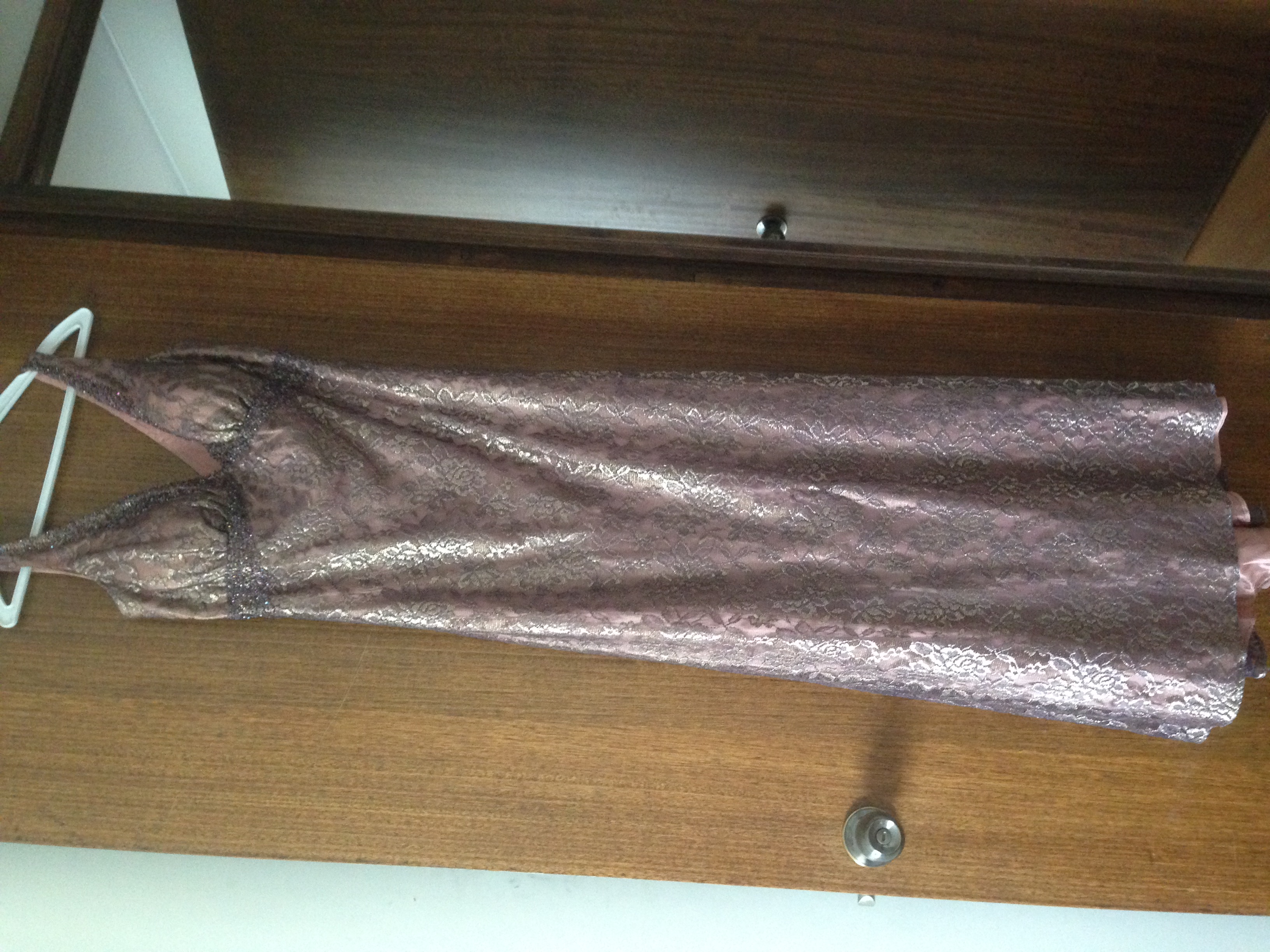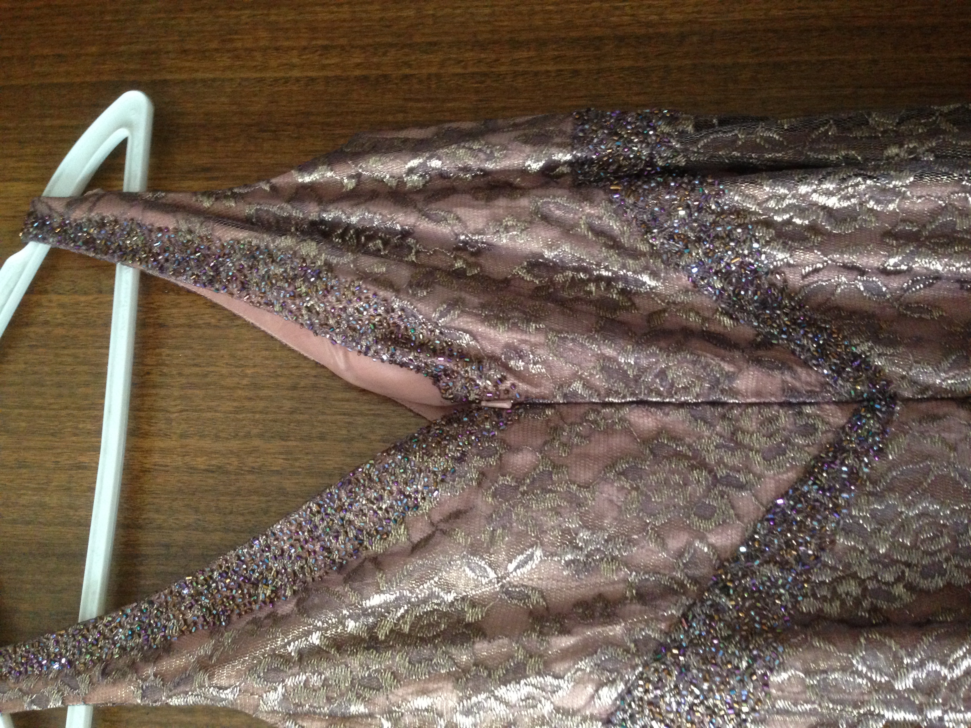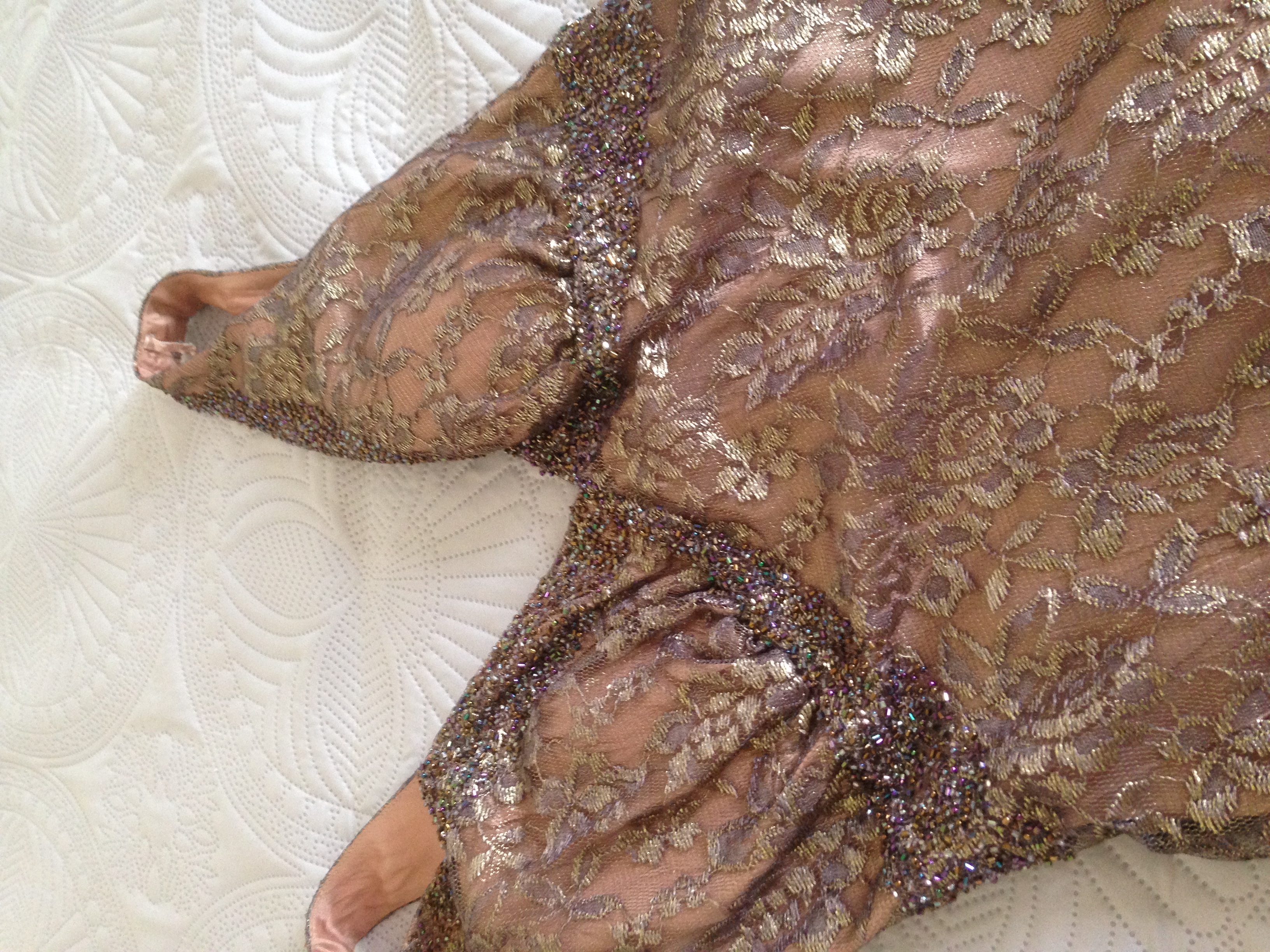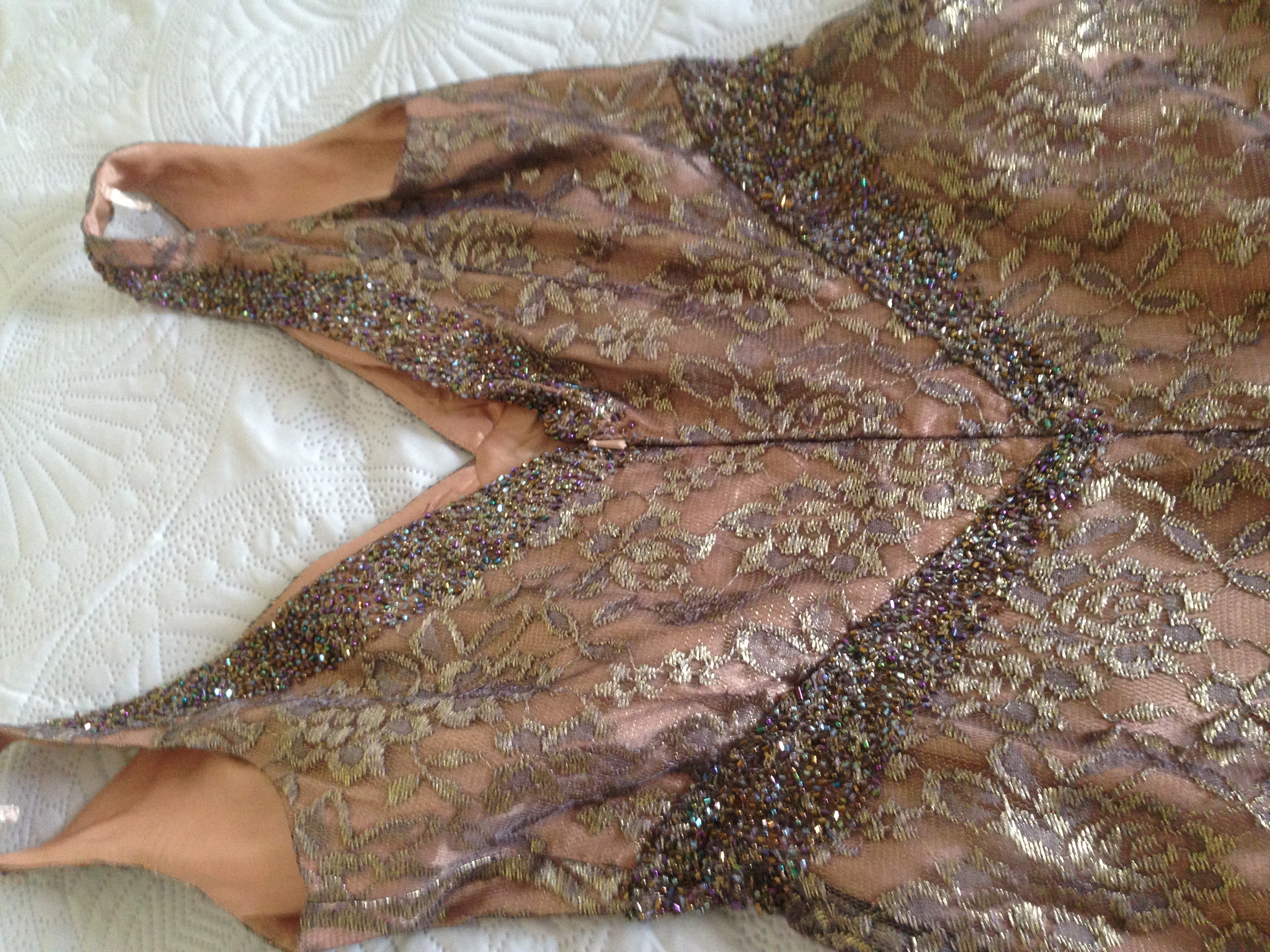 1 uso! vestido forrado en beige, de tela de encaje color dorado envejecido. Bordado con mostacillas destacando bordes del escote delantero y espalda y el corte bajo el busto.