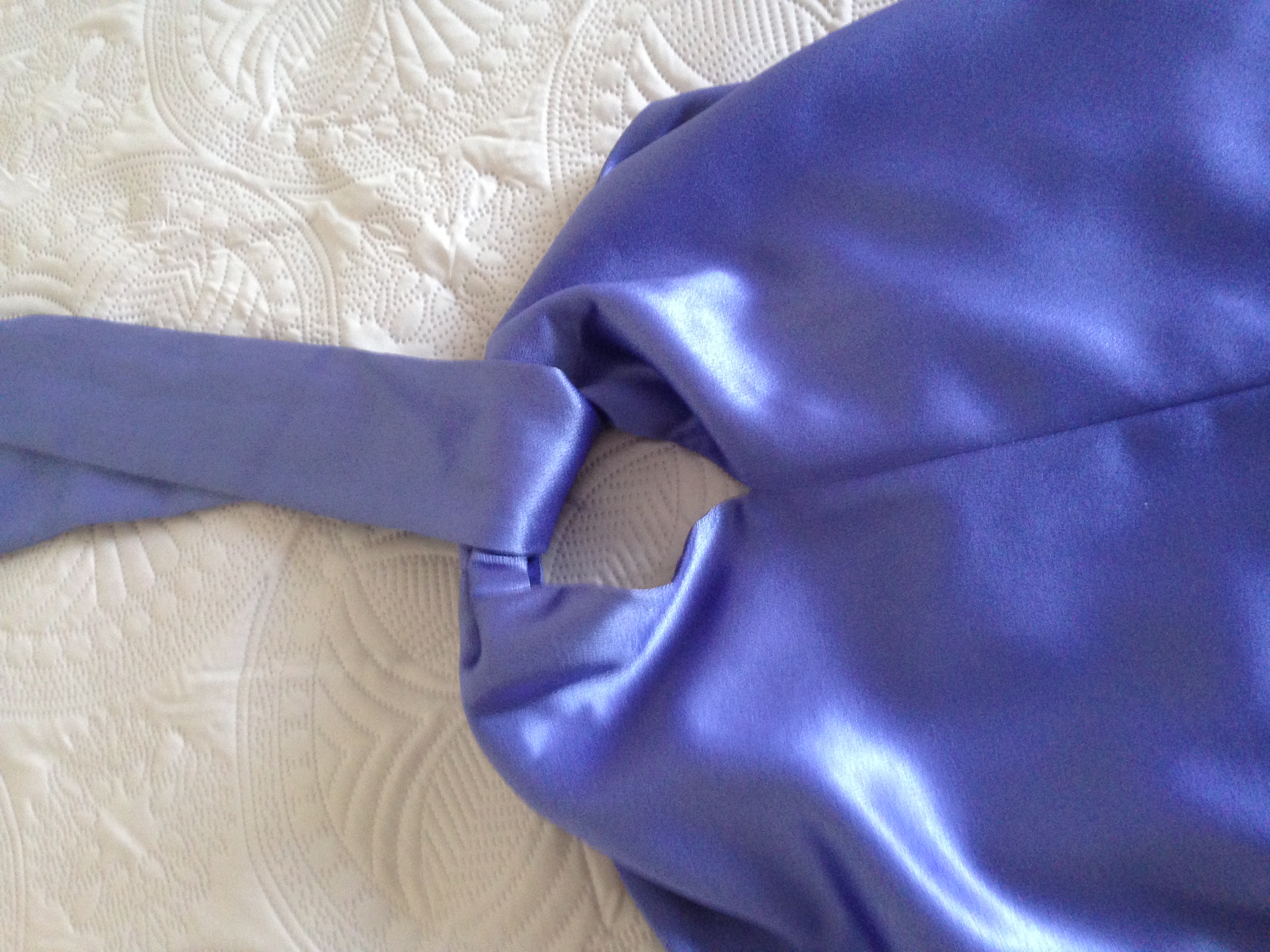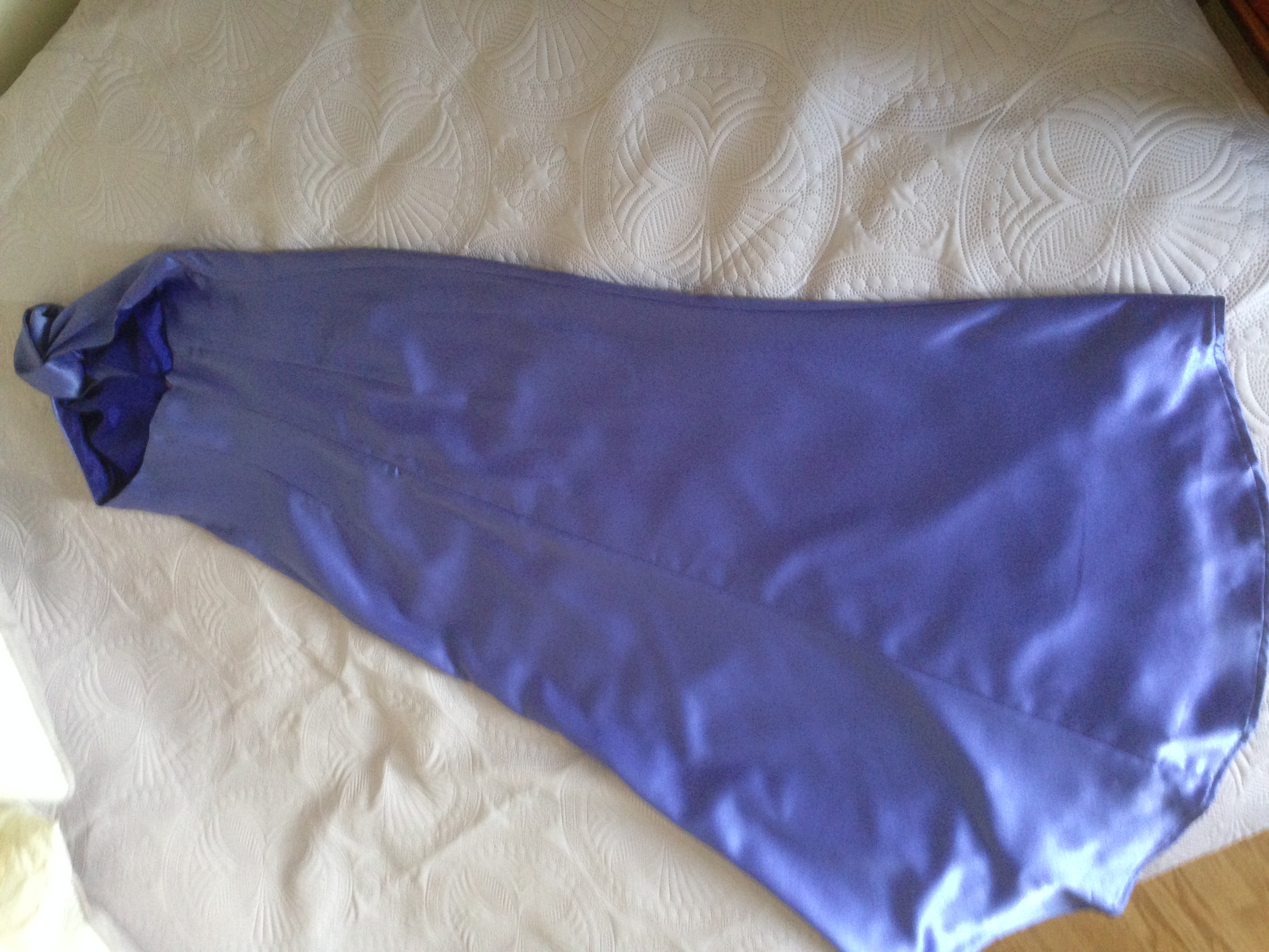 Strapless con opción de anudar al cuello con lazo del mismo vestido o con alguna cadena de fantasía. Tela con excelente caída; tiene ruedo terminado en redondo por atras. Color celeste jacinto.